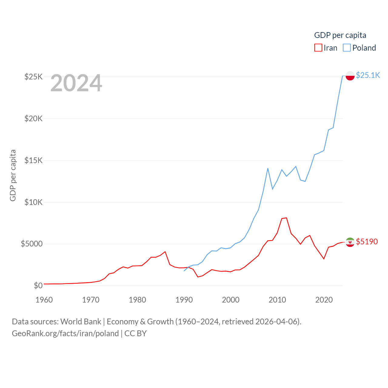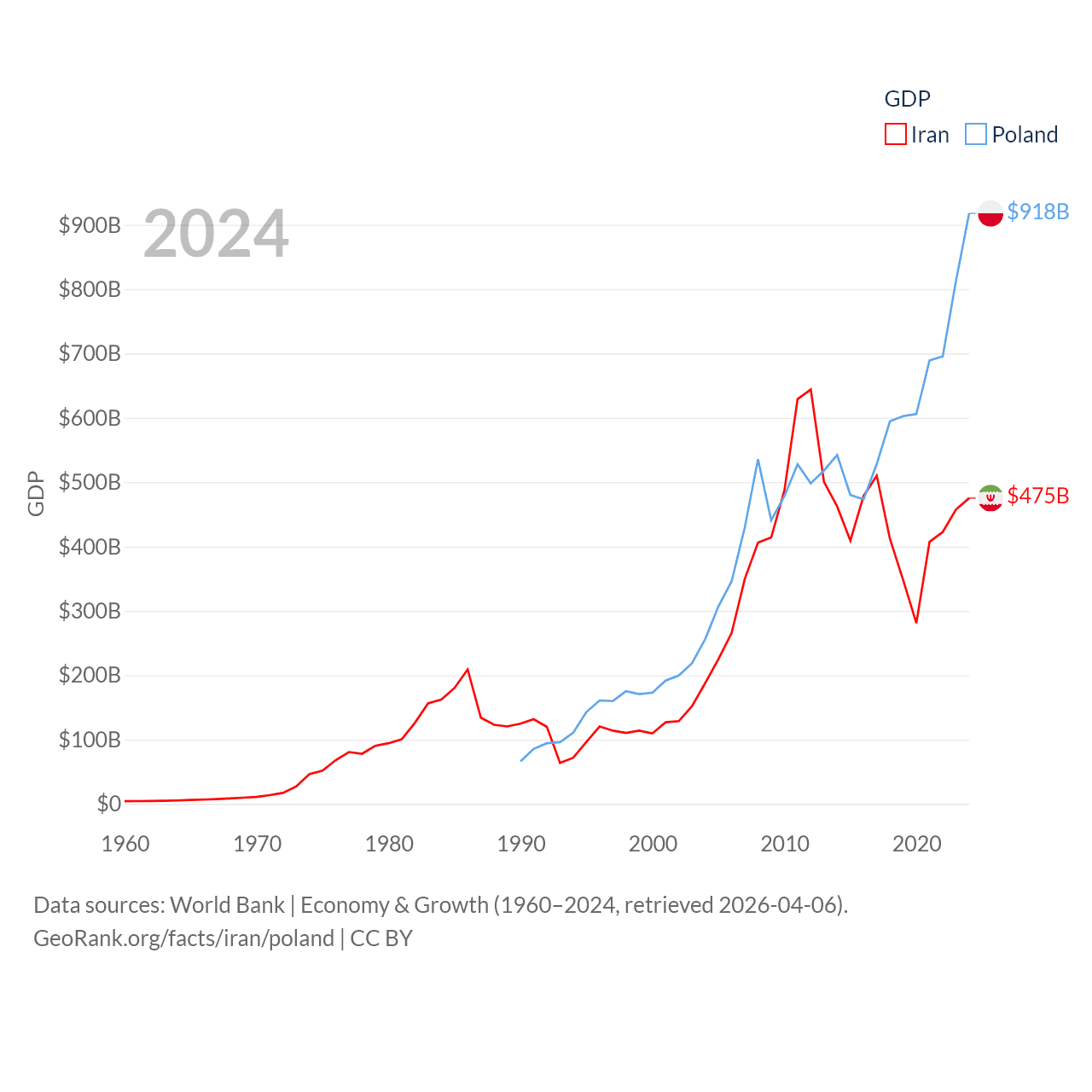 By GDP, Iran ranks 34/197 ($475B) and Poland ranks 21/197 ($918B). By GDP per capita, Iran ranks 119/197 ($5,190), while Poland ranks 48/197 ($25,104).
