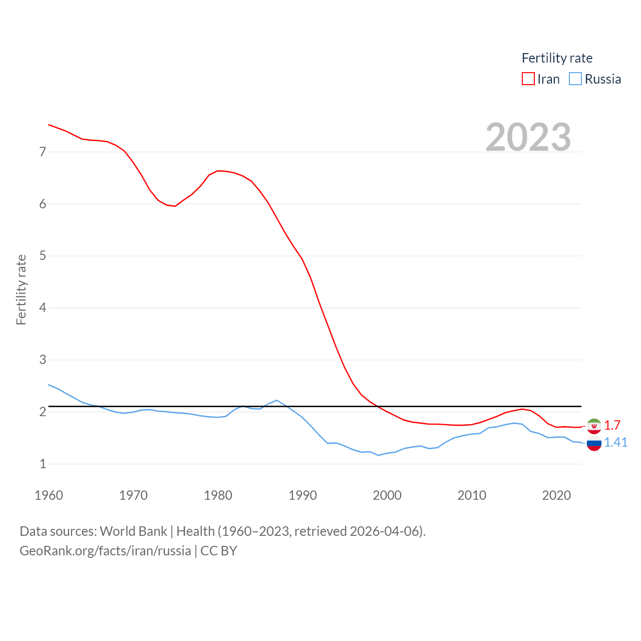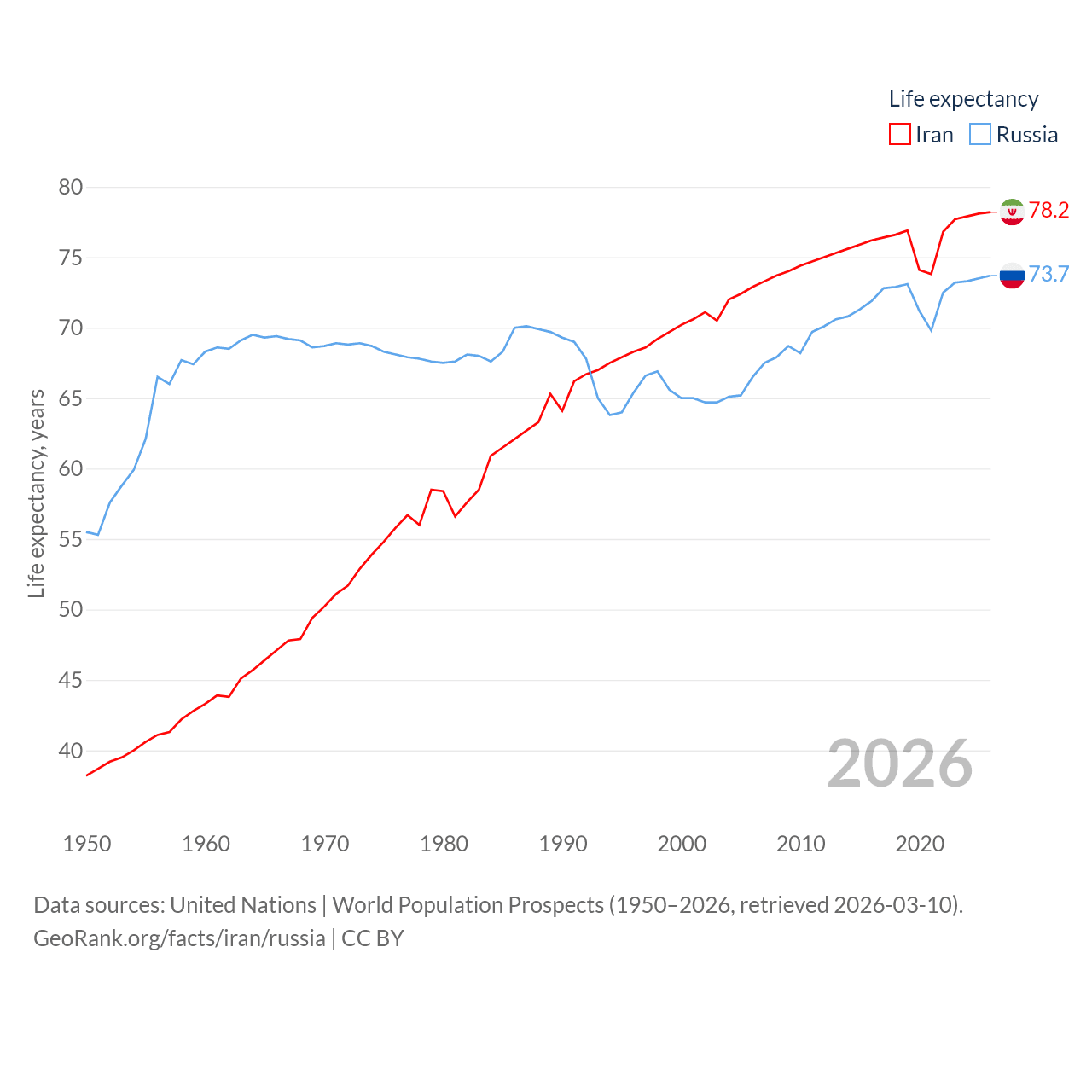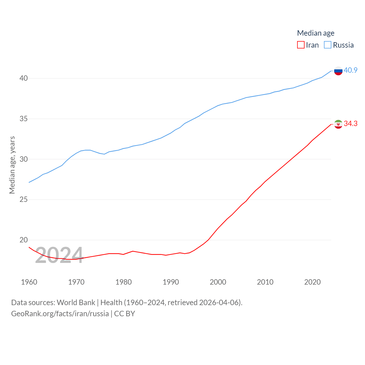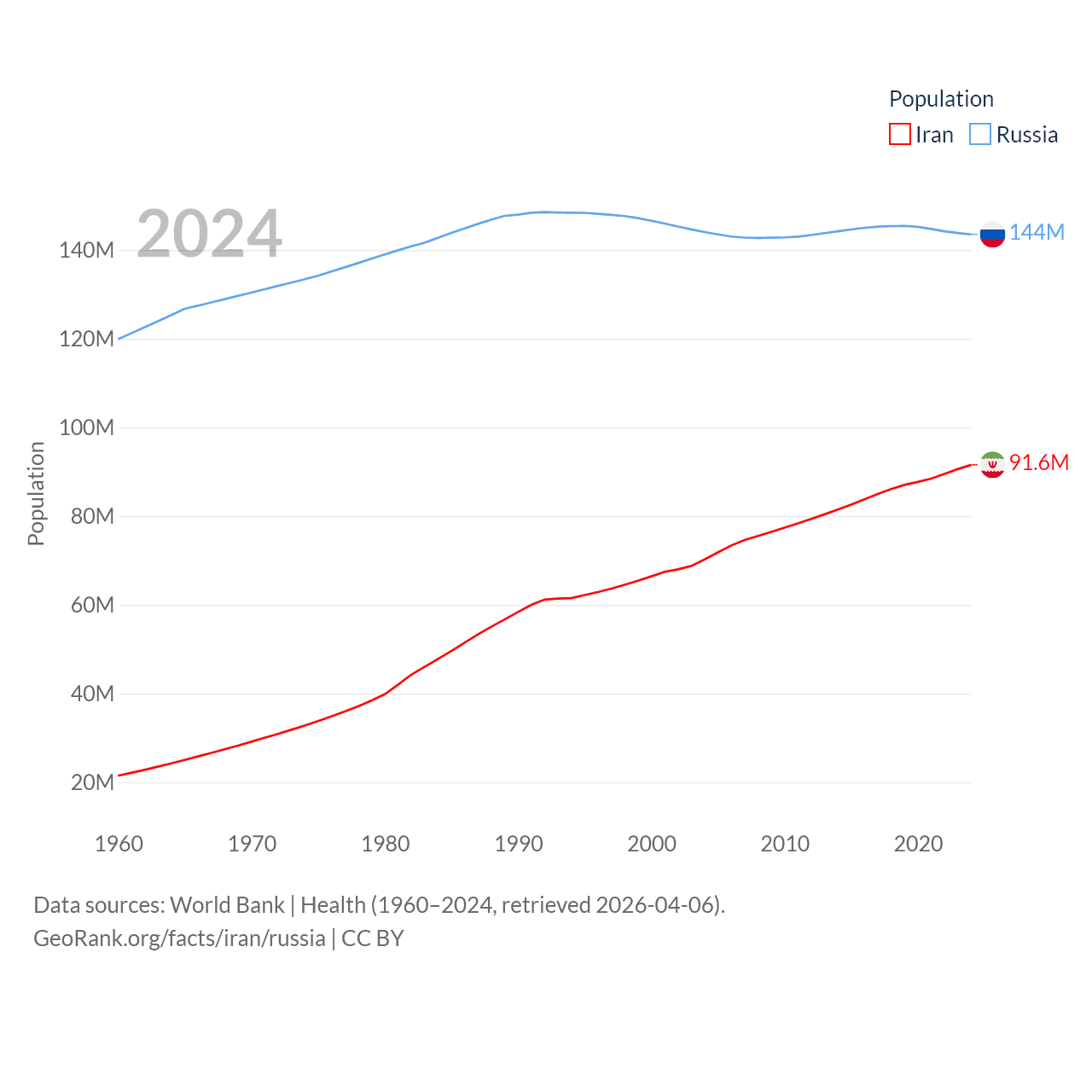 Iran has a population of 91.6M (ranked 17/197), compared with 144M in Russia (ranked 9/197). Iran's land area is 626,451 sq mi versus 6,323,145 sq mi for Russia (ranked 17th vs. 1st).