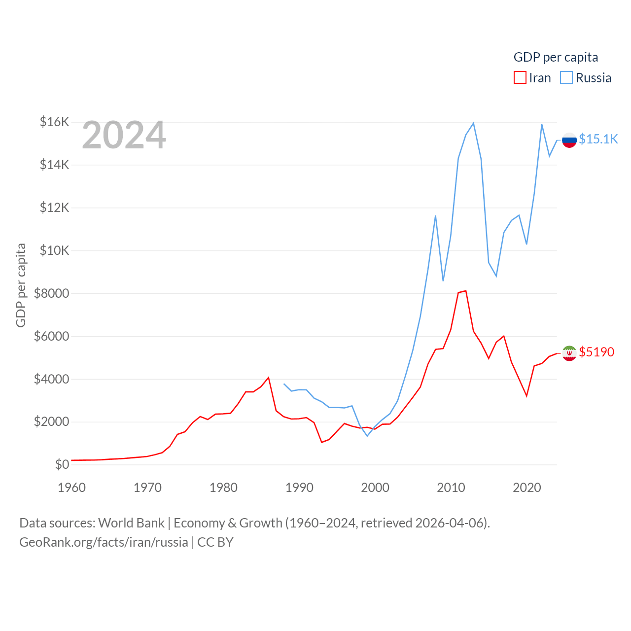 By GDP, Iran ranks 34/197 ($475B) and Russia ranks 11/197 ($2.17T). By GDP per capita, Iran ranks 119/197 ($5,190), while Russia ranks 68/197 ($15,145).
