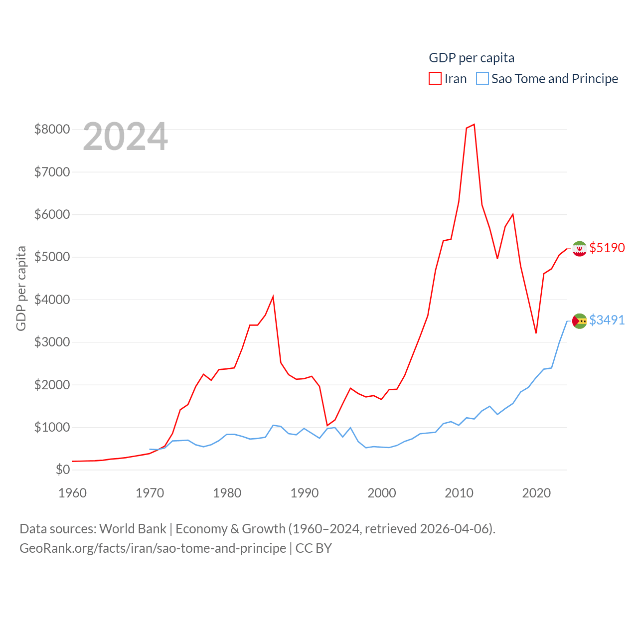 By GDP, Iran ranks 34/197 ($475B) and Sao Tome and Principe ranks 189/197 ($822M). By GDP per capita, Iran ranks 119/197 ($5,190), while Sao Tome and Principe ranks 134/197 ($3,491).