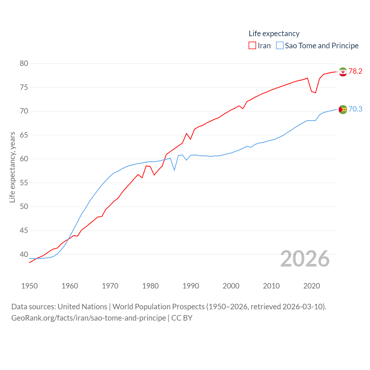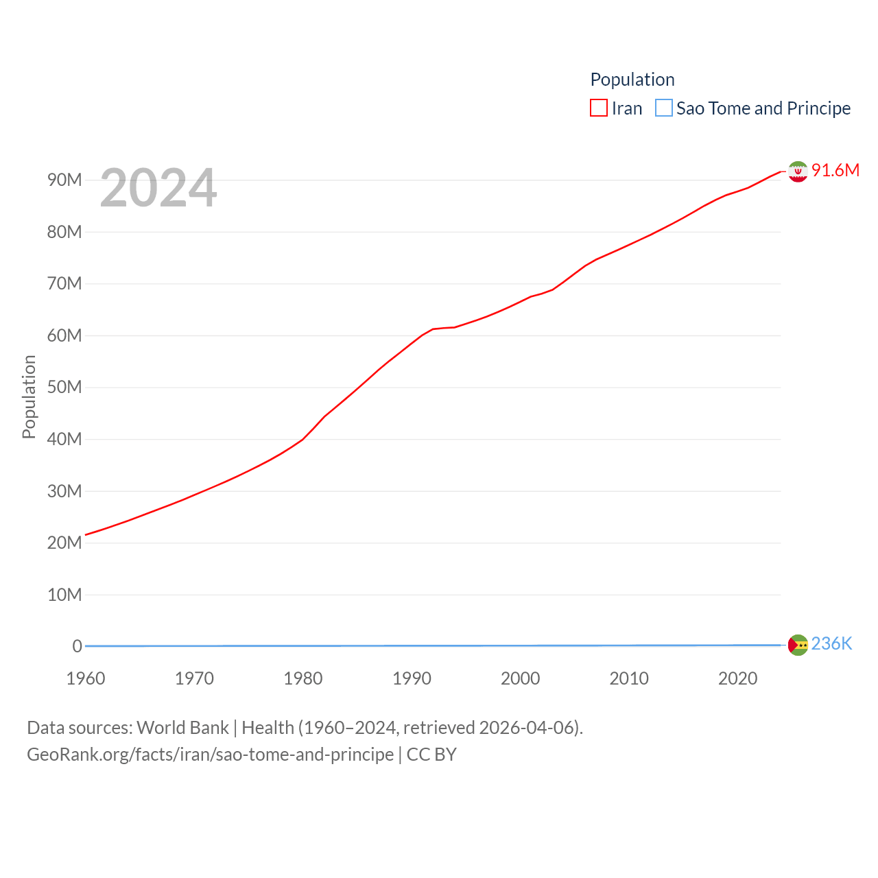 Iran has a population of 91.6M (ranked 17/197), compared with 236K in Sao Tome and Principe (ranked 176/197). Iran's land area is 626,451 sq mi versus 371 sq mi for Sao Tome and Principe (ranked 17th vs. 172nd).