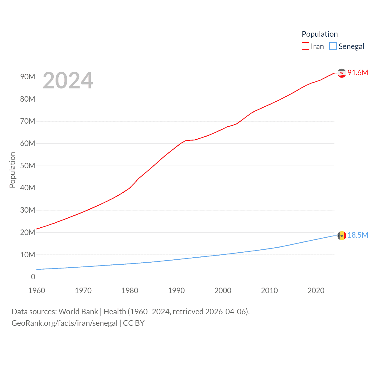 Iran has a population of 91.6M (ranked 17/197), compared with 18.5M in Senegal (ranked 69/197). Iran's land area is 626,451 sq mi versus 74,336 sq mi for Senegal (ranked 17th vs. 85th).
