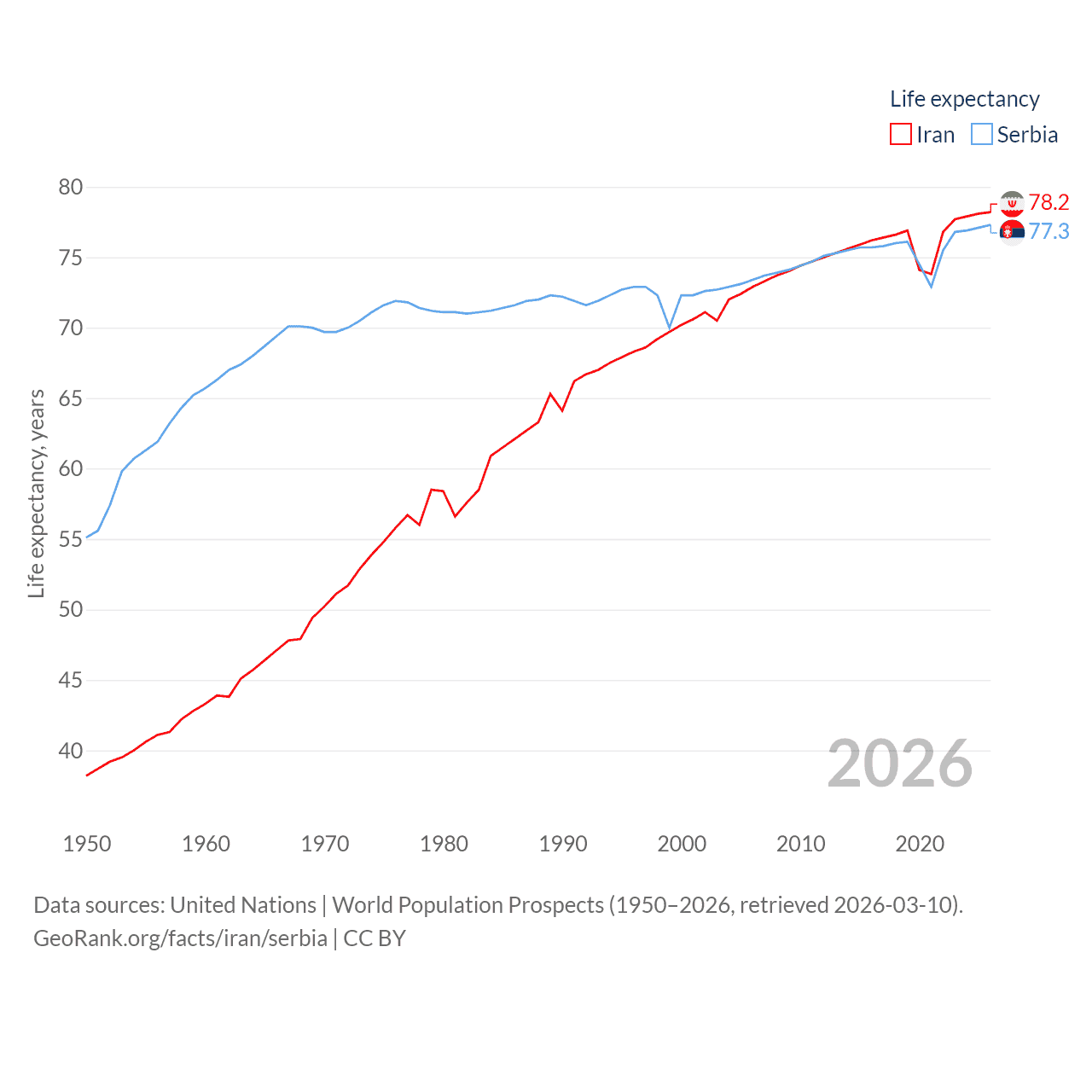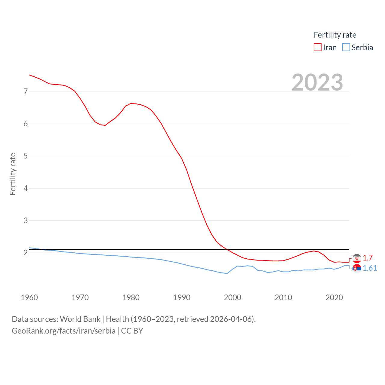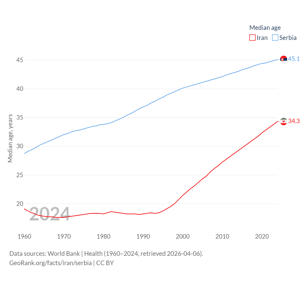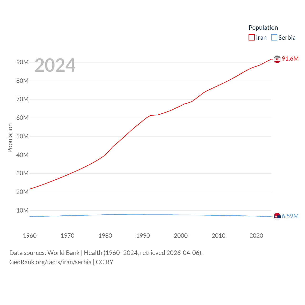 Iran has a population of 91.6M (ranked 17/197), compared with 6.59M in Serbia (ranked 109/197). Iran's land area is 626,451 sq mi versus 32,467 sq mi for Serbia (ranked 17th vs. 111th).