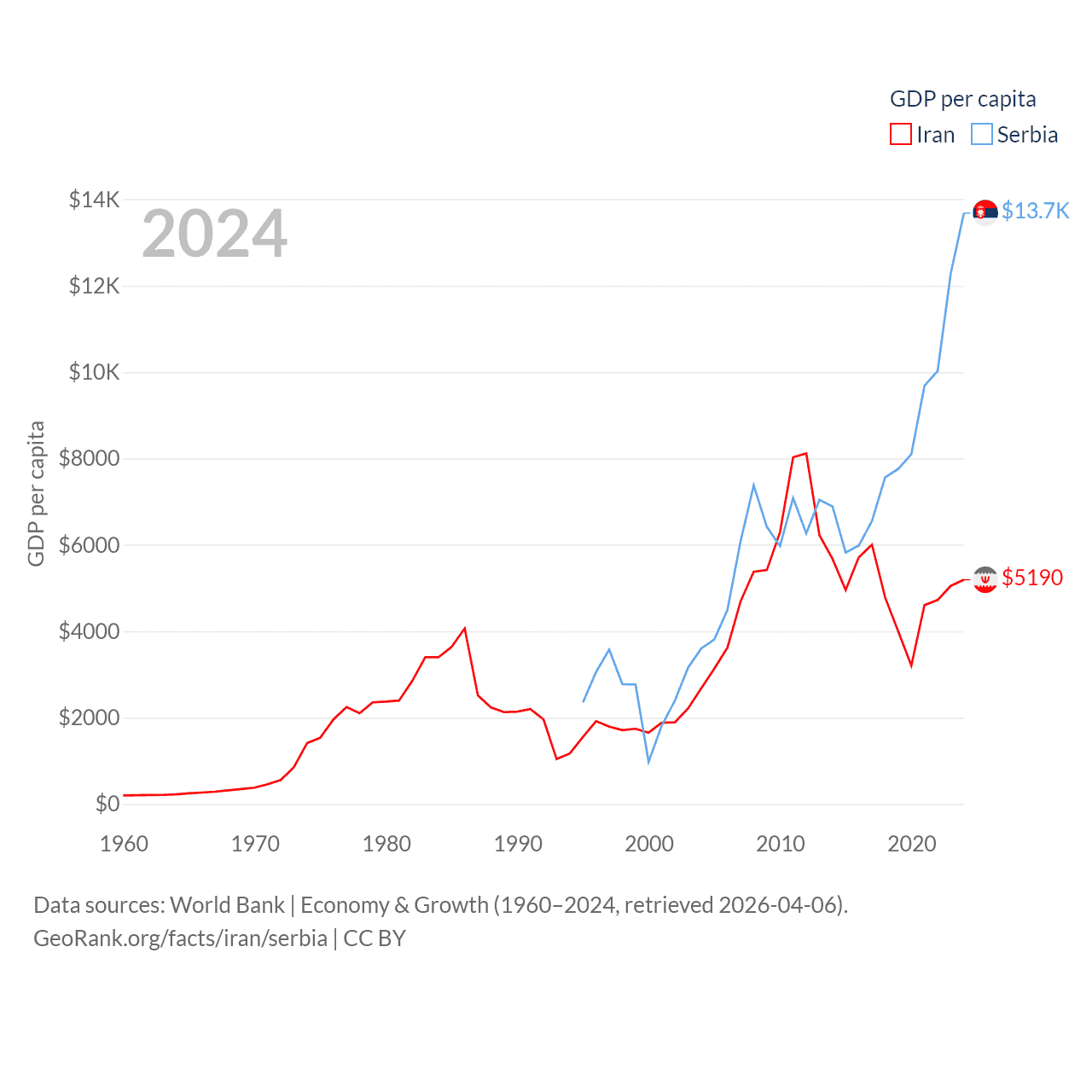 By GDP, Iran ranks 34/197 ($475B) and Serbia ranks 76/197 ($90.1B). By GDP per capita, Iran ranks 119/197 ($5,190), while Serbia ranks 73/197 ($13,679).