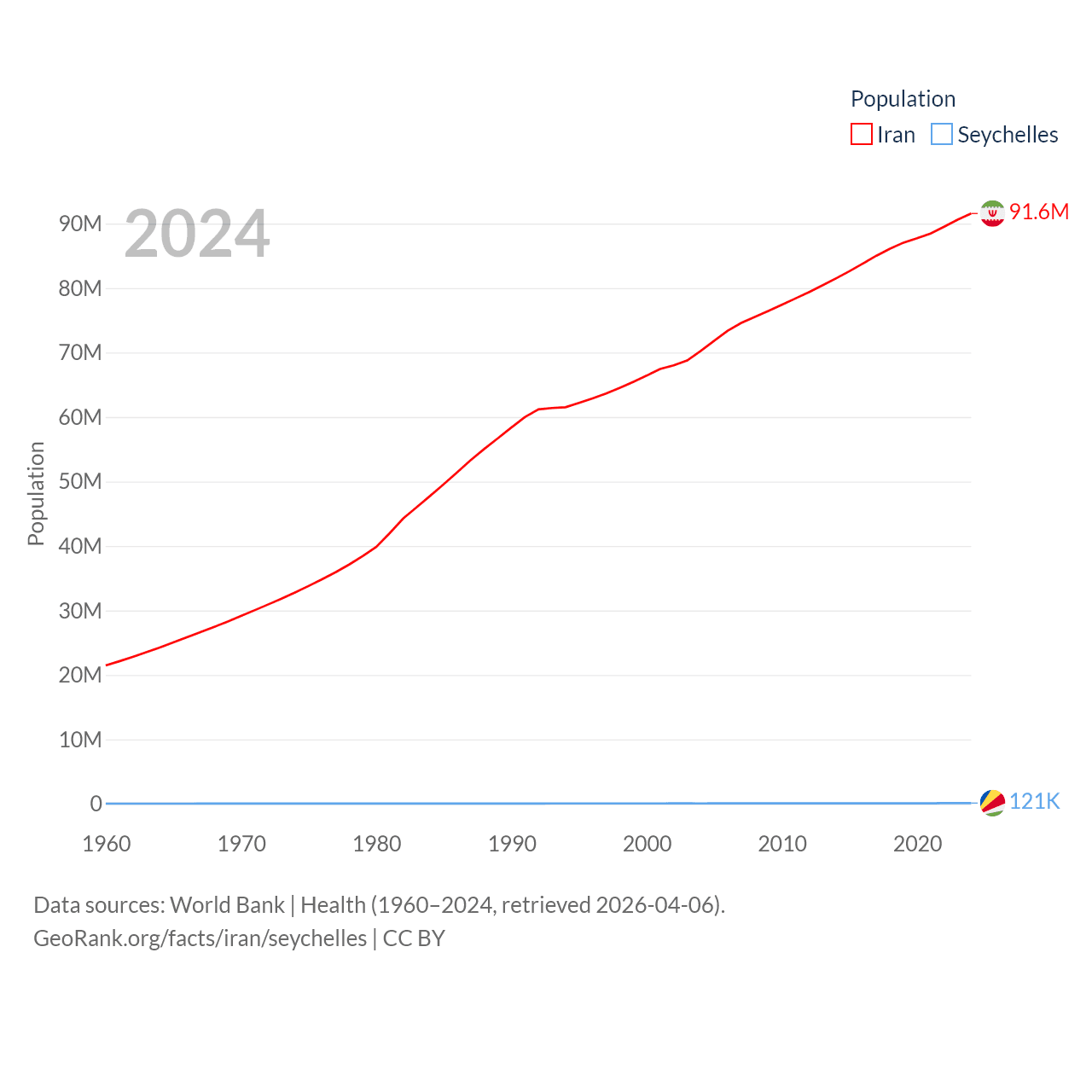 Iran has a population of 91.6M (ranked 17/197), compared with 121K in The Seychelles (ranked 181/197). Iran's land area is 626,451 sq mi versus 177.6 sq mi for The Seychelles (ranked 17th vs. 181st).