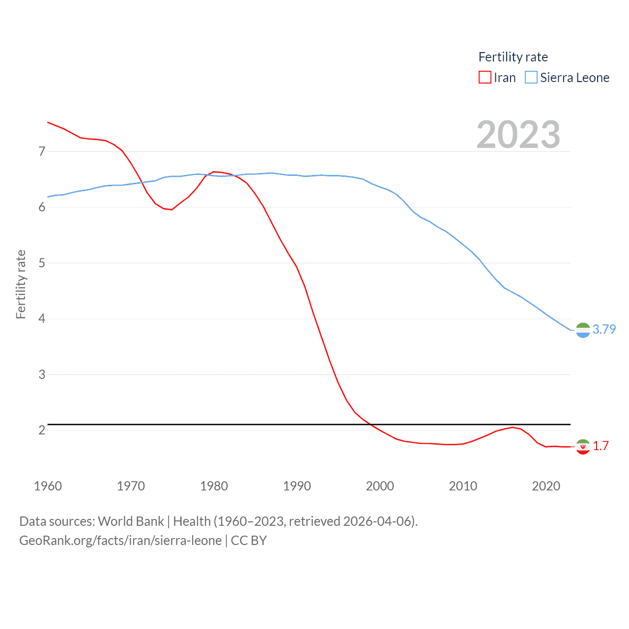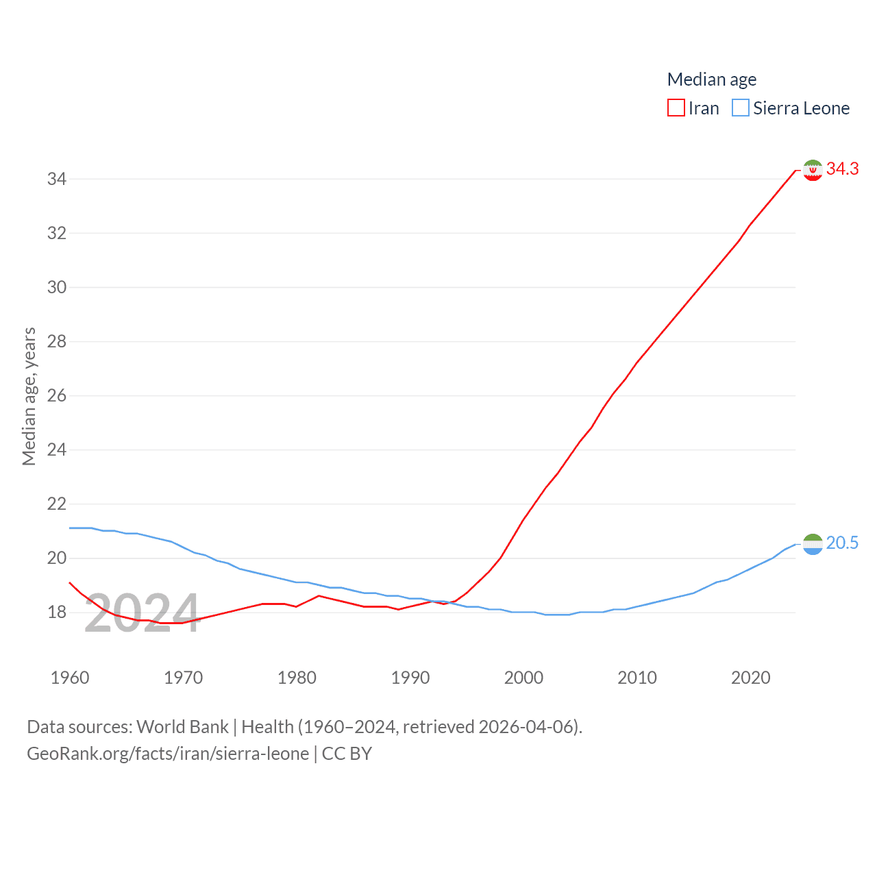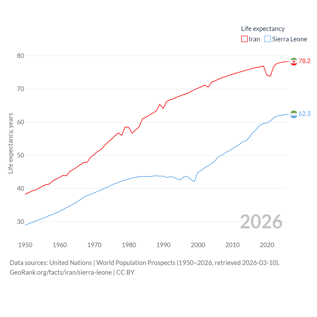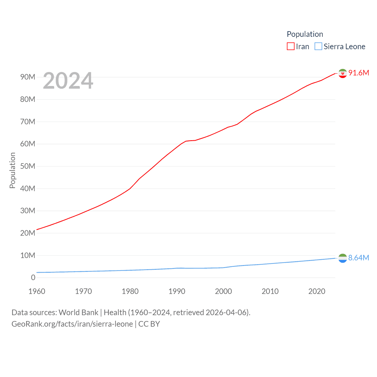 Iran has a population of 91.6M (ranked 17/197), compared with 8.64M in Sierra Leone (ranked 102/197). Iran's land area is 626,451 sq mi versus 27,869 sq mi for Sierra Leone (ranked 17th vs. 116th).