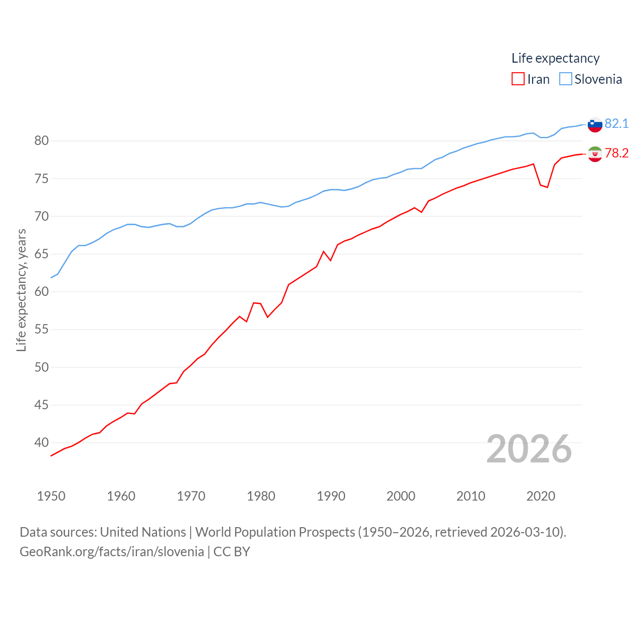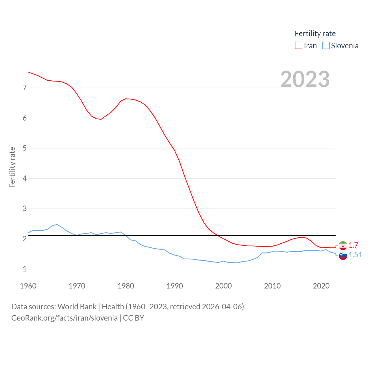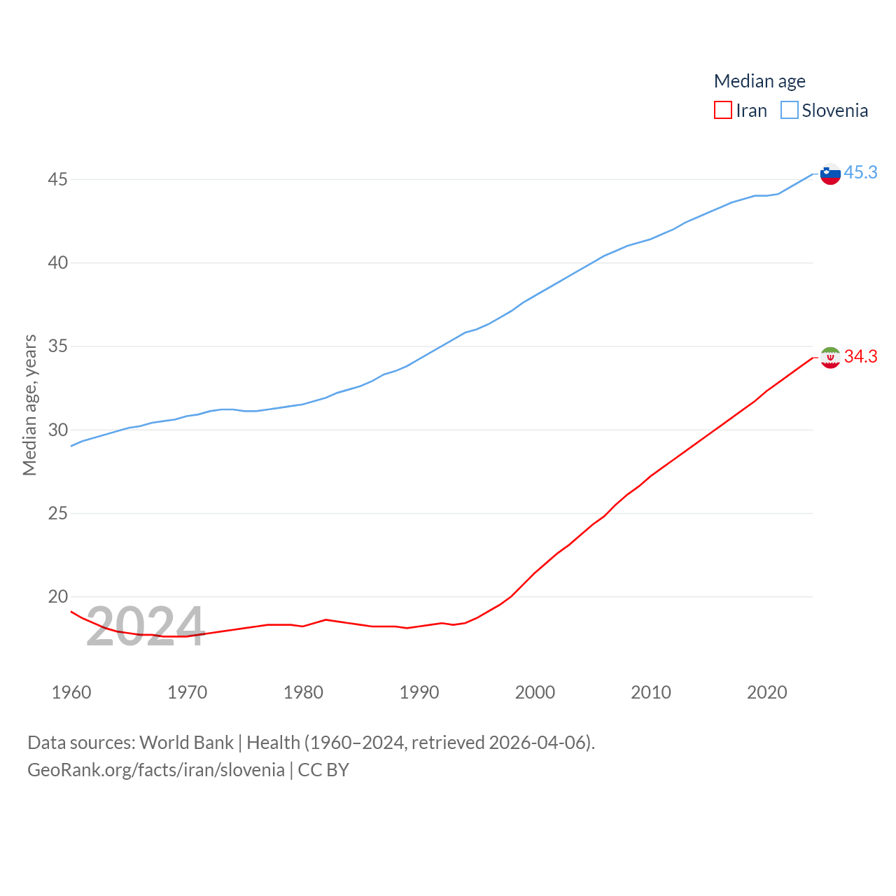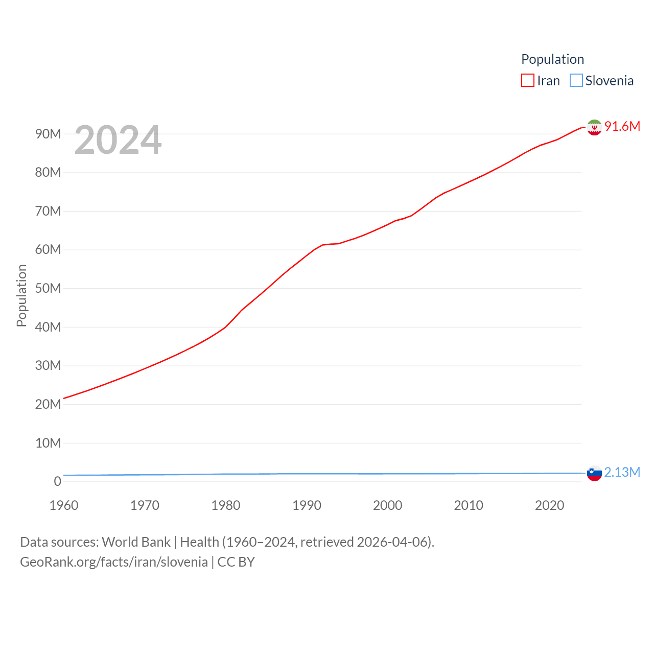 Iran has a population of 91.6M (ranked 17/197), compared with 2.13M in Slovenia (ranked 147/197). Iran's land area is 626,451 sq mi versus 7,774 sq mi for Slovenia (ranked 17th vs. 151st).