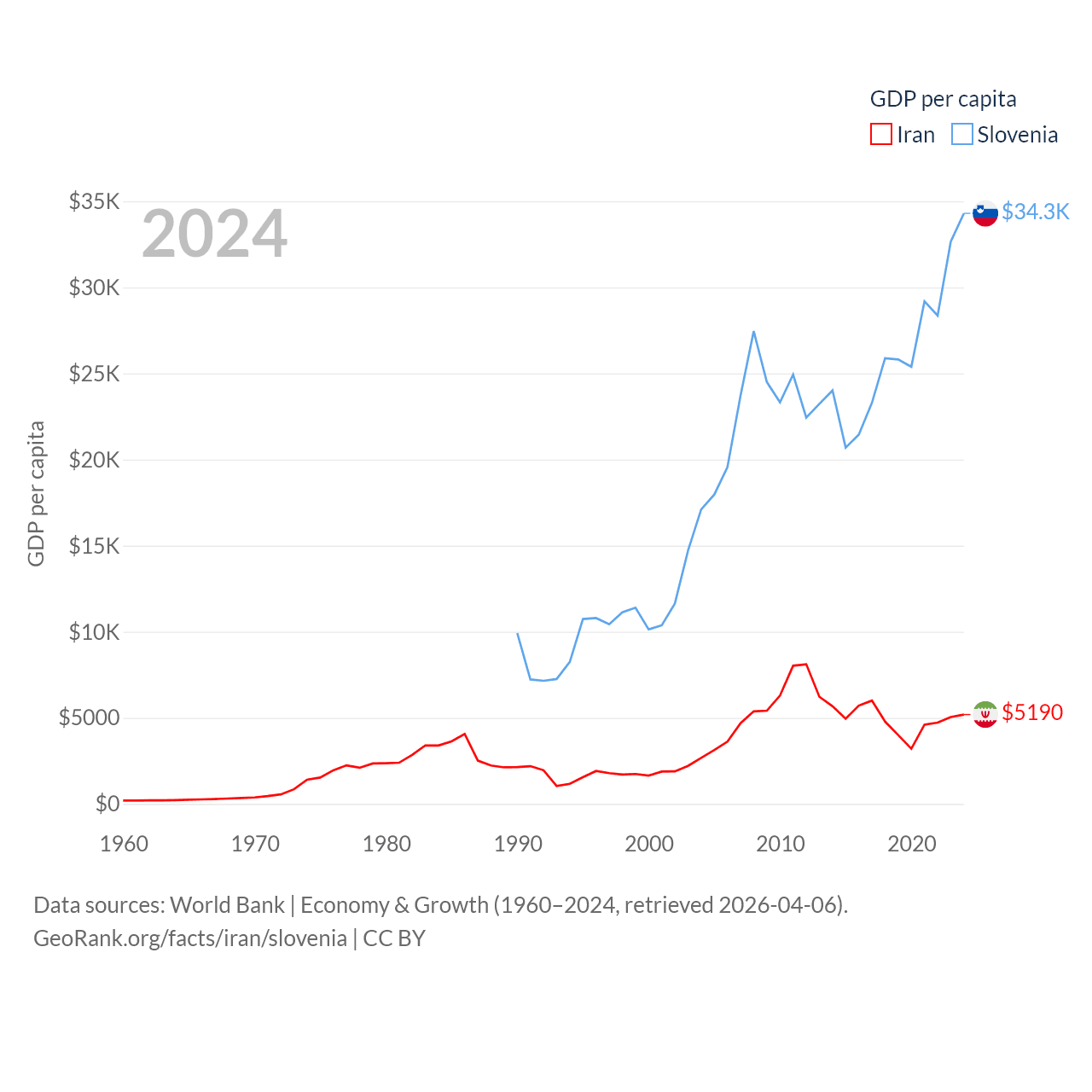 By GDP, Iran ranks 34/197 ($475B) and Slovenia ranks 86/197 ($73B). By GDP per capita, Iran ranks 119/197 ($5,190), while Slovenia ranks 34/197 ($34,301).