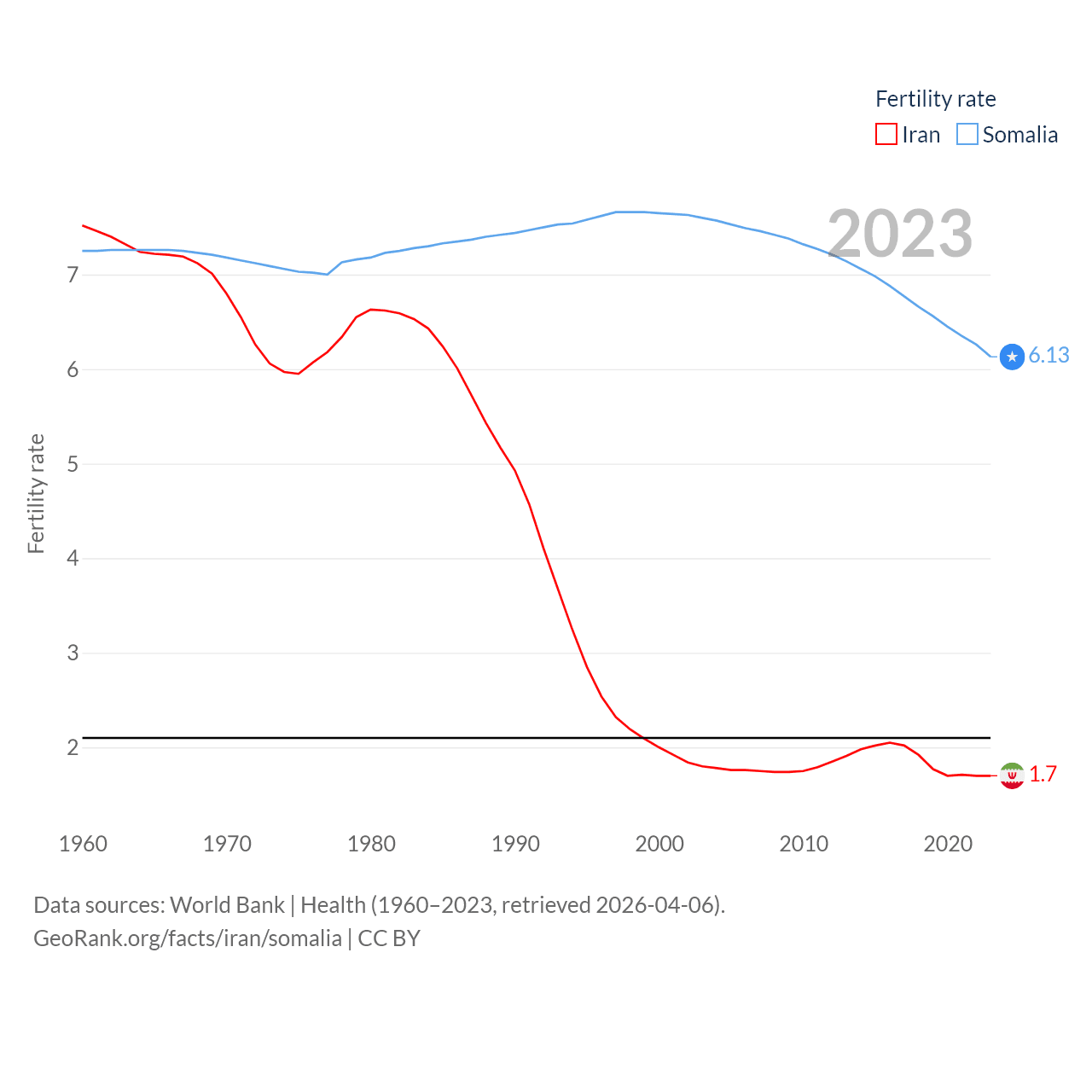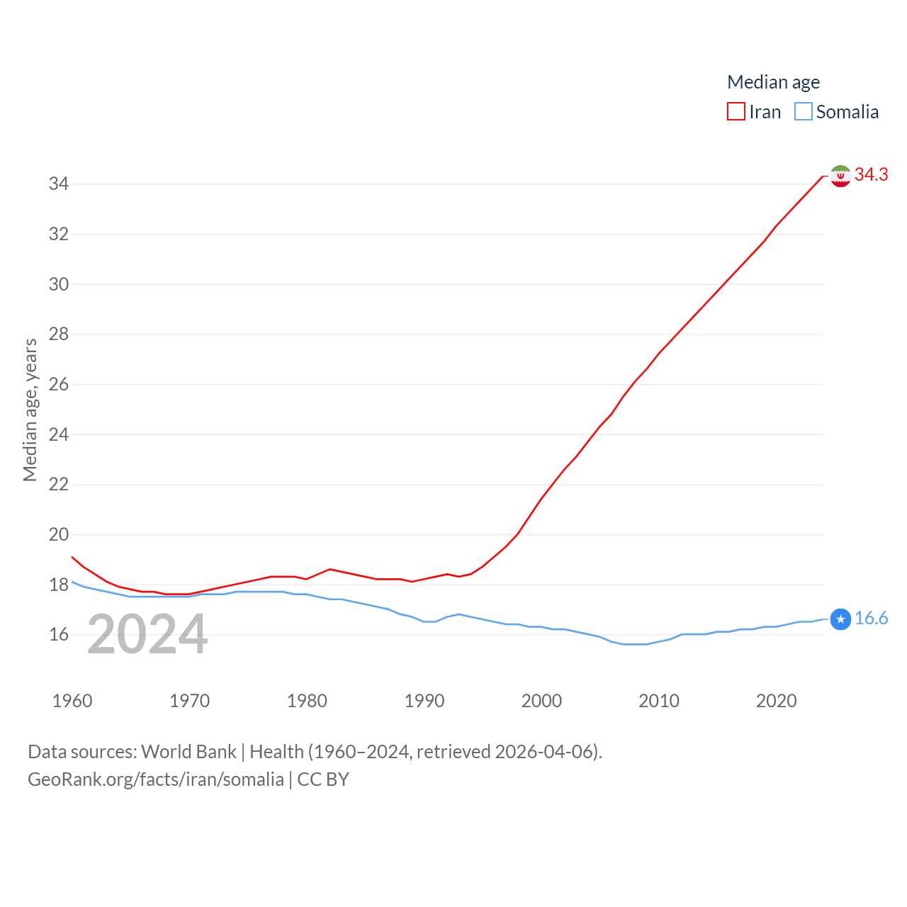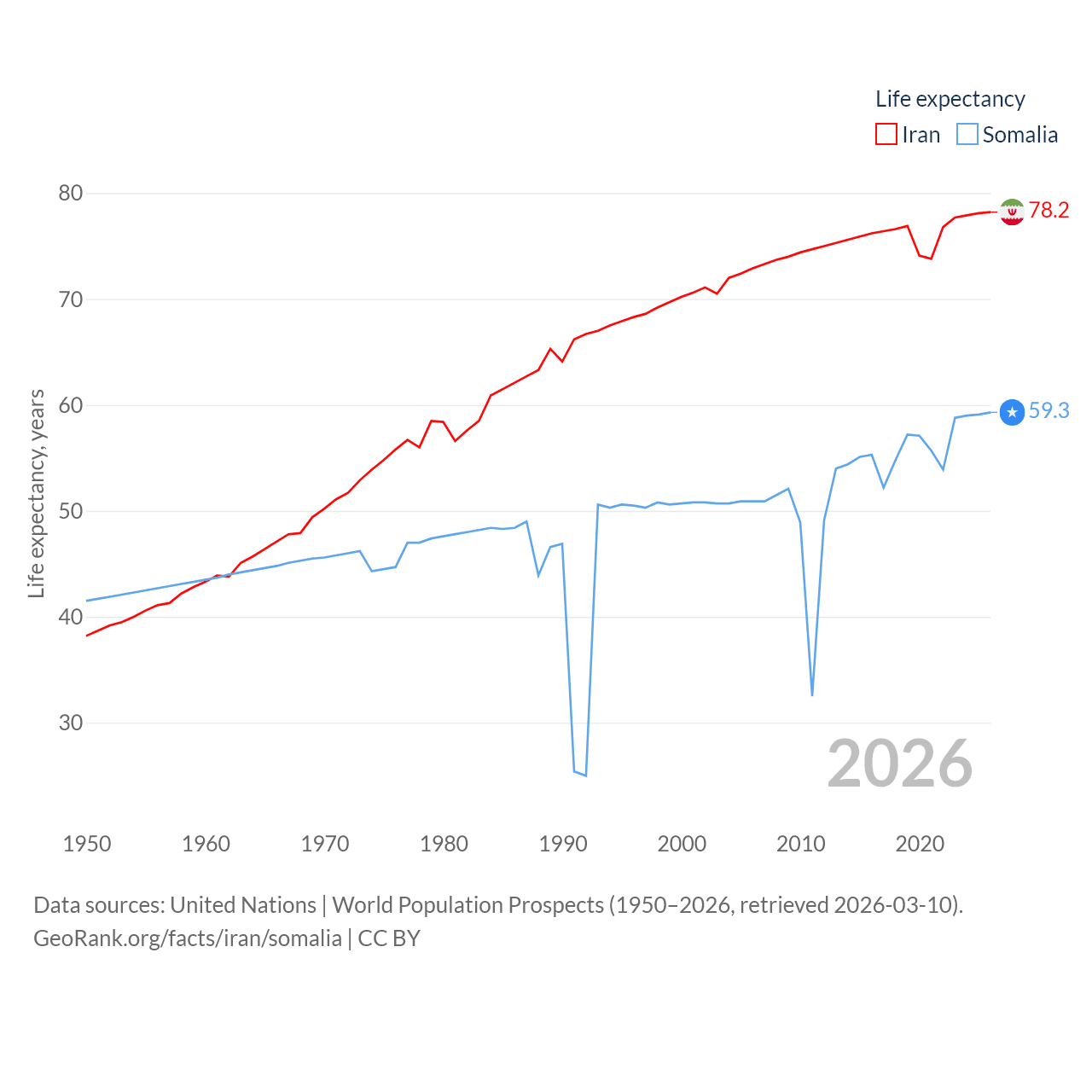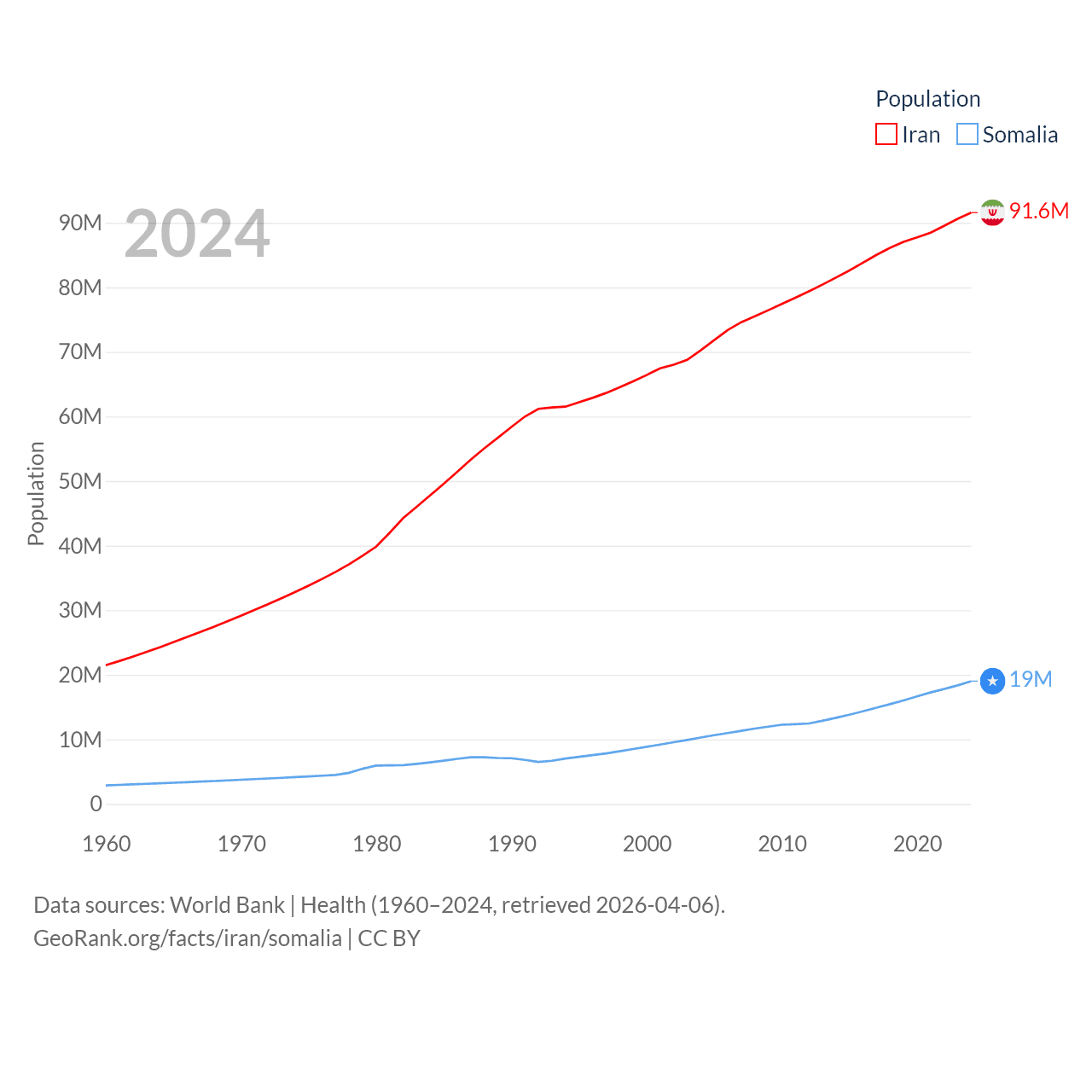 Iran has a population of 91.6M (ranked 17/197), compared with 19M in Somalia (ranked 68/197). Iran's land area is 626,451 sq mi versus 242,217 sq mi for Somalia (ranked 17th vs. 42nd).