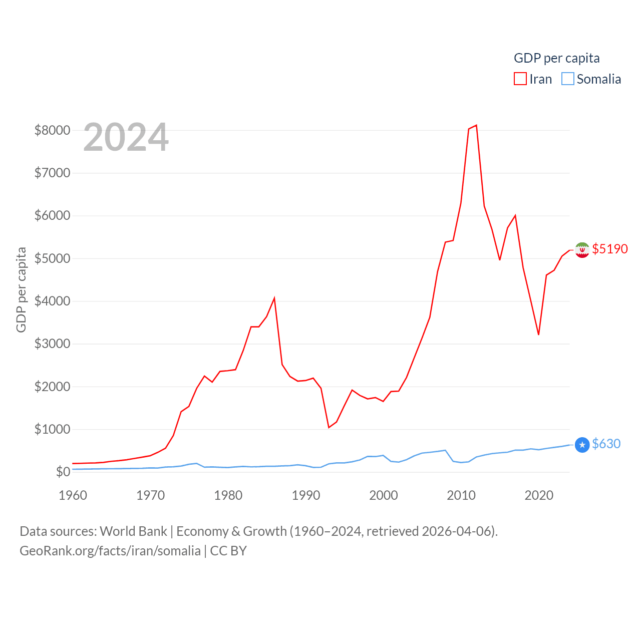 By GDP, Iran ranks 34/197 ($475B) and Somalia ranks 150/197 ($12B). By GDP per capita, Iran ranks 119/197 ($5,190), while Somalia ranks 192/197 ($630).
