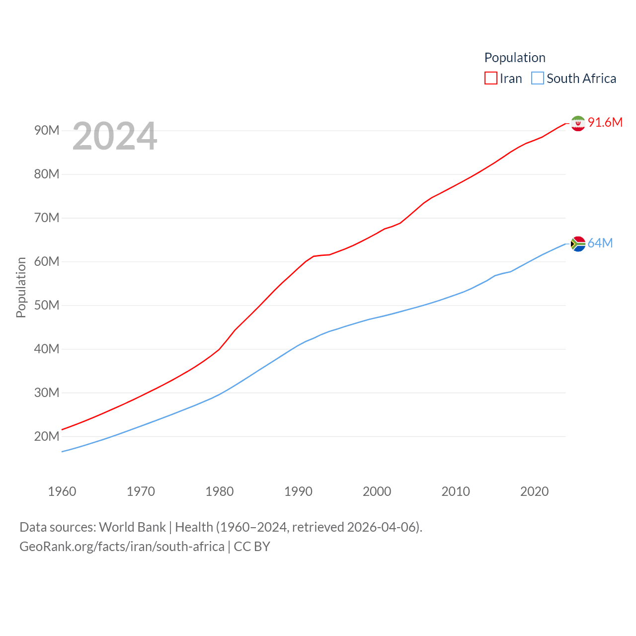 Iran has a population of 91.6M (ranked 17/197), compared with 64M in South Africa (ranked 24/197). Iran's land area is 626,451 sq mi versus 468,377 sq mi for South Africa (ranked 17th vs. 24th).