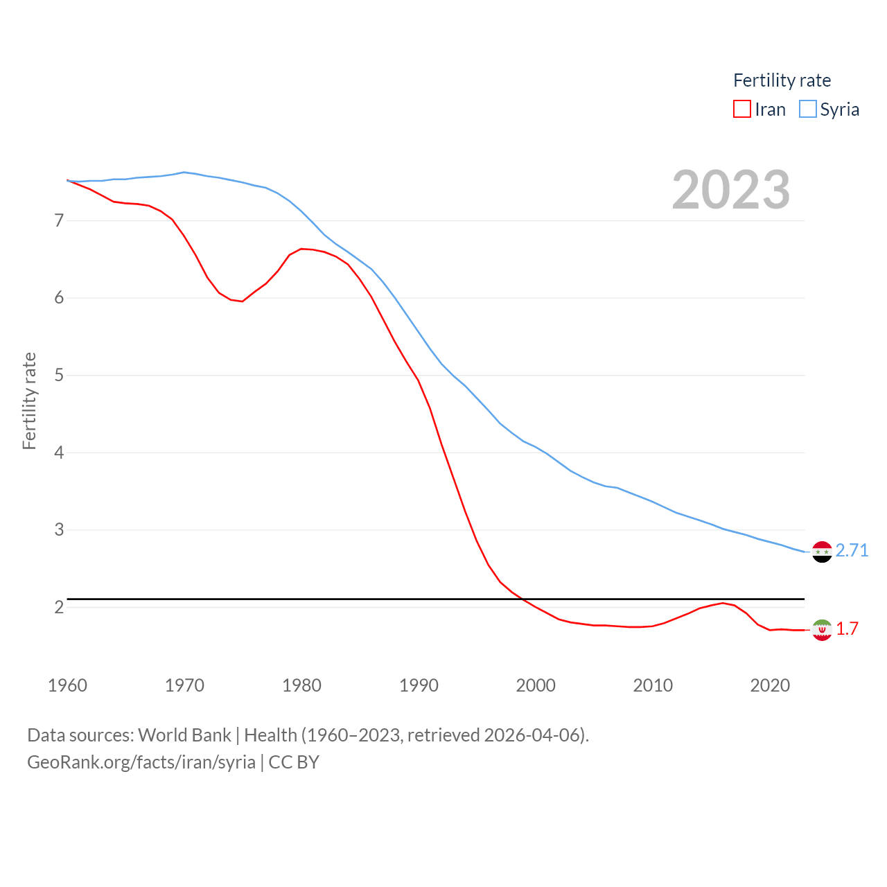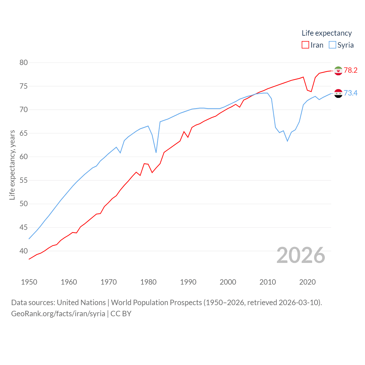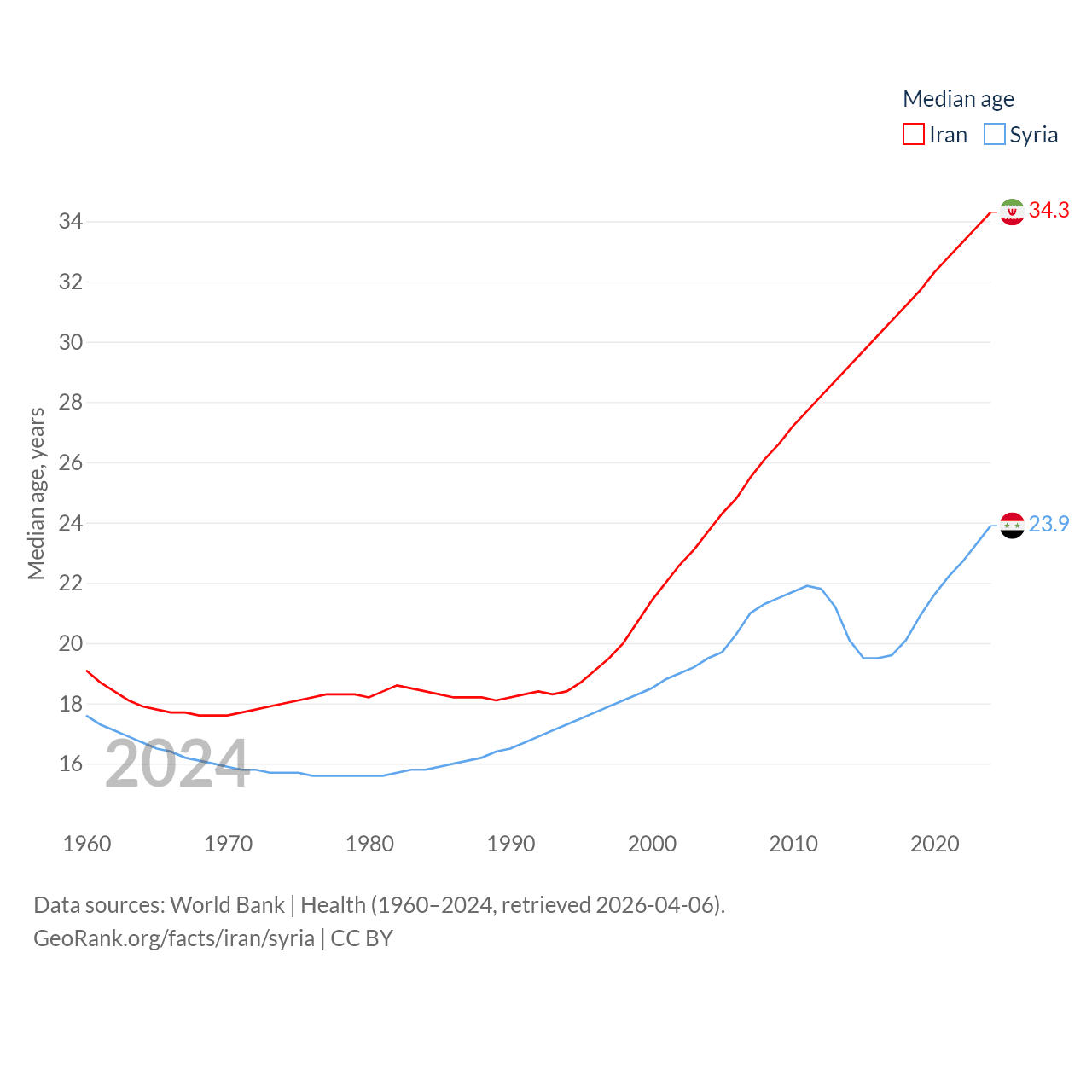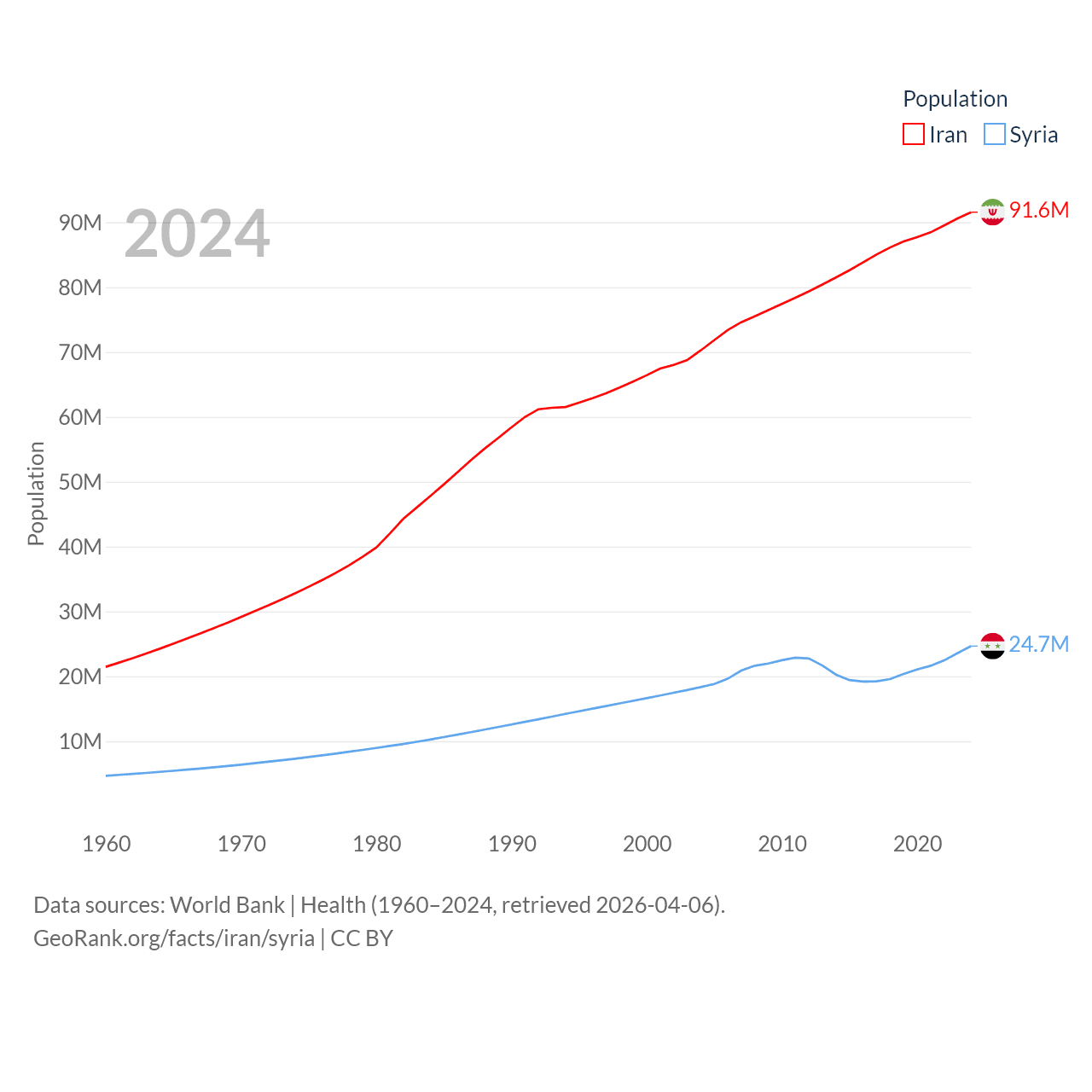 Iran has a population of 91.6M (ranked 17/197), compared with 24.7M in Syria (ranked 57/197). Iran's land area is 626,451 sq mi versus 70,900 sq mi for Syria (ranked 17th vs. 87th).
