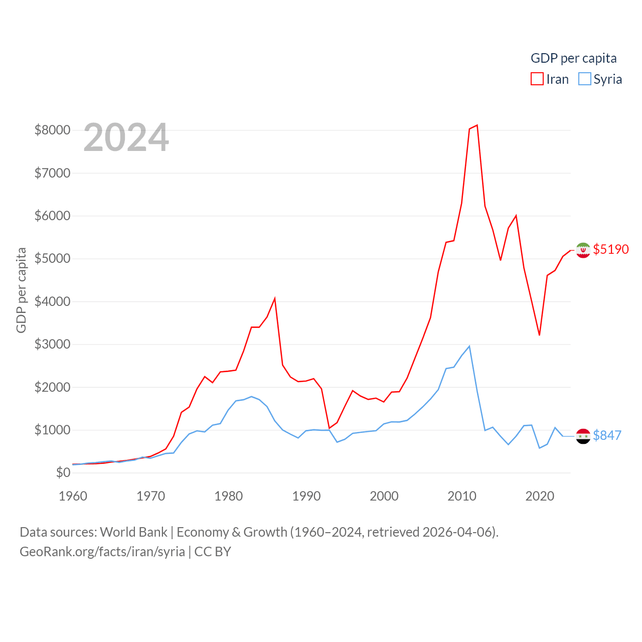 By GDP, Iran ranks 34/197 ($475B) and Syria ranks 129/197 ($20B). By GDP per capita, Iran ranks 119/197 ($5,190), while Syria ranks 185/197 ($847).