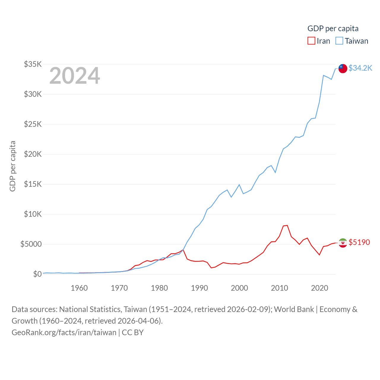 By GDP, Iran ranks 34/197 ($475B) and Taiwan ranks 22/197 ($802B). By GDP per capita, Iran ranks 119/197 ($5,190), while Taiwan ranks 35/197 ($34,238).