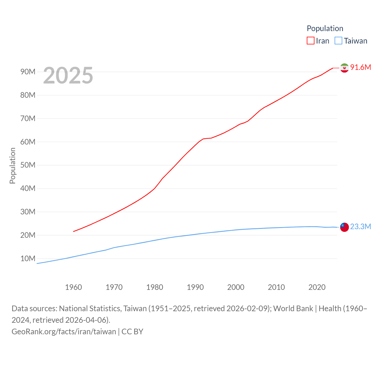 Iran has a population of 91.6M (ranked 17/197), compared with 23.3M in Taiwan (ranked 60/197). Iran's land area is 626,451 sq mi versus 13,976 sq mi for Taiwan (ranked 17th vs. 133rd).