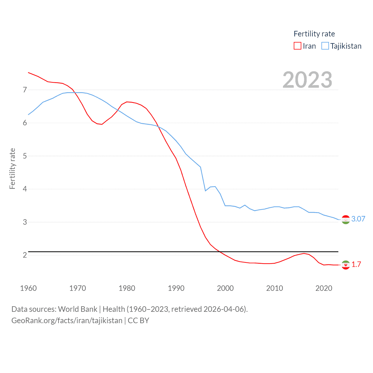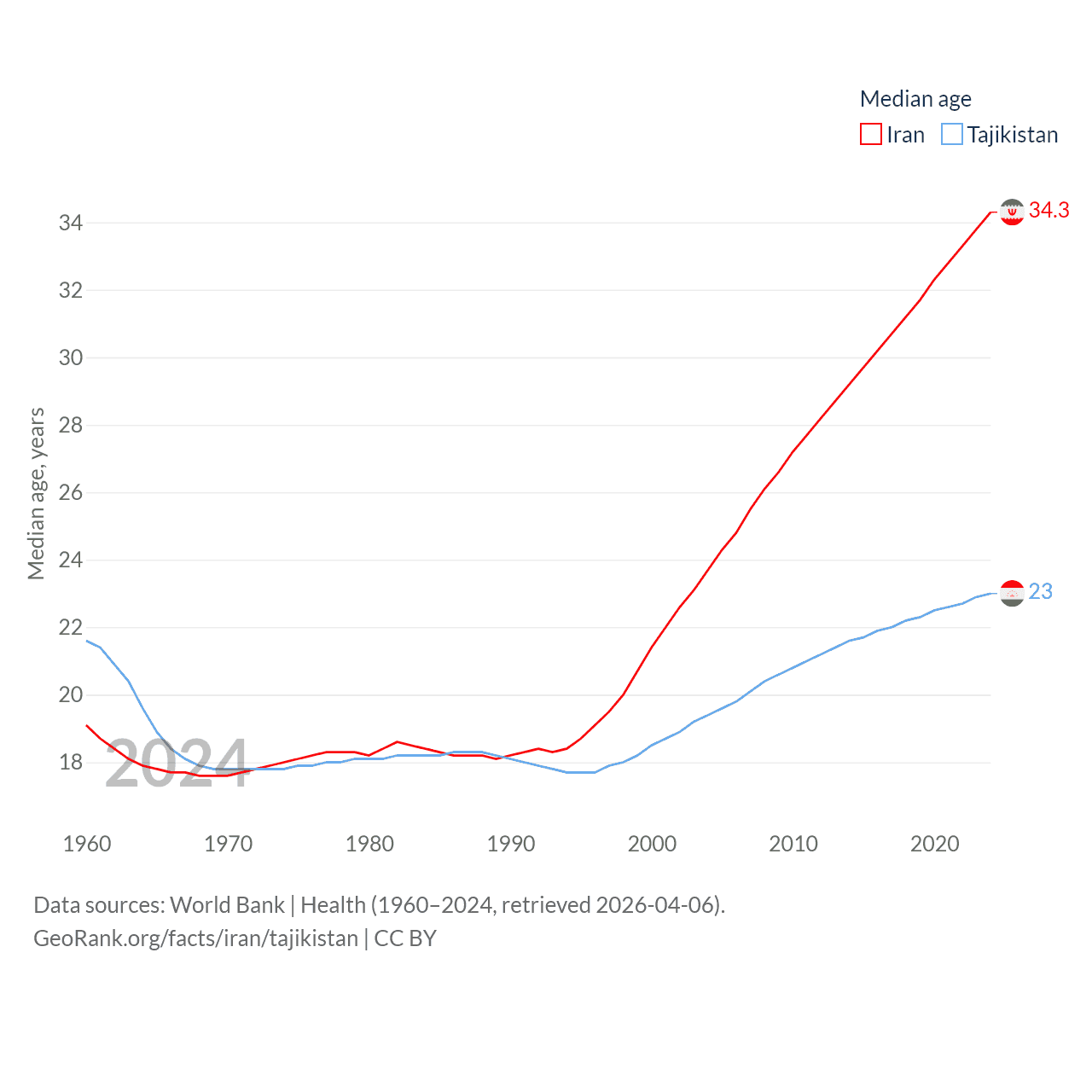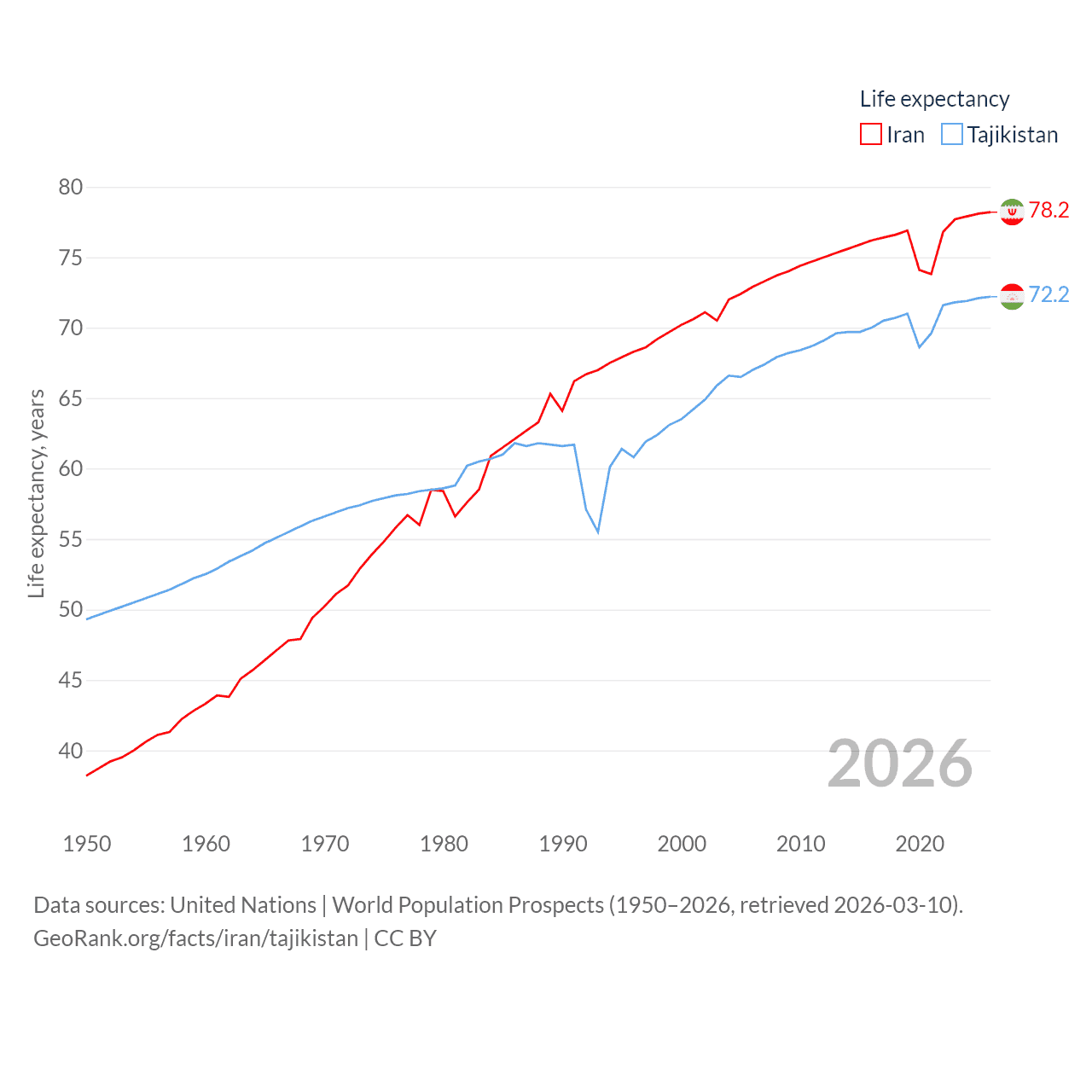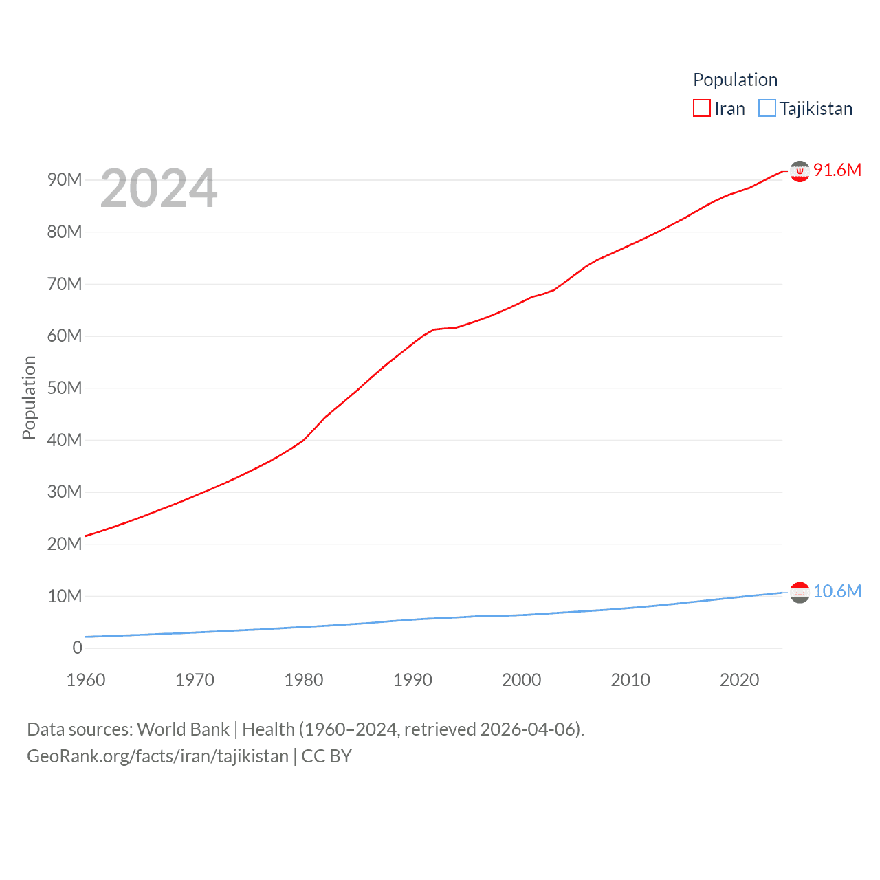 Iran has a population of 91.6M (ranked 17/197), compared with 10.6M in Tajikistan (ranked 91/197). Iran's land area is 626,451 sq mi versus 53,587 sq mi for Tajikistan (ranked 17th vs. 93rd).
