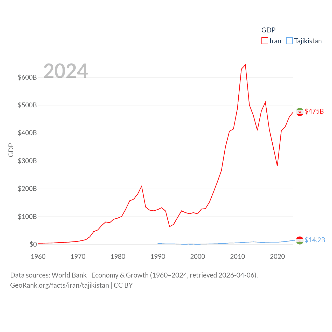 By GDP, Iran ranks 34/197 ($475B) and Tajikistan ranks 145/197 ($14.2B). By GDP per capita, Iran ranks 119/197 ($5,190), while Tajikistan ranks 166/197 ($1,341).