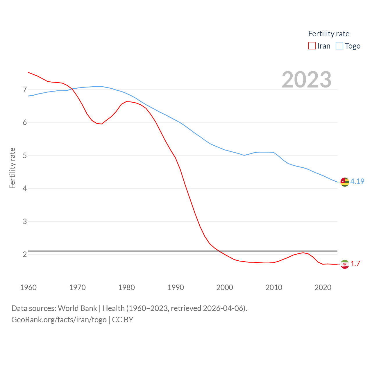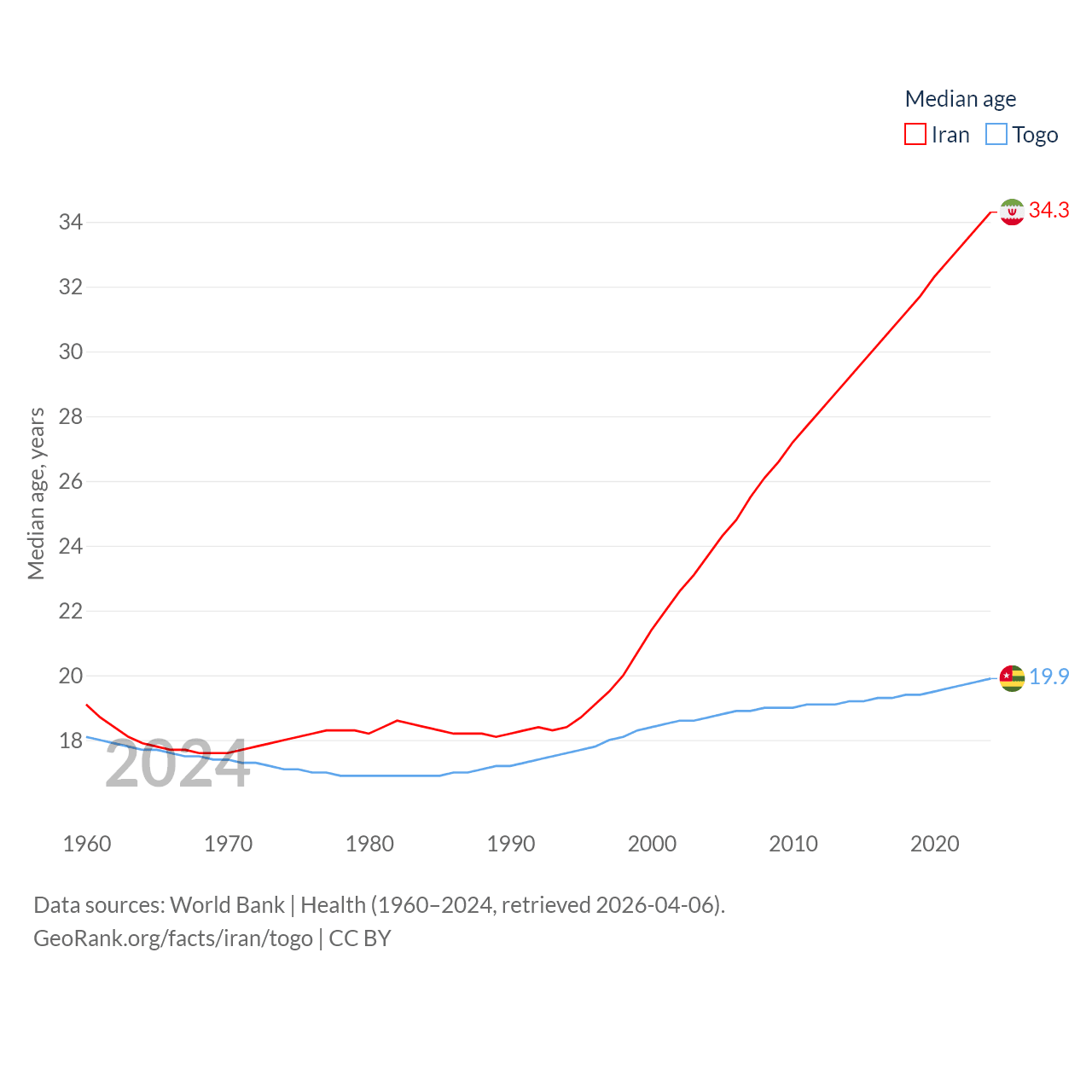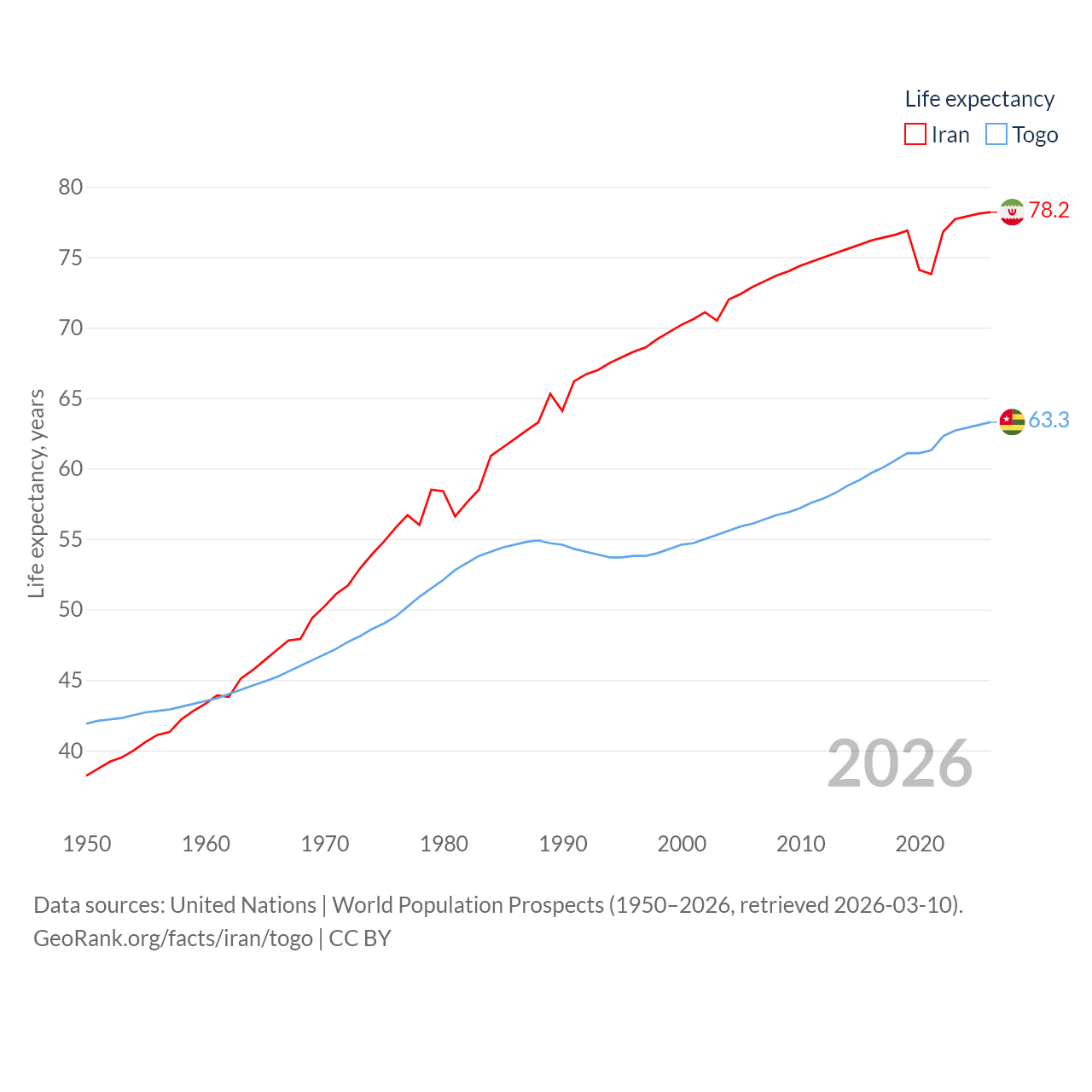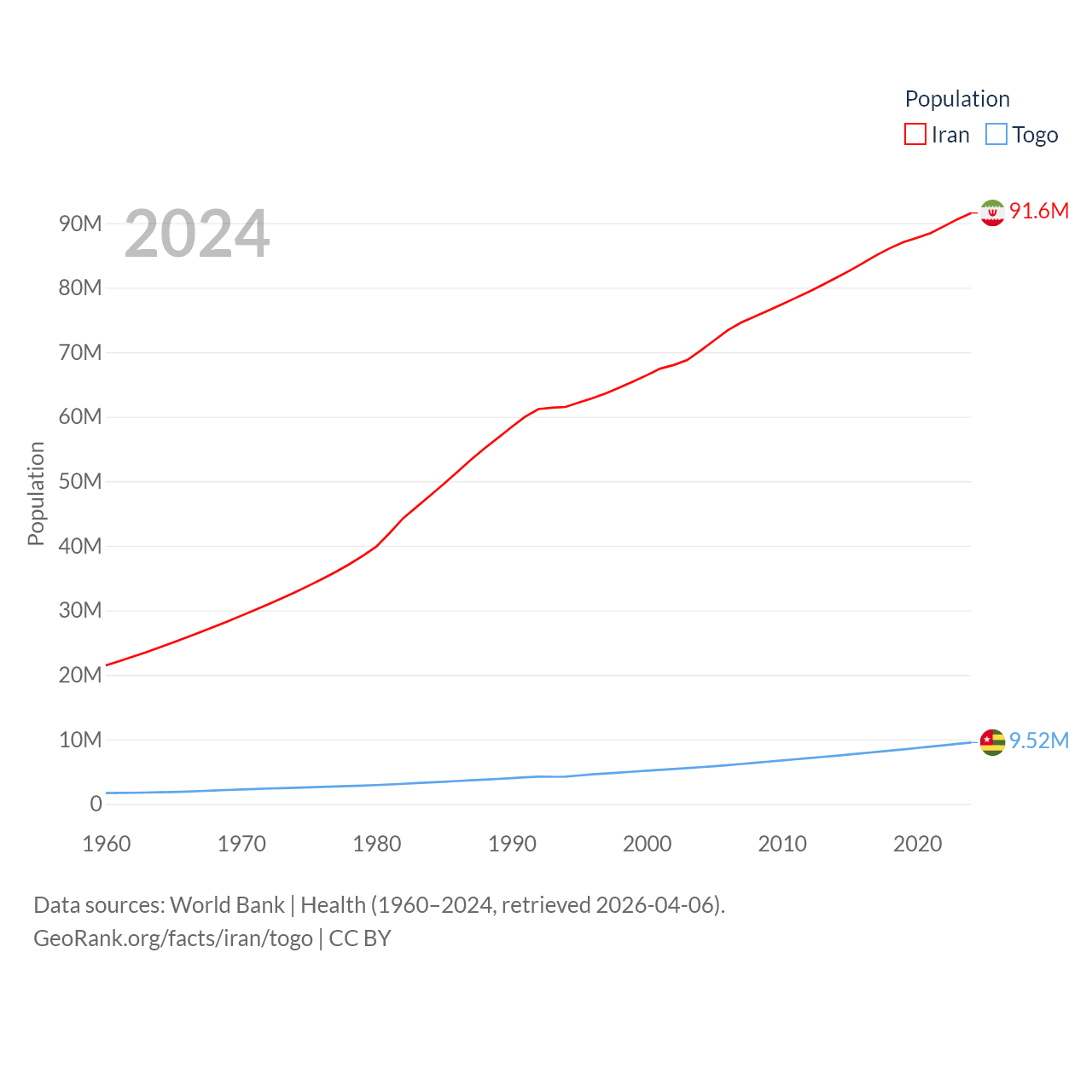 Iran has a population of 91.6M (ranked 17/197), compared with 9.52M in Togo (ranked 98/197). Iran's land area is 626,451 sq mi versus 21,000 sq mi for Togo (ranked 17th vs. 124th).