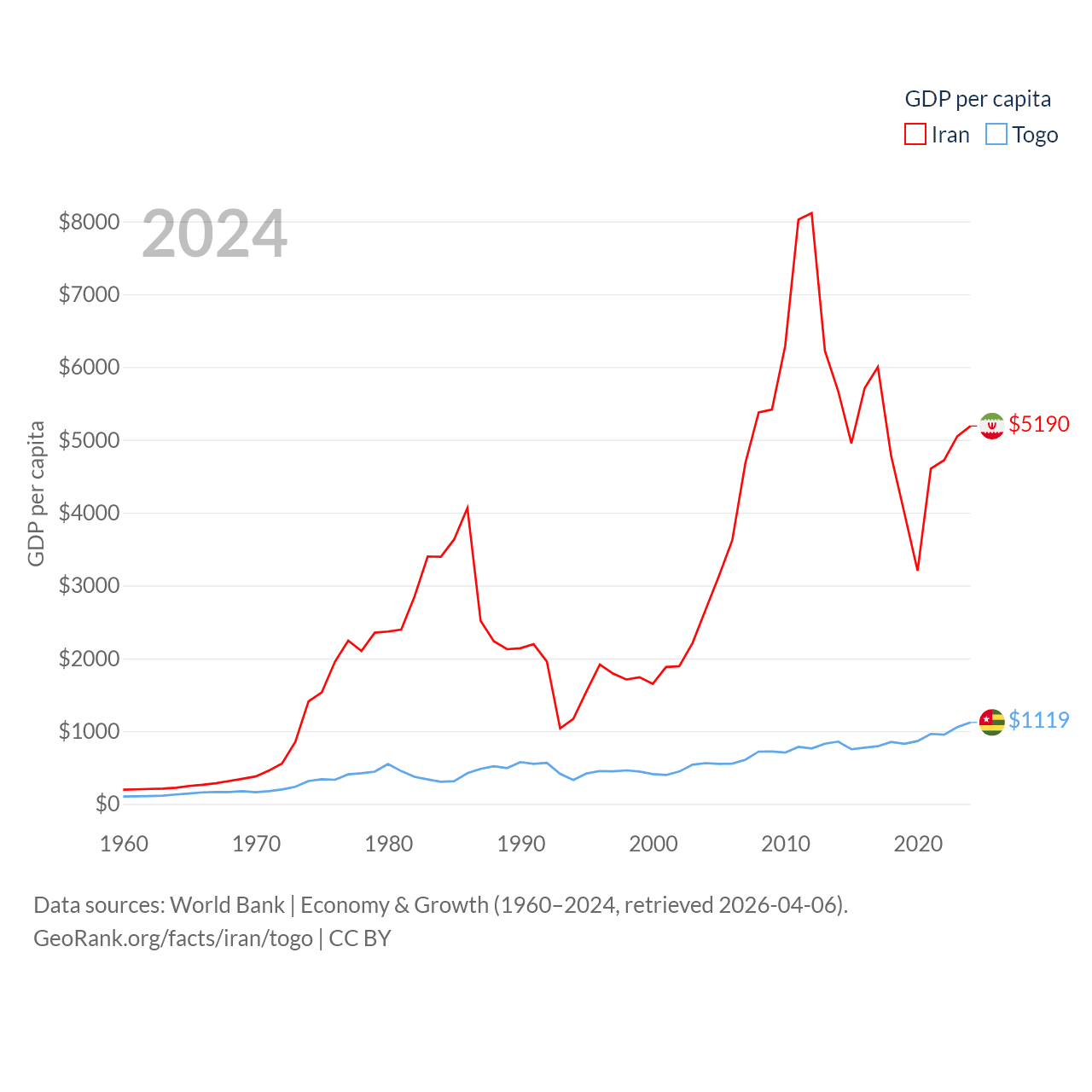 By GDP, Iran ranks 34/197 ($475B) and Togo ranks 154/197 ($10.7B). By GDP per capita, Iran ranks 119/197 ($5,190), while Togo ranks 172/197 ($1,119).