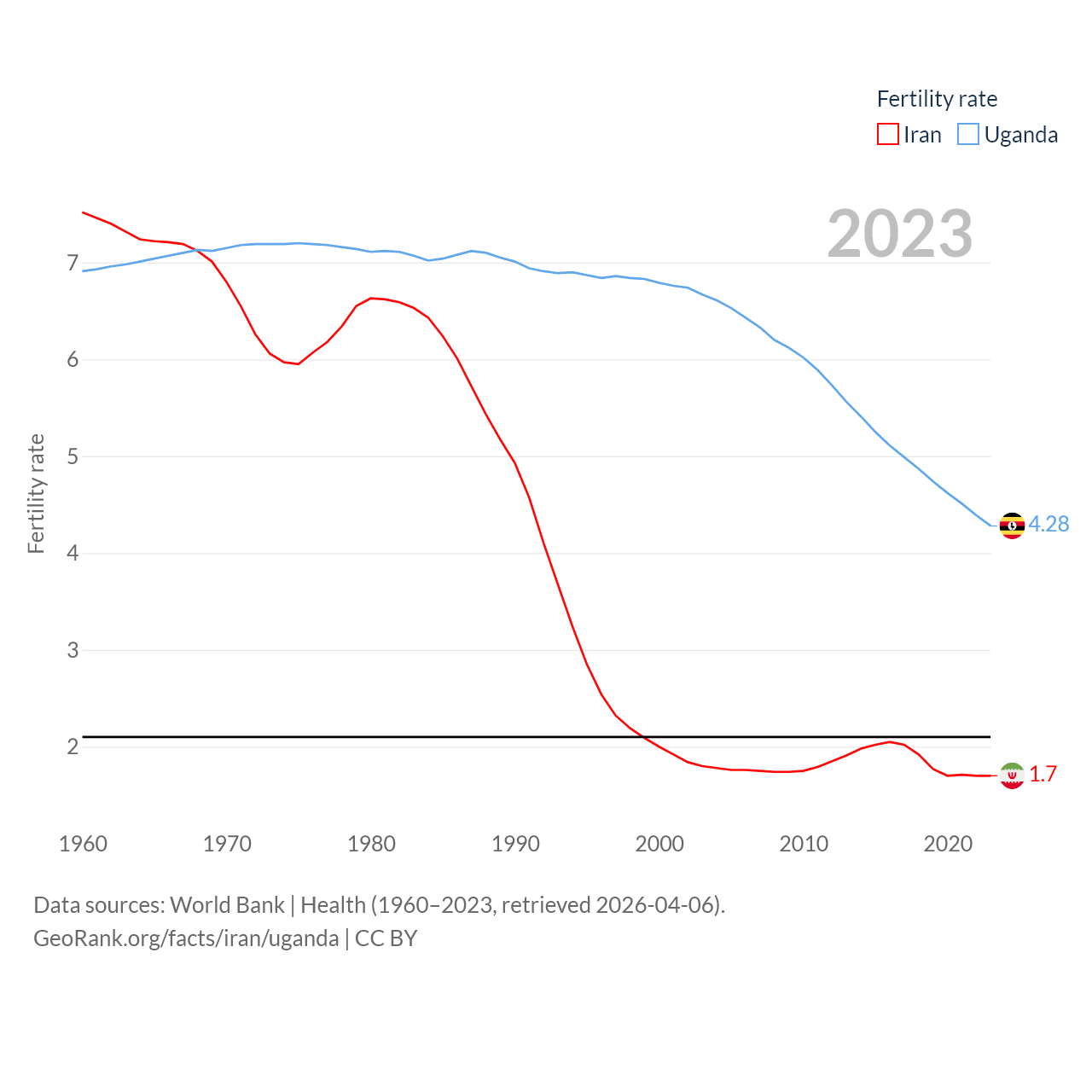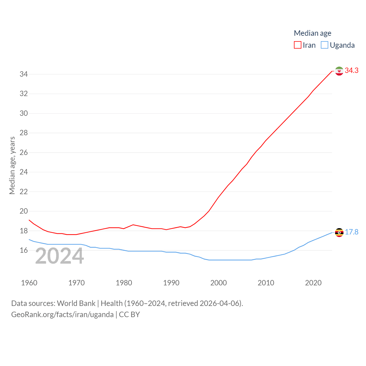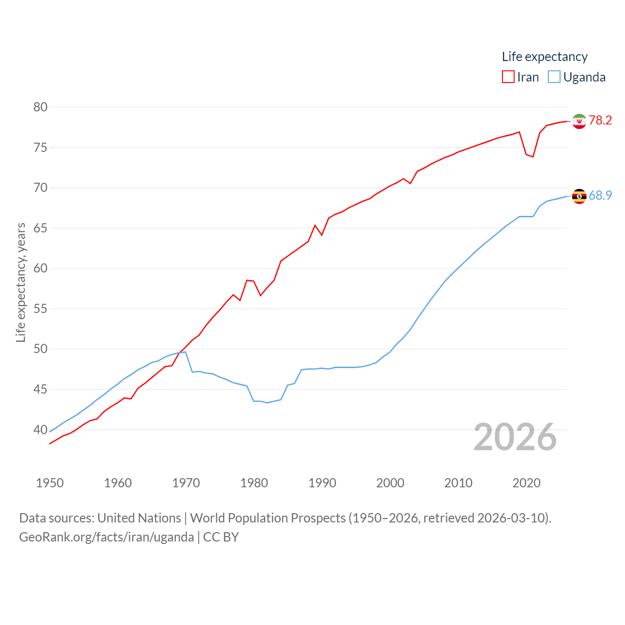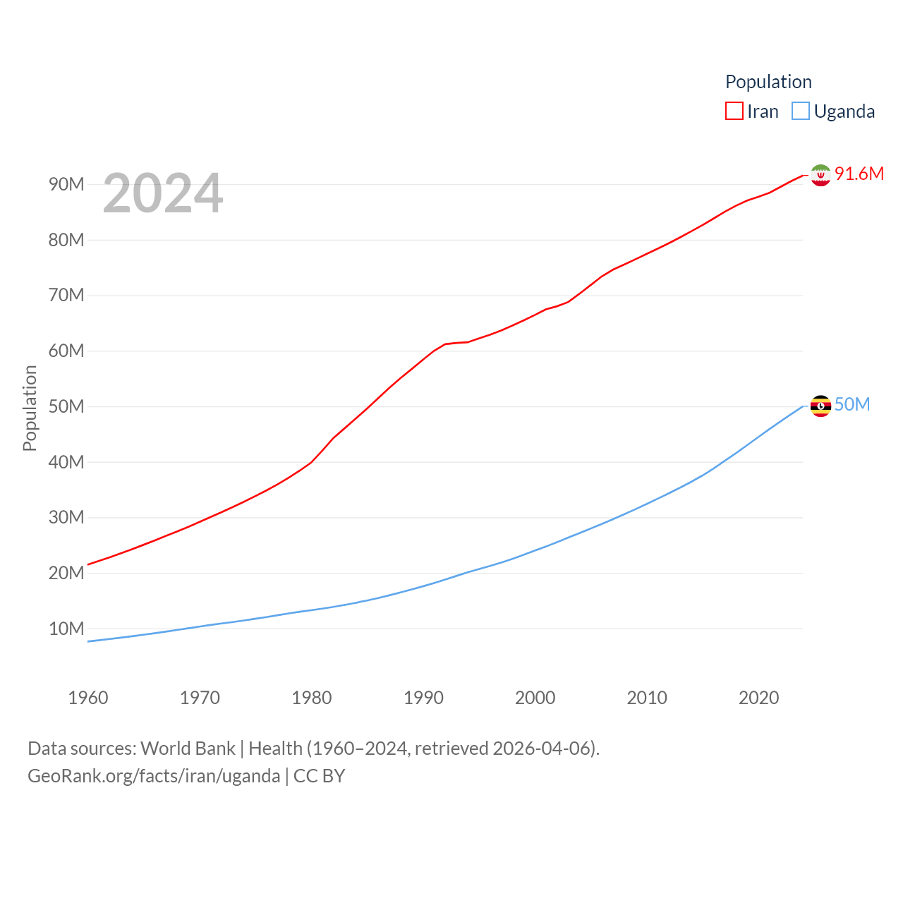 Iran has a population of 91.6M (ranked 17/197), compared with 50M in Uganda (ranked 31/197). Iran's land area is 626,451 sq mi versus 77,421 sq mi for Uganda (ranked 17th vs. 84th).