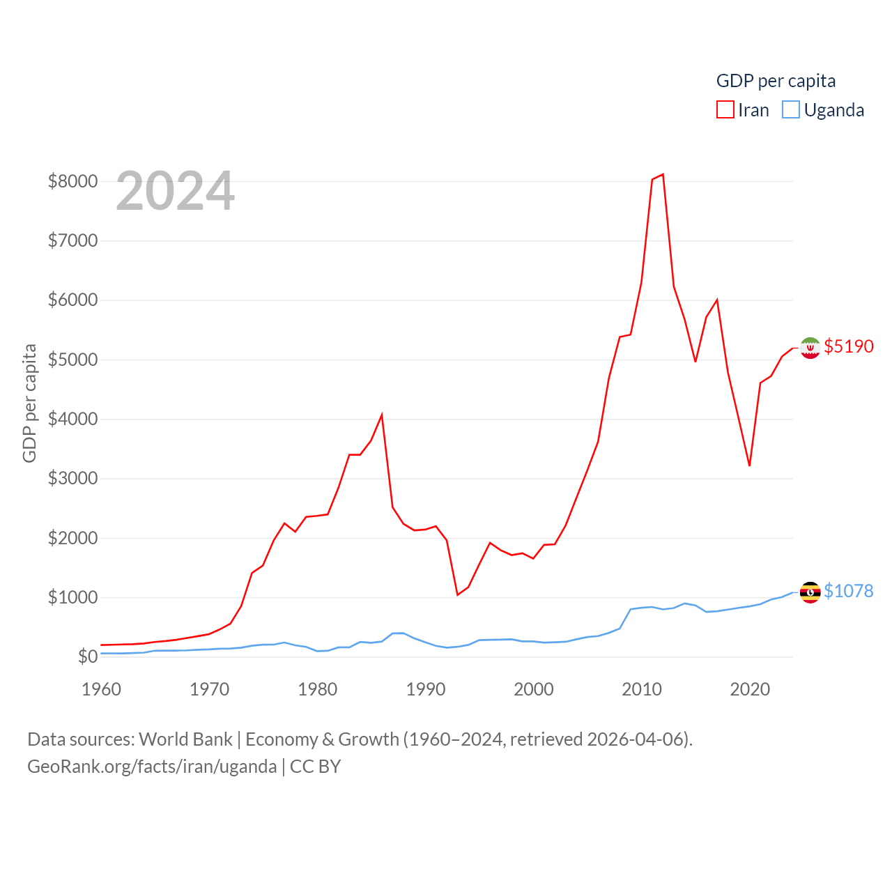 By GDP, Iran ranks 34/197 ($475B) and Uganda ranks 89/197 ($53.9B). By GDP per capita, Iran ranks 119/197 ($5,190), while Uganda ranks 176/197 ($1,078).