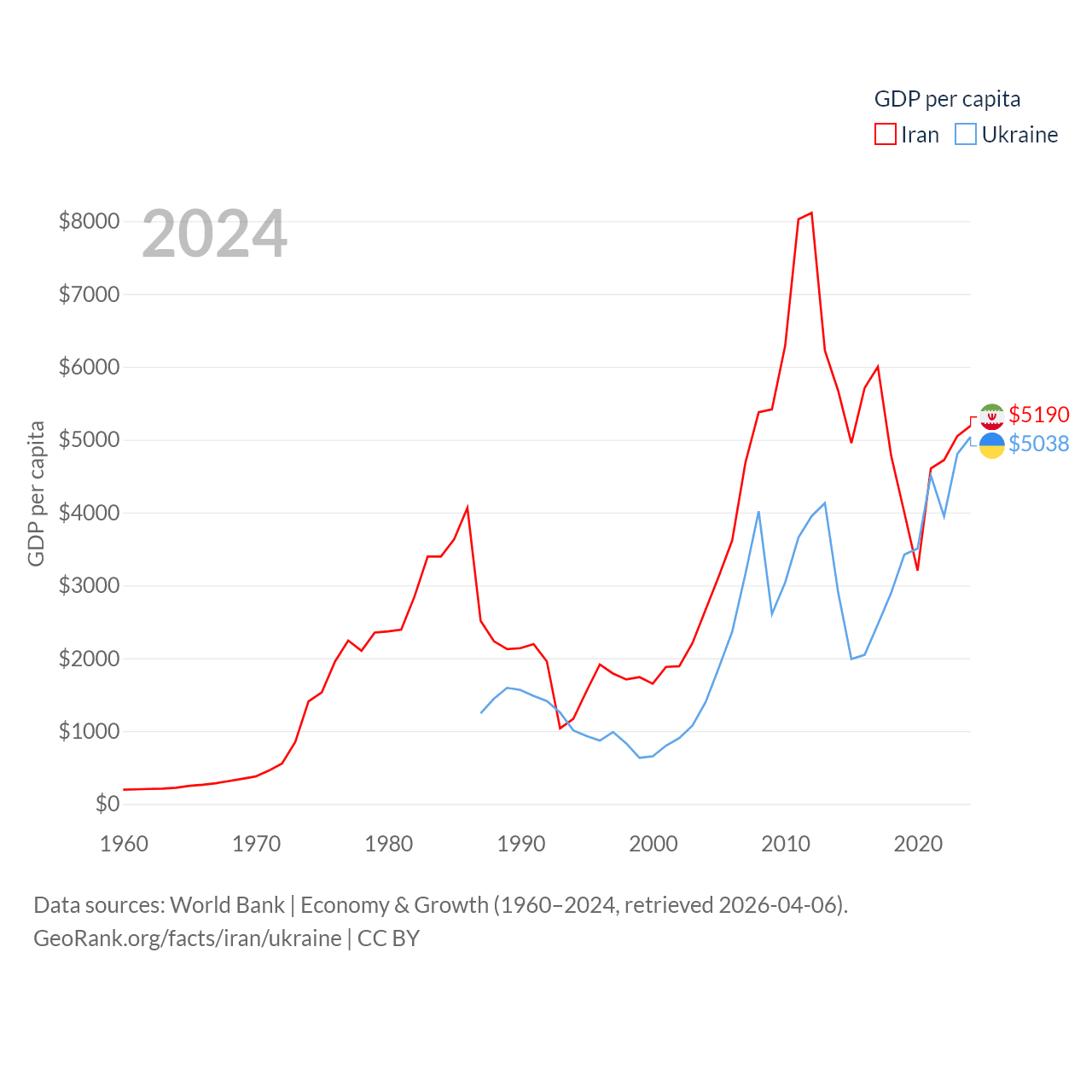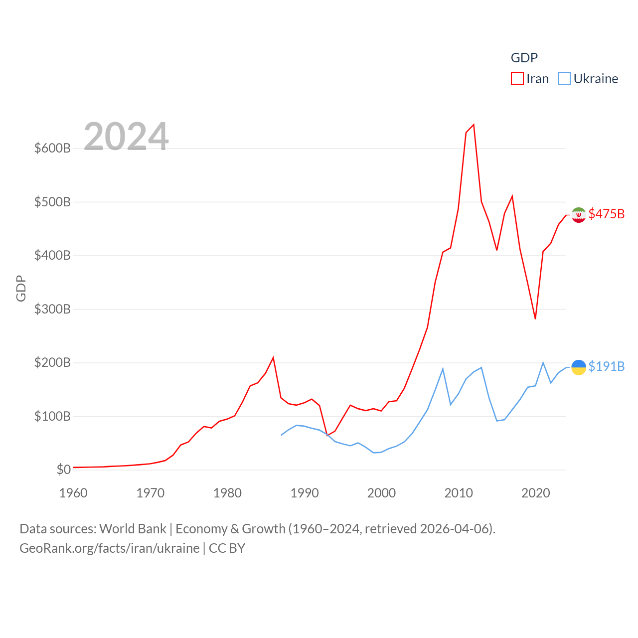 By GDP, Iran ranks 34/197 ($475B) and Ukraine ranks 57/197 ($191B). By GDP per capita, Iran ranks 119/197 ($5,190), while Ukraine ranks 120/197 ($5,038).