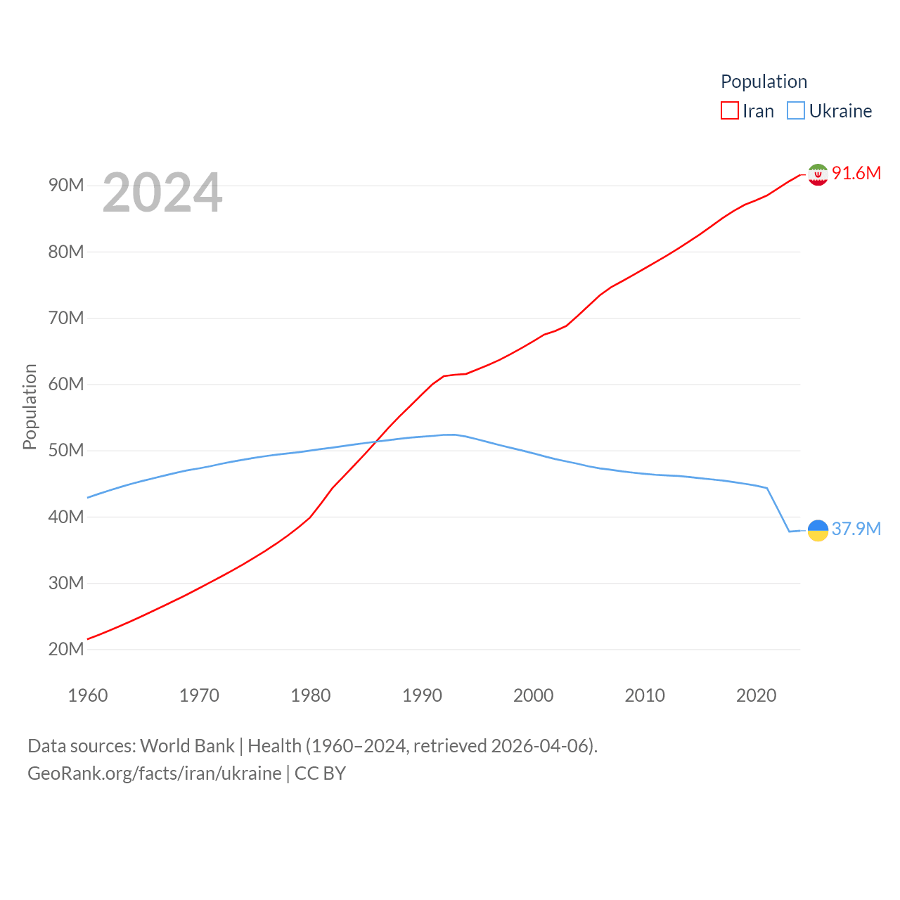 Iran has a population of 91.6M (ranked 17/197), compared with 37.9M in Ukraine (ranked 41/197). Iran's land area is 626,451 sq mi versus 223,708 sq mi for Ukraine (ranked 17th vs. 46th).