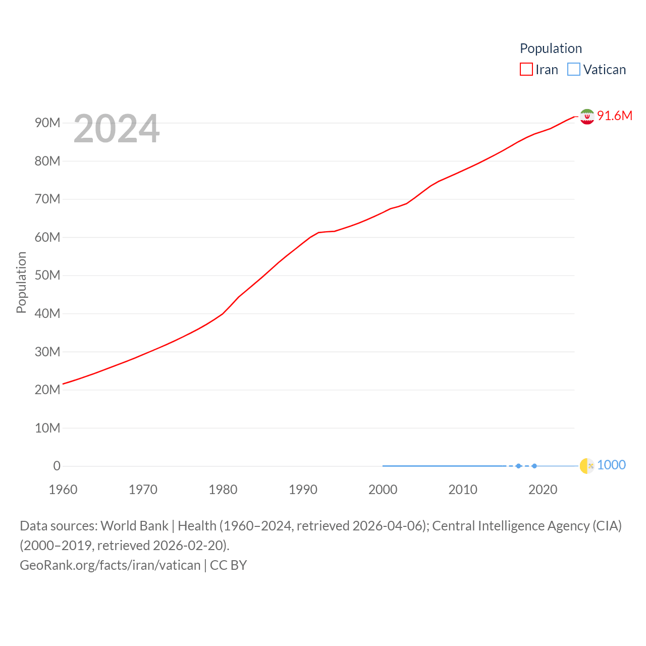 Iran has a population of 91.6M (ranked 17/197), compared with 1K in The Vatican (ranked 197/197). Iran's land area is 626,451 sq mi versus 0.17 sq mi for The Vatican (ranked 17th vs. 197th).