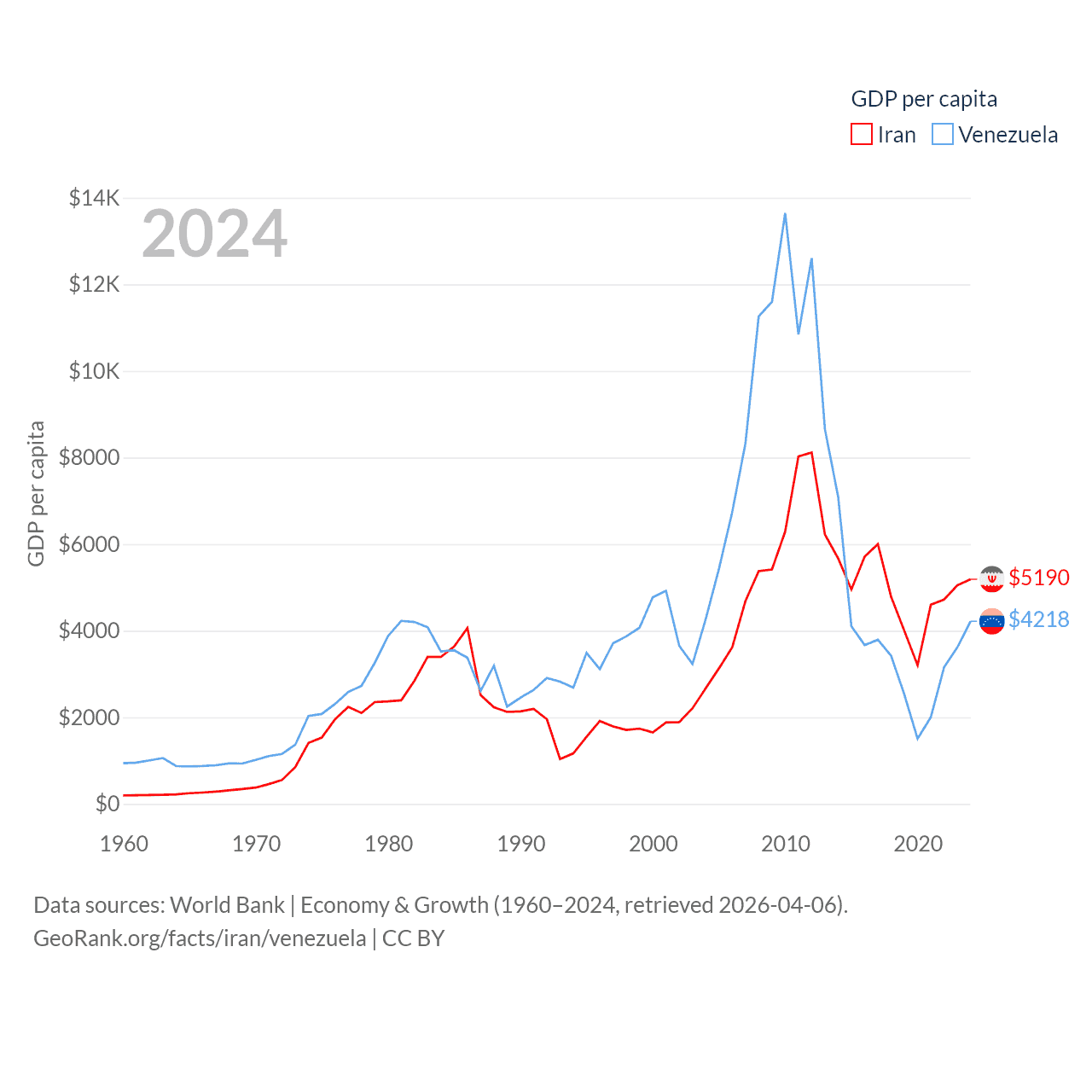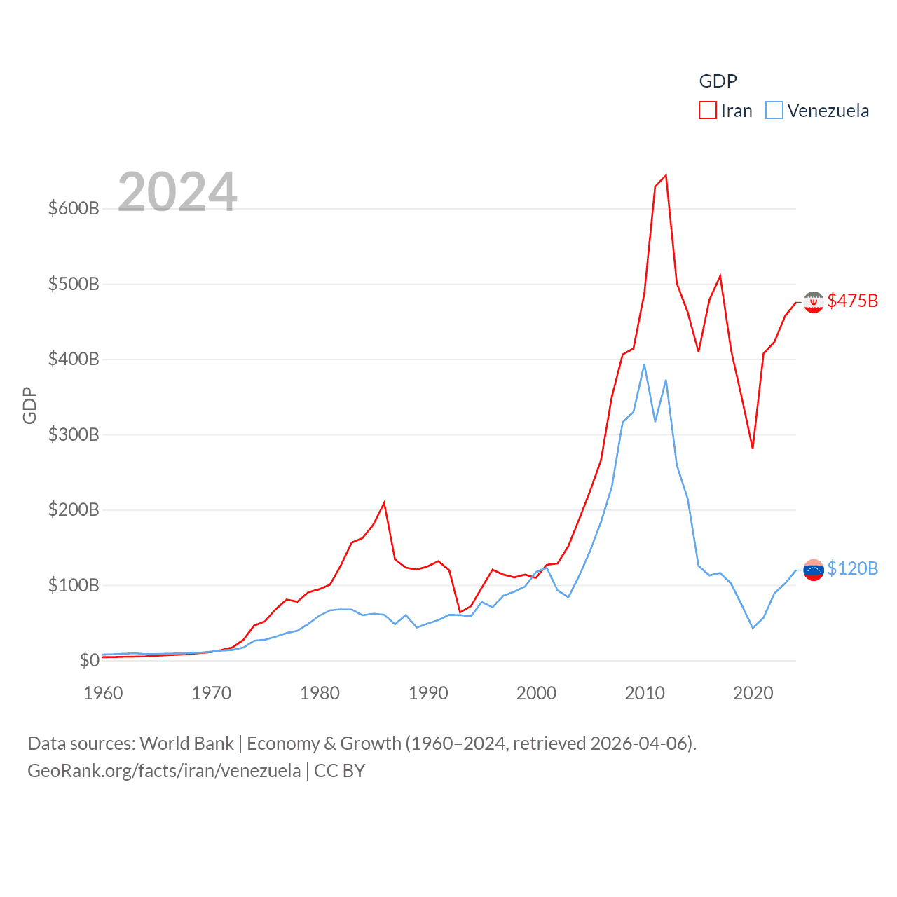 By GDP, Iran ranks 34/197 ($475B) and Venezuela ranks 65/197 ($120B). By GDP per capita, Iran ranks 119/197 ($5,190), while Venezuela ranks 128/197 ($4,218).