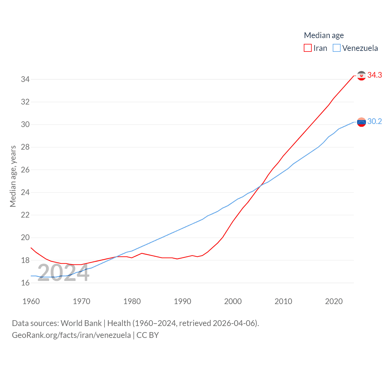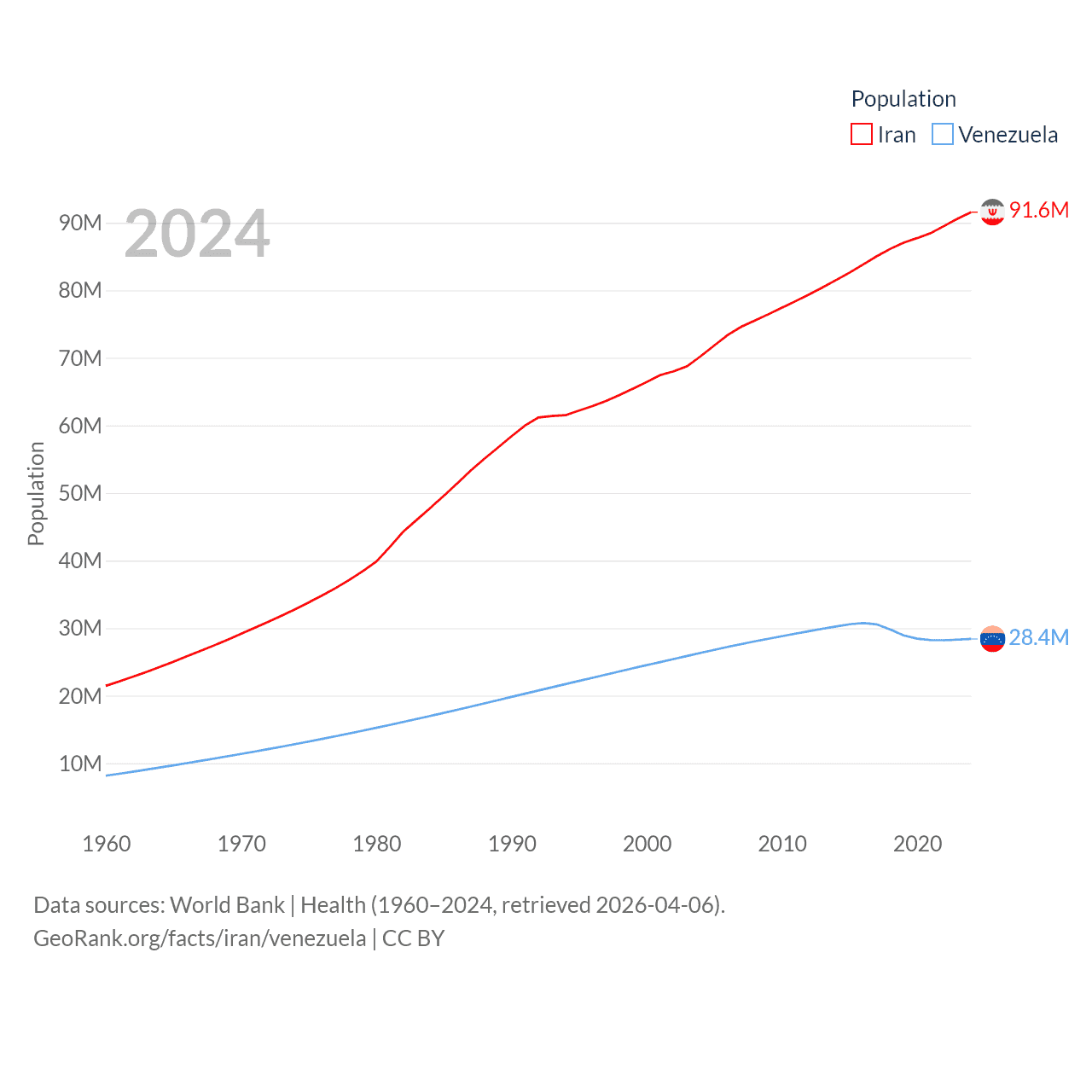 Iran has a population of 91.6M (ranked 17/197), compared with 28.4M in Venezuela (ranked 53/197). Iran's land area is 626,451 sq mi versus 340,561 sq mi for Venezuela (ranked 17th vs. 32nd).