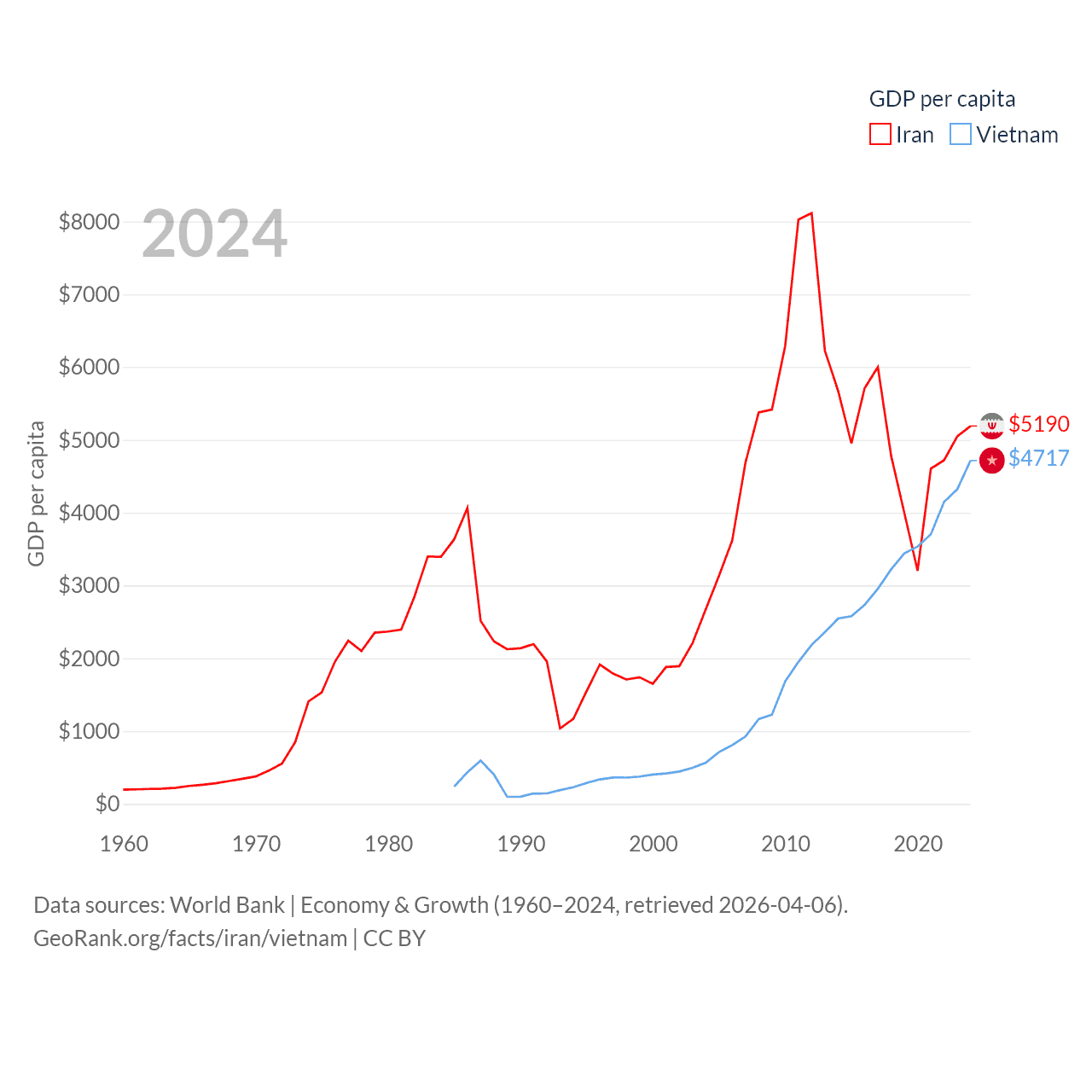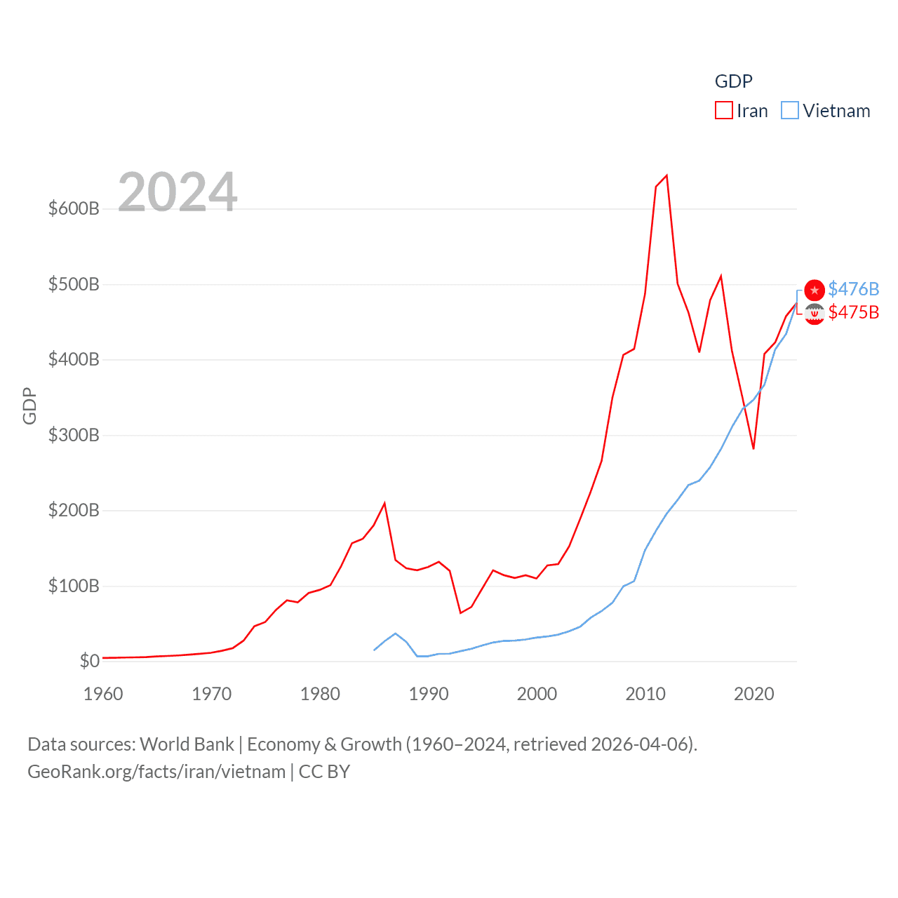 By GDP, Iran ranks 34/197 ($475B) and Vietnam ranks 33/197 ($476B). By GDP per capita, Iran ranks 119/197 ($5,190), while Vietnam ranks 122/197 ($4,717).