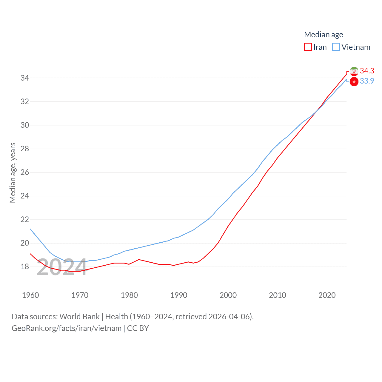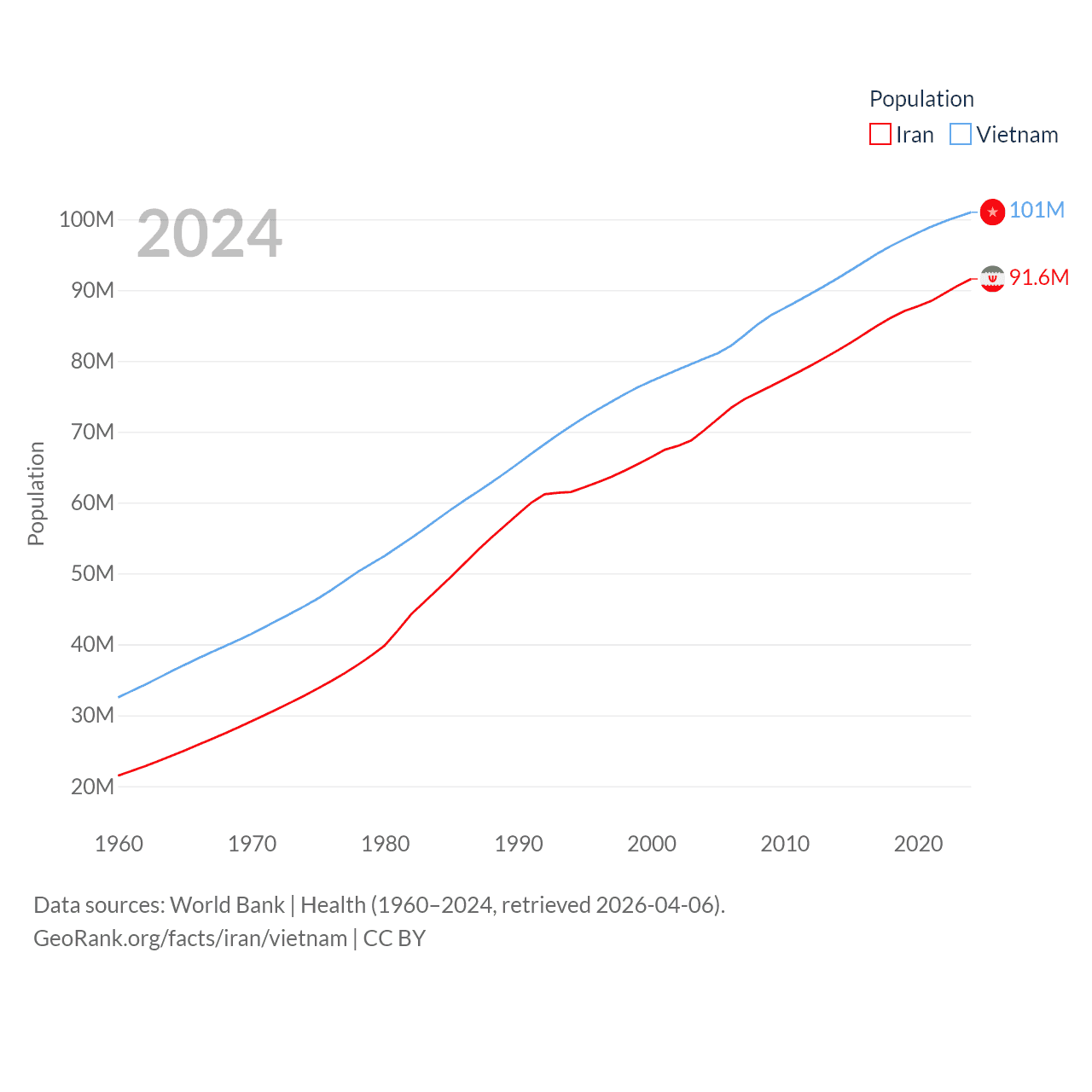 Iran has a population of 91.6M (ranked 17/197), compared with 101M in Vietnam (ranked 16/197). Iran's land area is 626,451 sq mi versus 121,016 sq mi for Vietnam (ranked 17th vs. 67th).