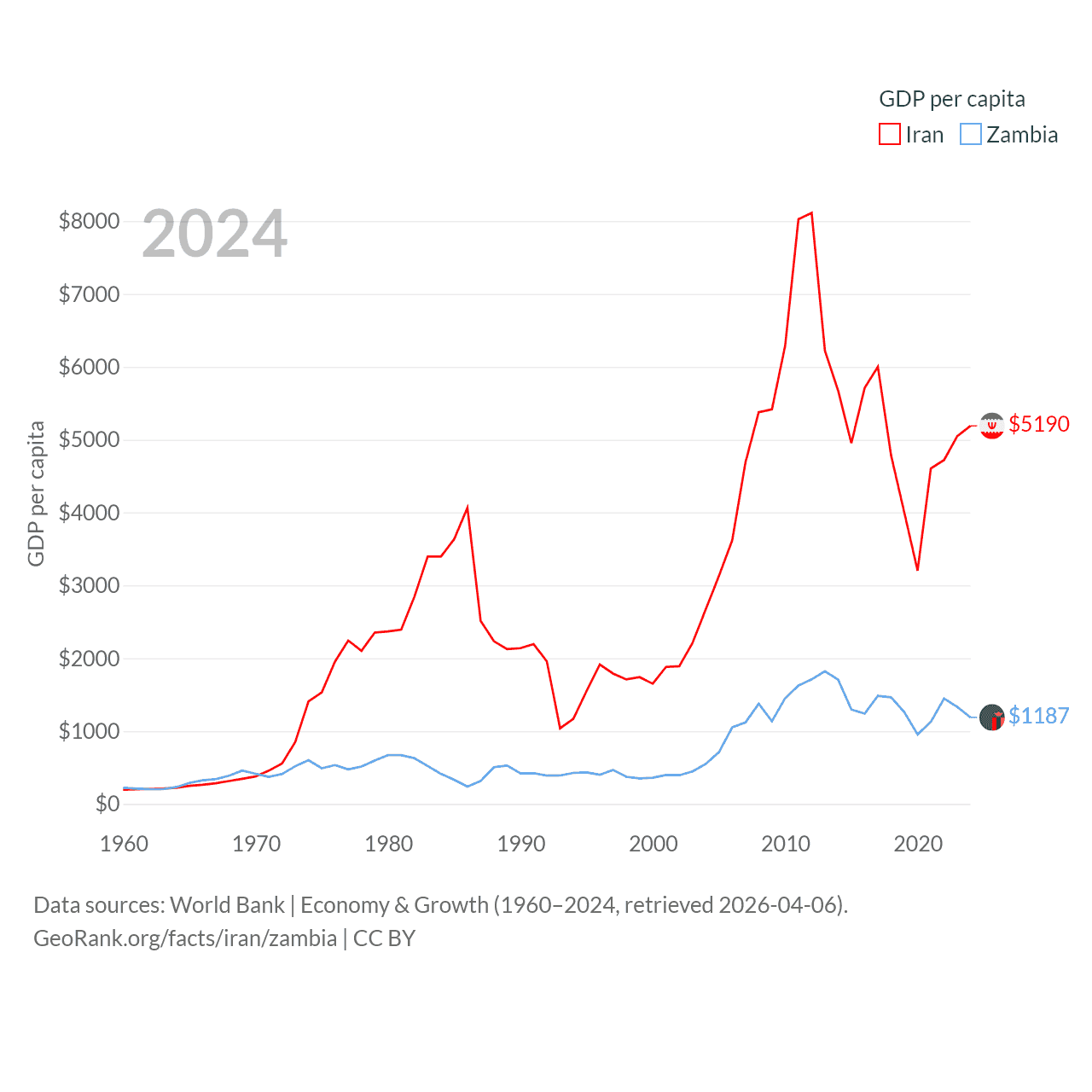 By GDP, Iran ranks 34/197 ($475B) and Zambia ranks 116/197 ($25.3B). By GDP per capita, Iran ranks 119/197 ($5,190), while Zambia ranks 169/197 ($1,187).