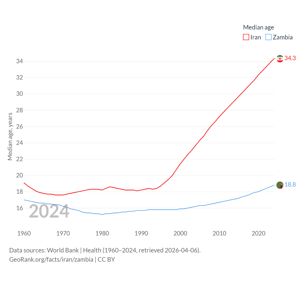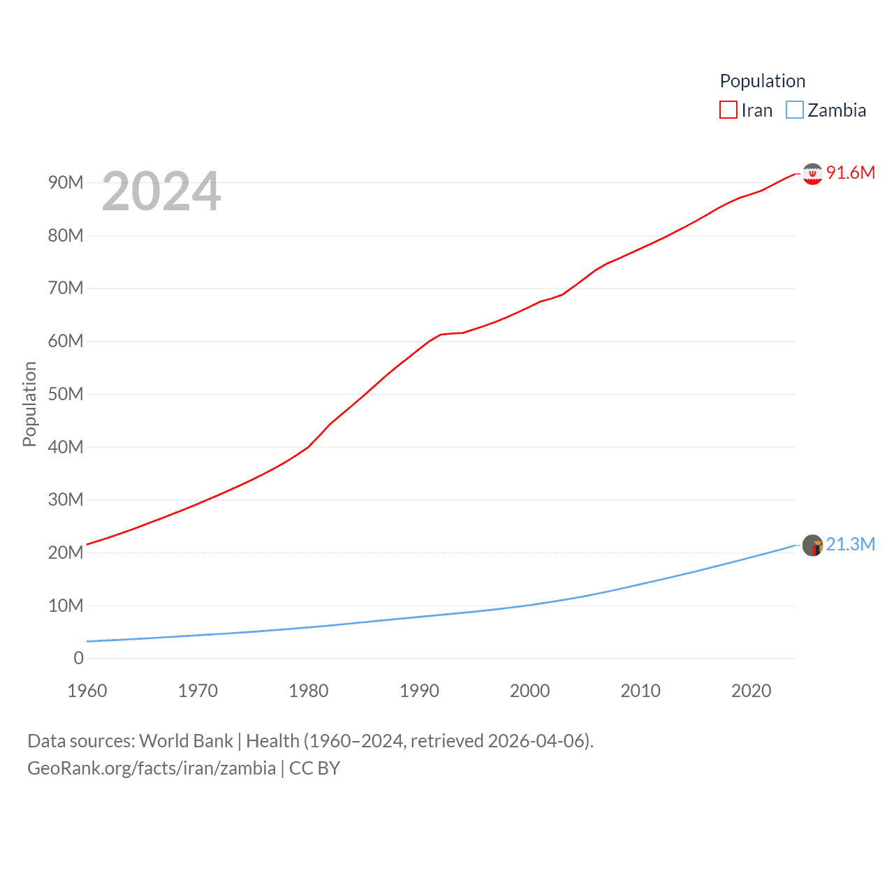 Iran has a population of 91.6M (ranked 17/197), compared with 21.3M in Zambia (ranked 63/197). Iran's land area is 626,451 sq mi versus 287,024 sq mi for Zambia (ranked 17th vs. 37th).