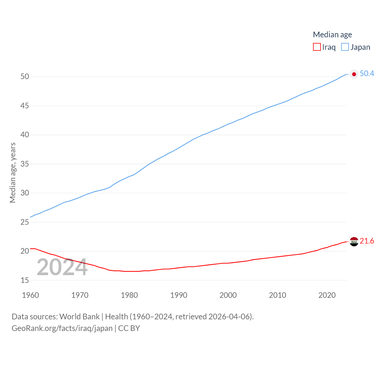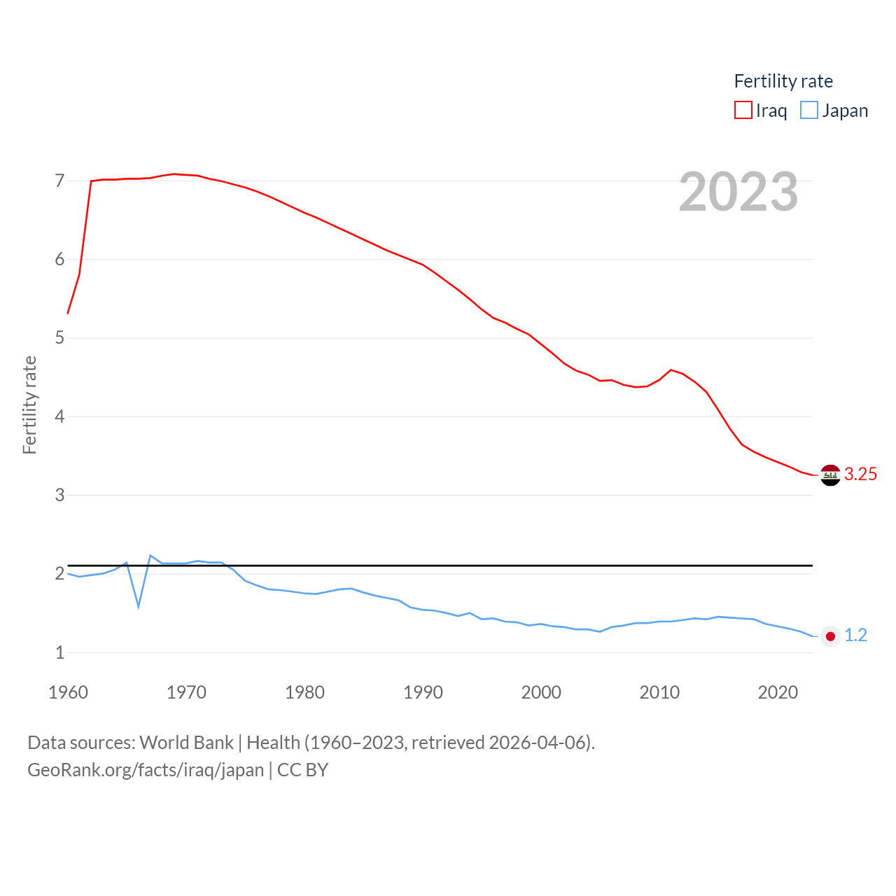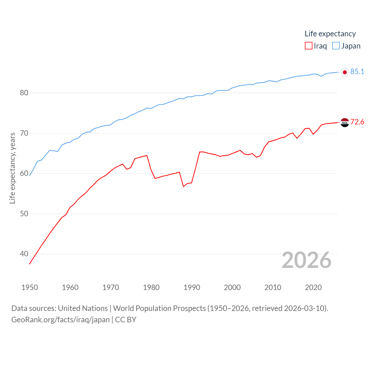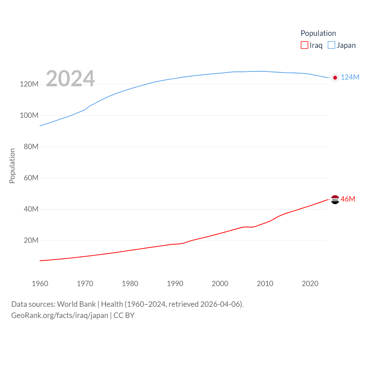 Iraq has a population of 46M (ranked 34/197), compared with 124M in Japan (ranked 12/197). Iraq's land area is 167,619 sq mi versus 140,761 sq mi for Japan (ranked 57th vs. 61st).