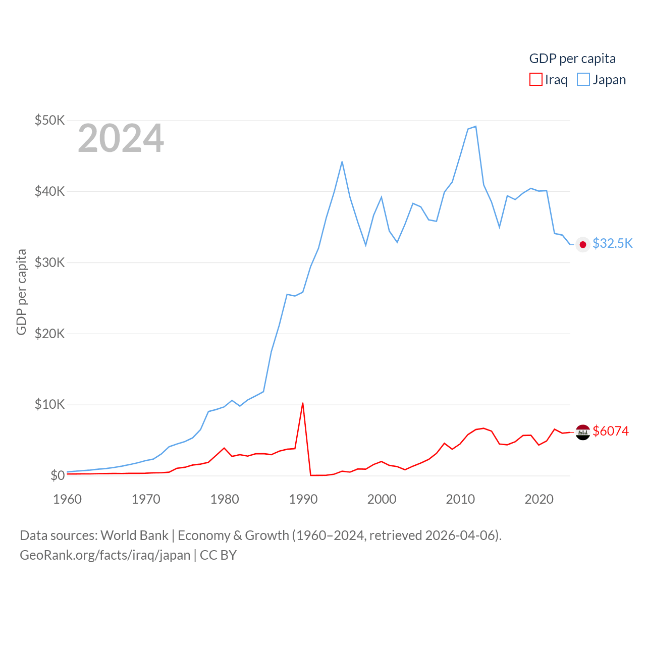By GDP, Iraq ranks 50/197 ($280B) and Japan ranks 4/197 ($4.03T). By GDP per capita, Iraq ranks 113/197 ($6,074), while Japan ranks 38/197 ($32,487).