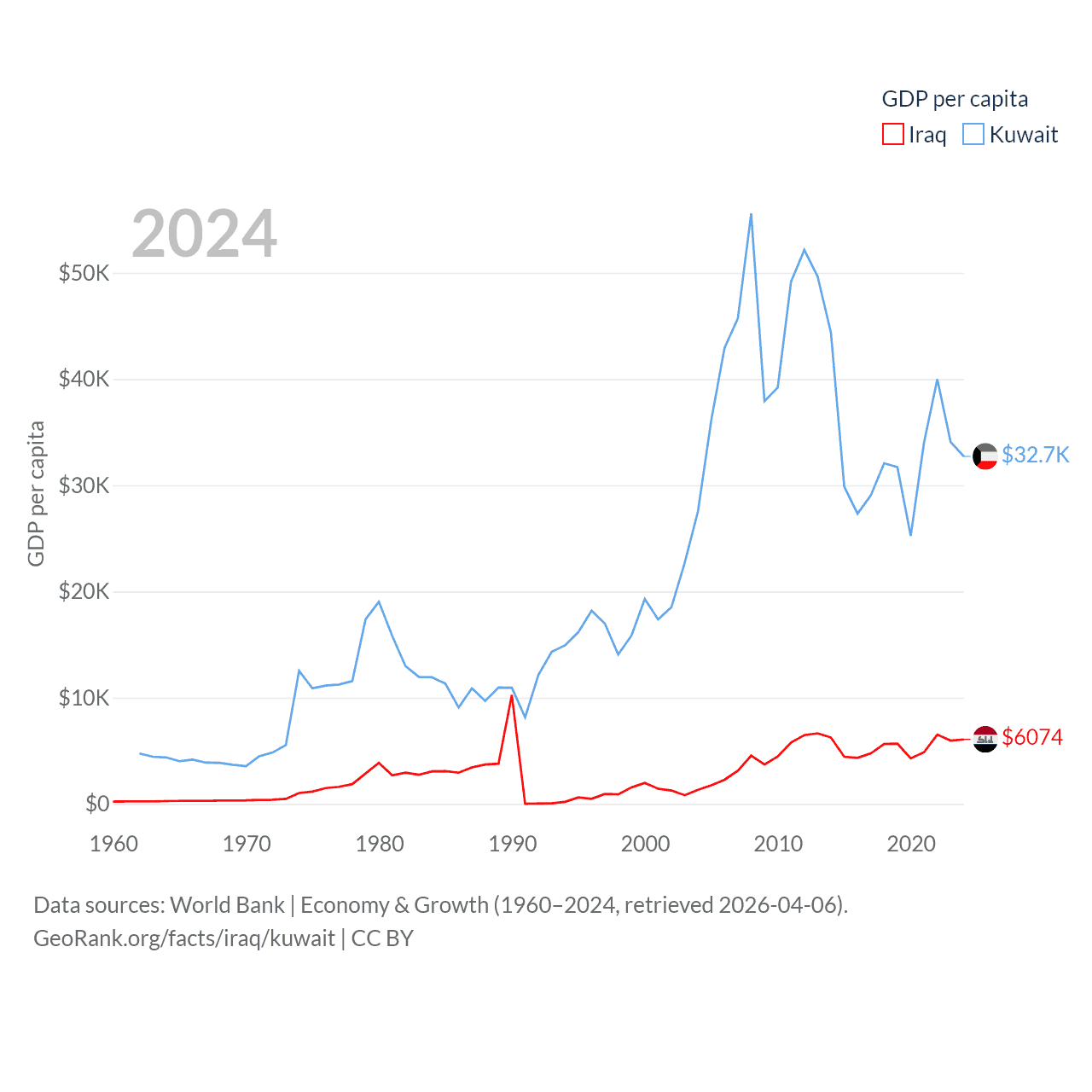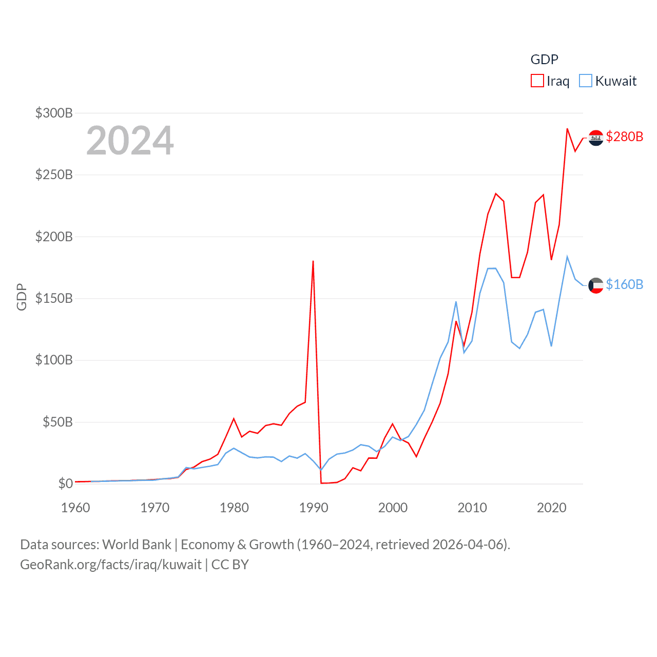 By GDP, Iraq ranks 50/197 ($280B) and Kuwait ranks 59/197 ($160B). By GDP per capita, Iraq ranks 113/197 ($6,074), while Kuwait ranks 37/197 ($32,718).