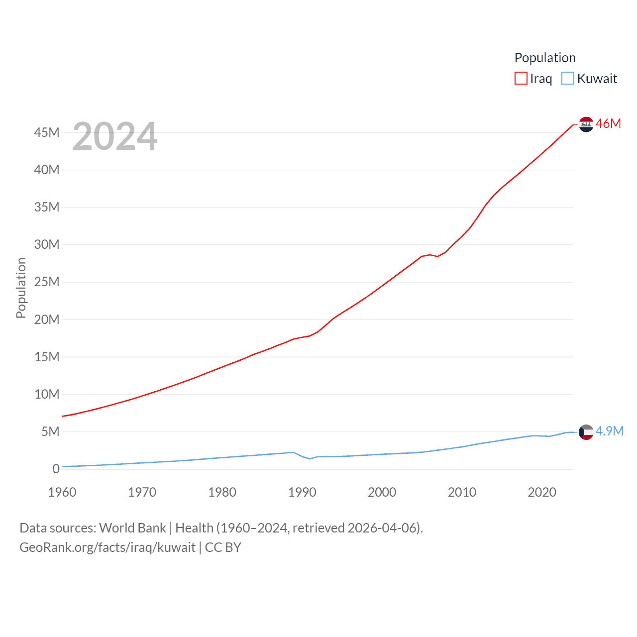 Iraq has a population of 46M (ranked 34/197), compared with 4.9M in Kuwait (ranked 127/197). Iraq's land area is 167,619 sq mi versus 6,880 sq mi for Kuwait (ranked 57th vs. 153rd).