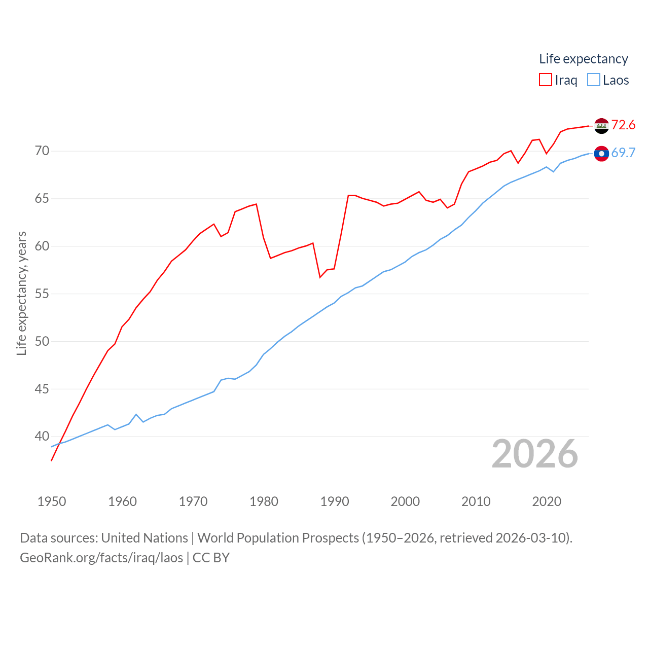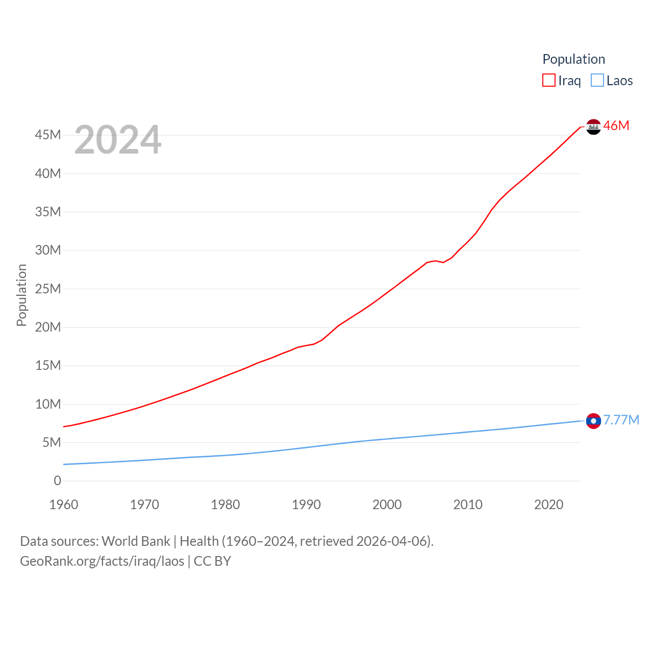 Iraq has a population of 46M (ranked 34/197), compared with 7.77M in Laos (ranked 103/197). Iraq's land area is 167,619 sq mi versus 89,112 sq mi for Laos (ranked 57th vs. 79th).
