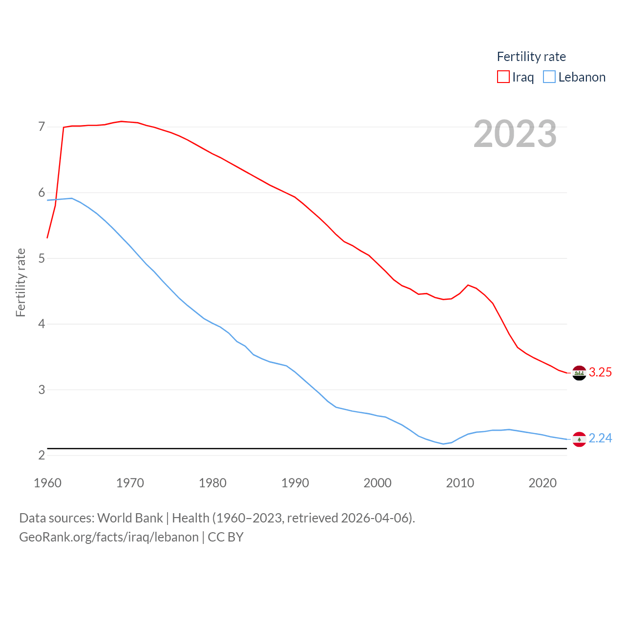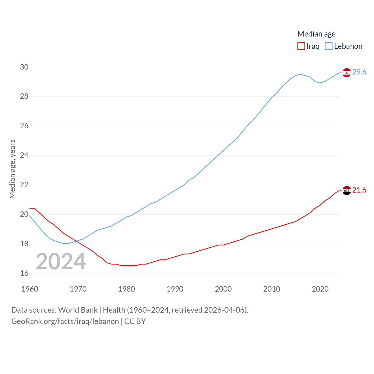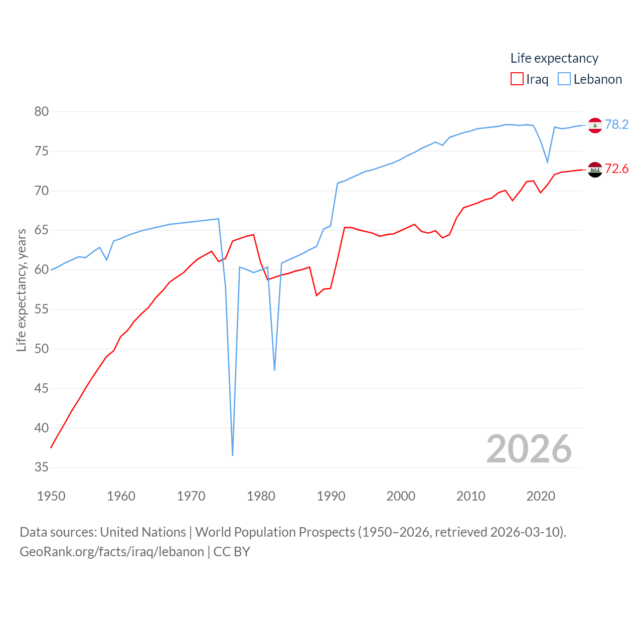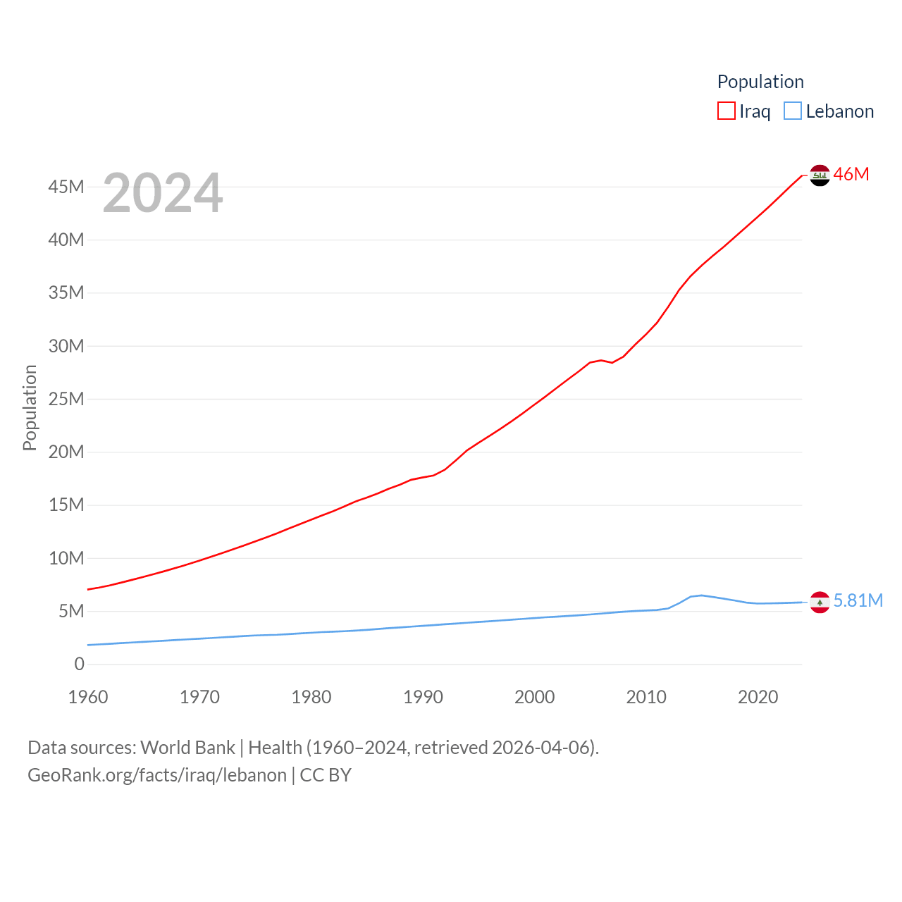 Iraq has a population of 46M (ranked 34/197), compared with 5.81M in Lebanon (ranked 115/197). Iraq's land area is 167,619 sq mi versus 3,950 sq mi for Lebanon (ranked 57th vs. 160th).