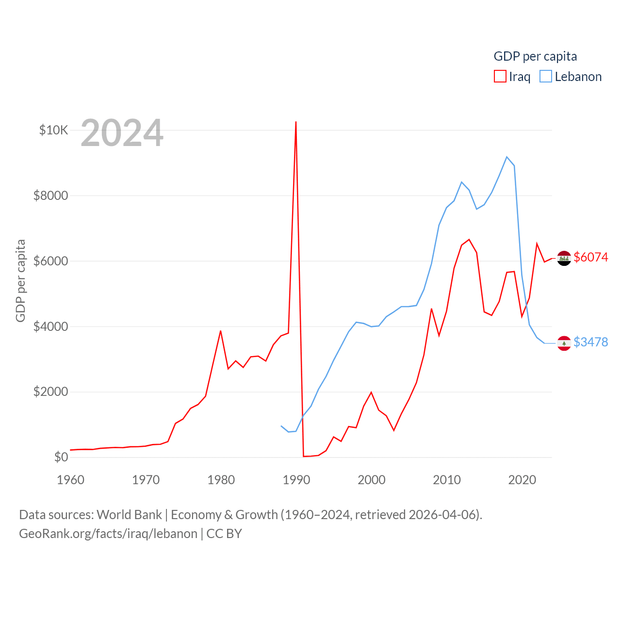 By GDP, Iraq ranks 50/197 ($280B) and Lebanon ranks 128/197 ($20.1B). By GDP per capita, Iraq ranks 113/197 ($6,074), while Lebanon ranks 135/197 ($3,478).