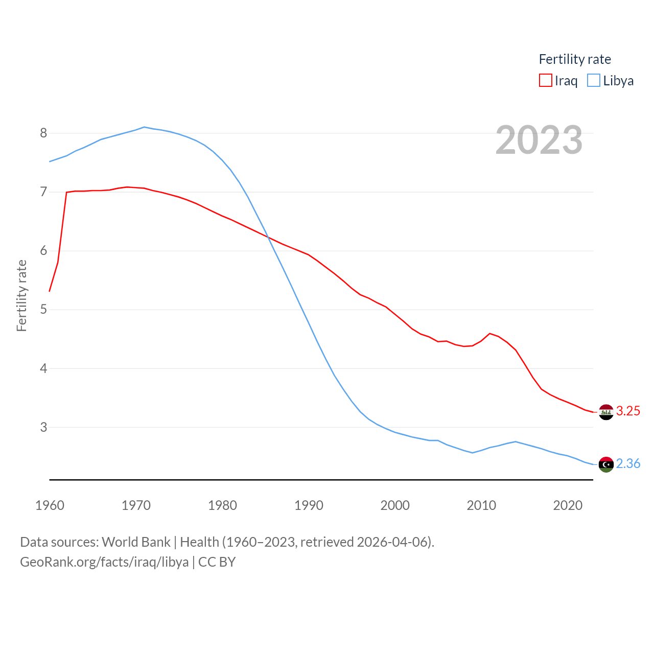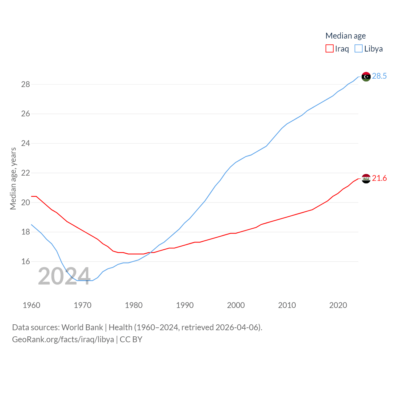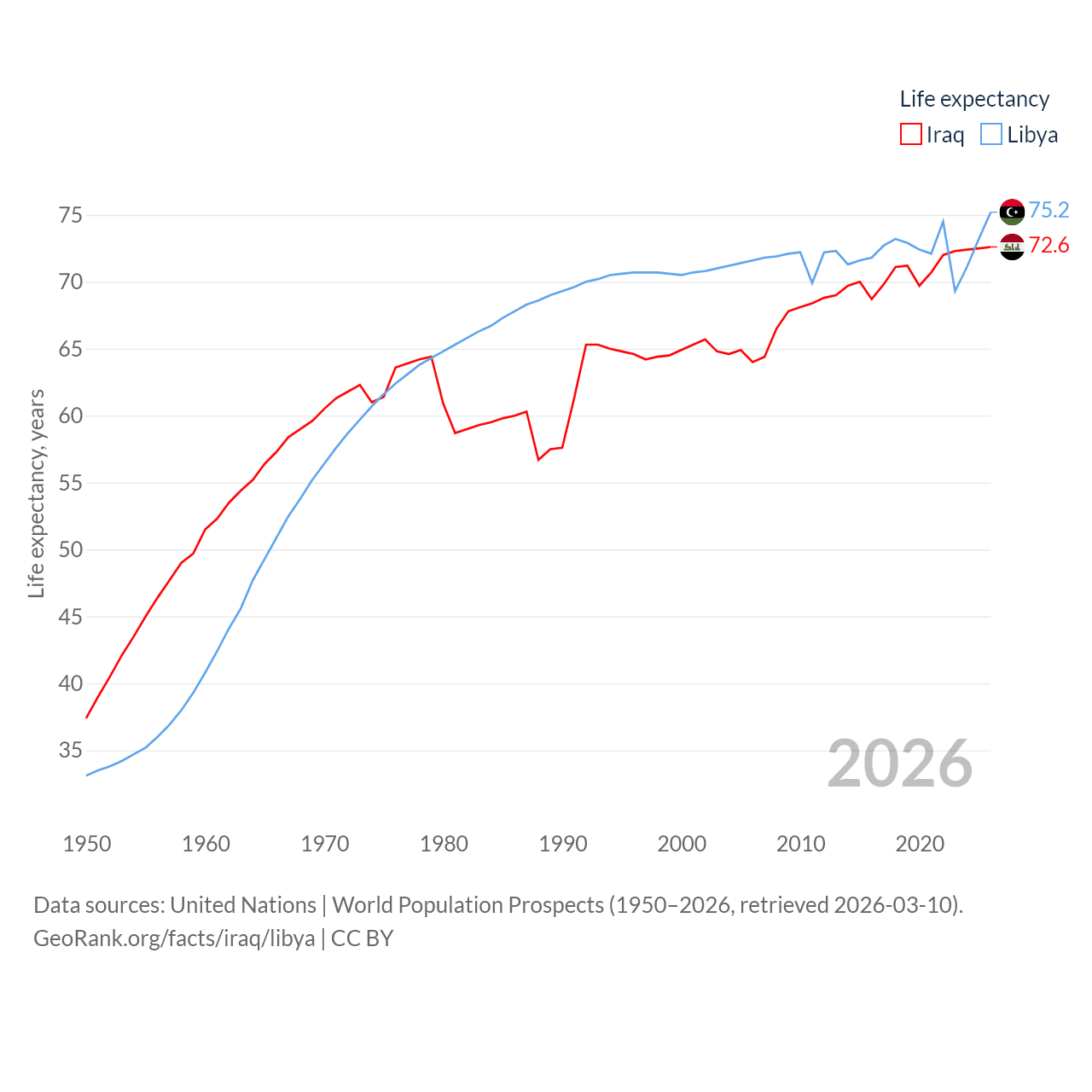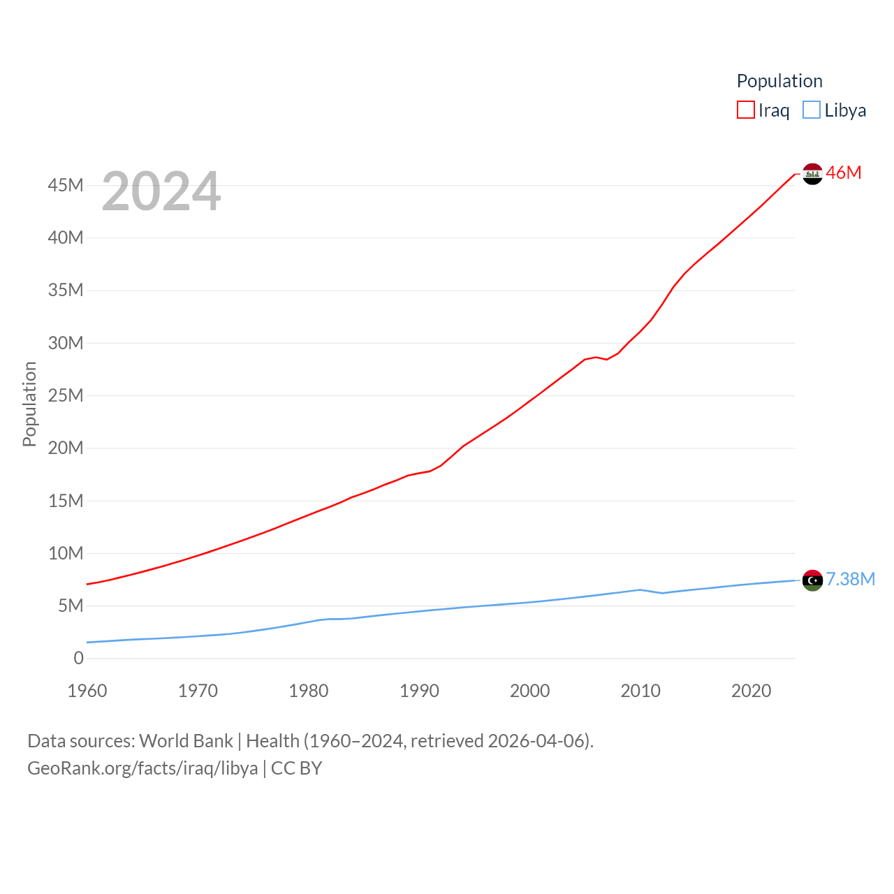 Iraq has a population of 46M (ranked 34/197), compared with 7.38M in Libya (ranked 105/197). Iraq's land area is 167,619 sq mi versus 679,362 sq mi for Libya (ranked 57th vs. 16th).