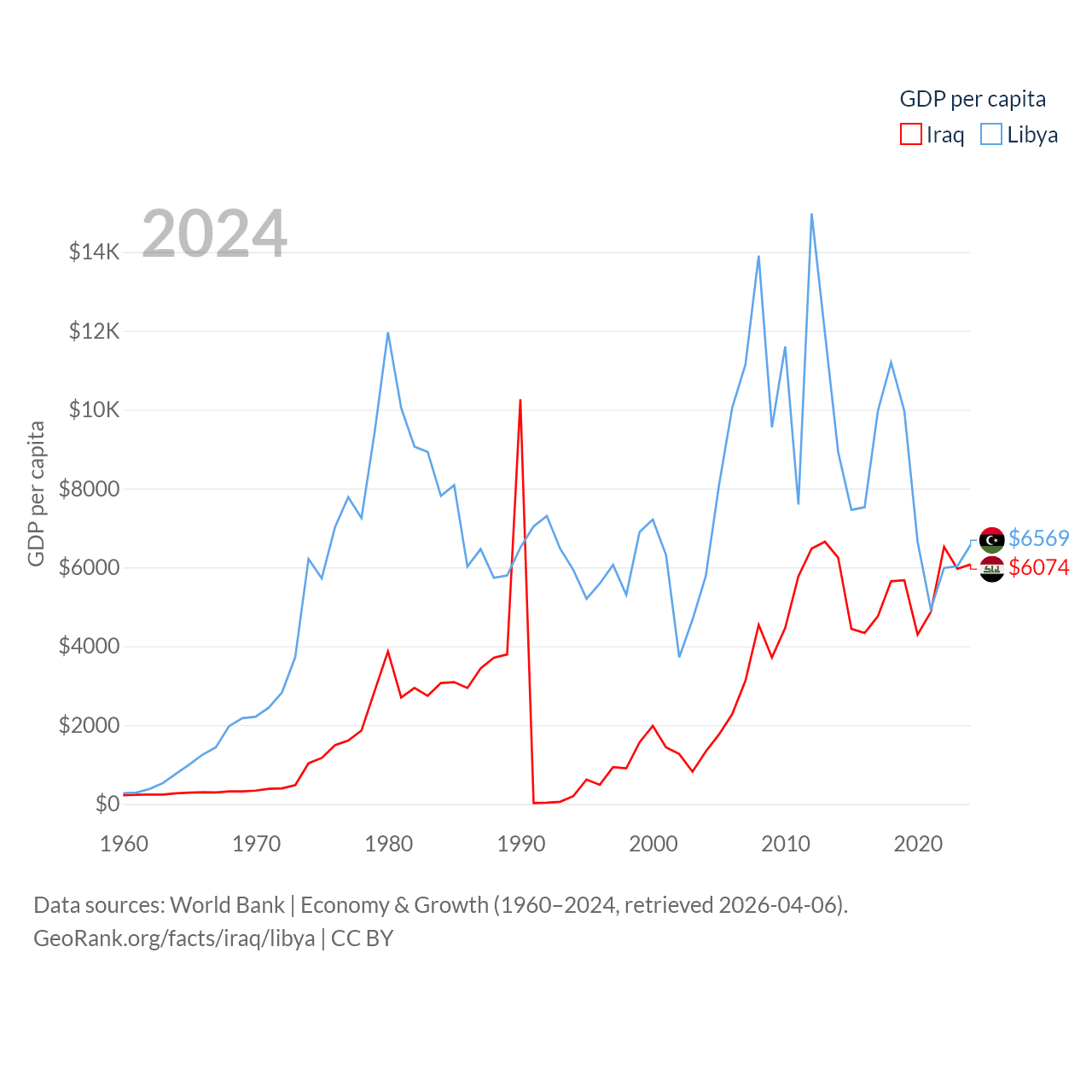 By GDP, Iraq ranks 50/197 ($280B) and Libya ranks 95/197 ($48.5B). By GDP per capita, Iraq ranks 113/197 ($6,074), while Libya ranks 107/197 ($6,569).