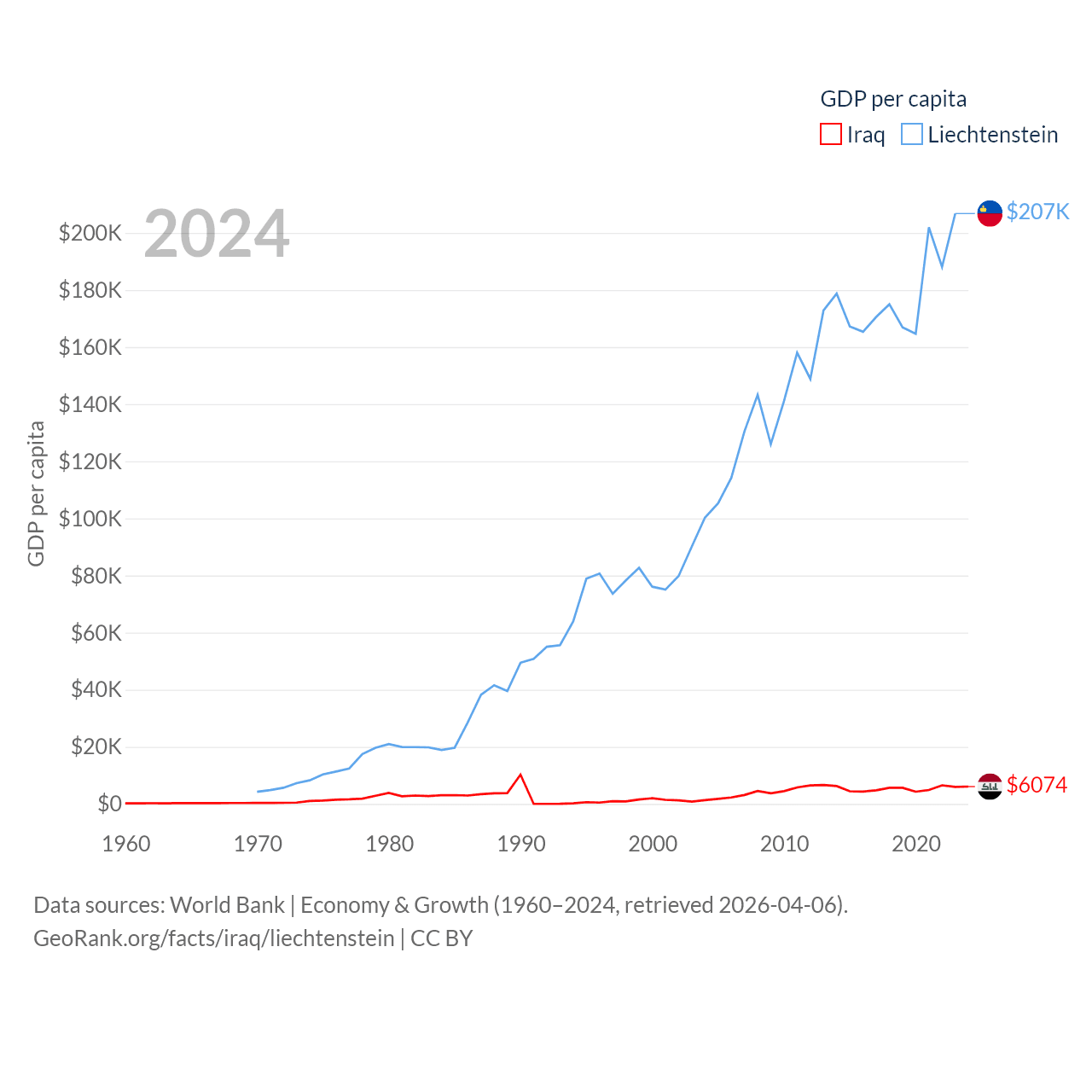By GDP, Iraq ranks 50/197 ($280B) and Liechtenstein ranks 156/197 ($8.24B). By GDP per capita, Iraq ranks 113/197 ($6,074), while Liechtenstein ranks 2/197 ($206,781).