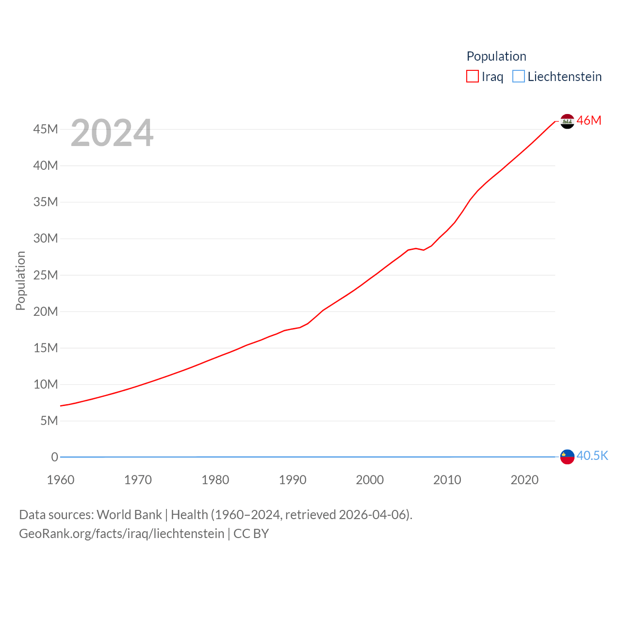 Iraq has a population of 46M (ranked 34/197), compared with 40.4K in Liechtenstein (ranked 190/197). Iraq's land area is 167,619 sq mi versus 61.8 sq mi for Liechtenstein (ranked 57th vs. 192nd).