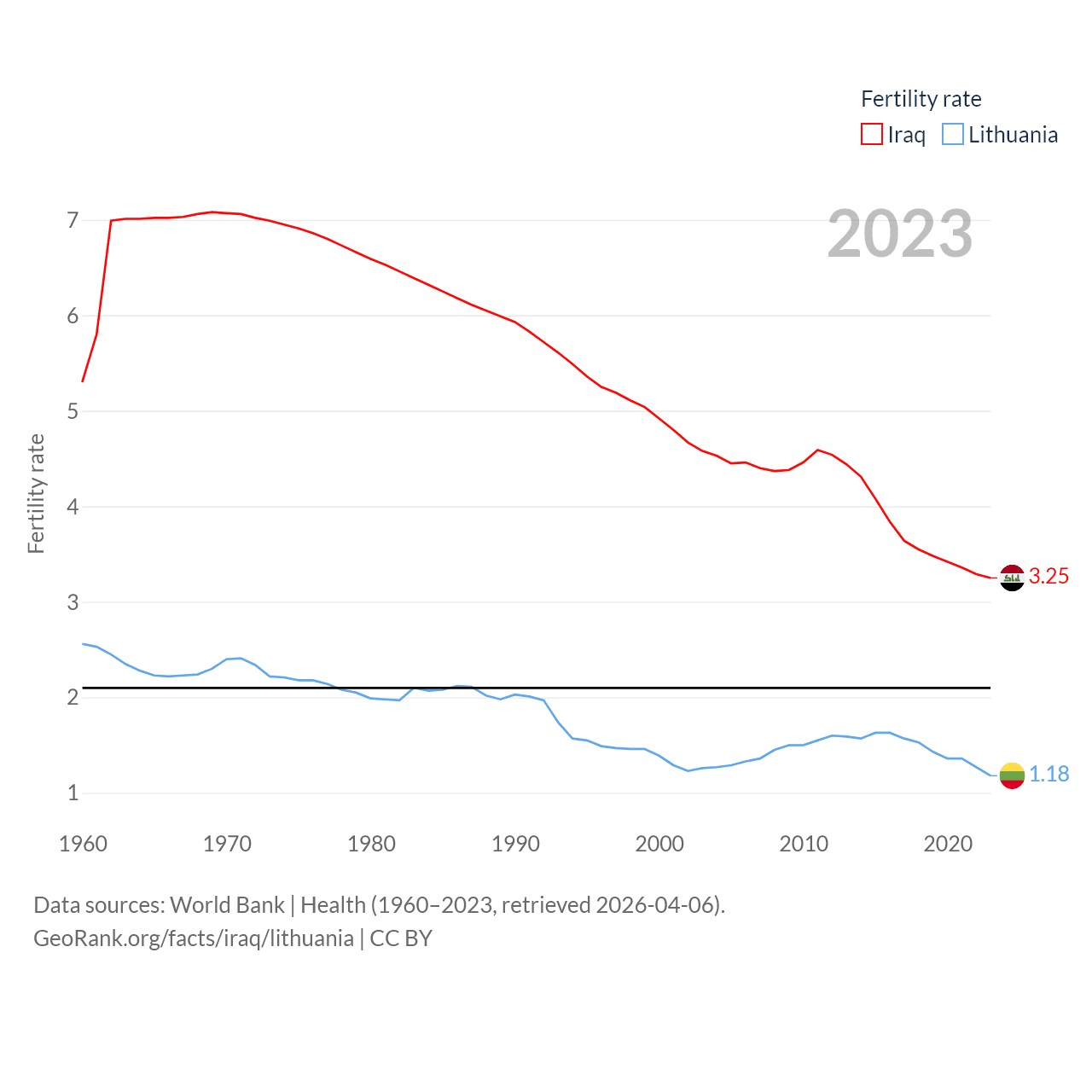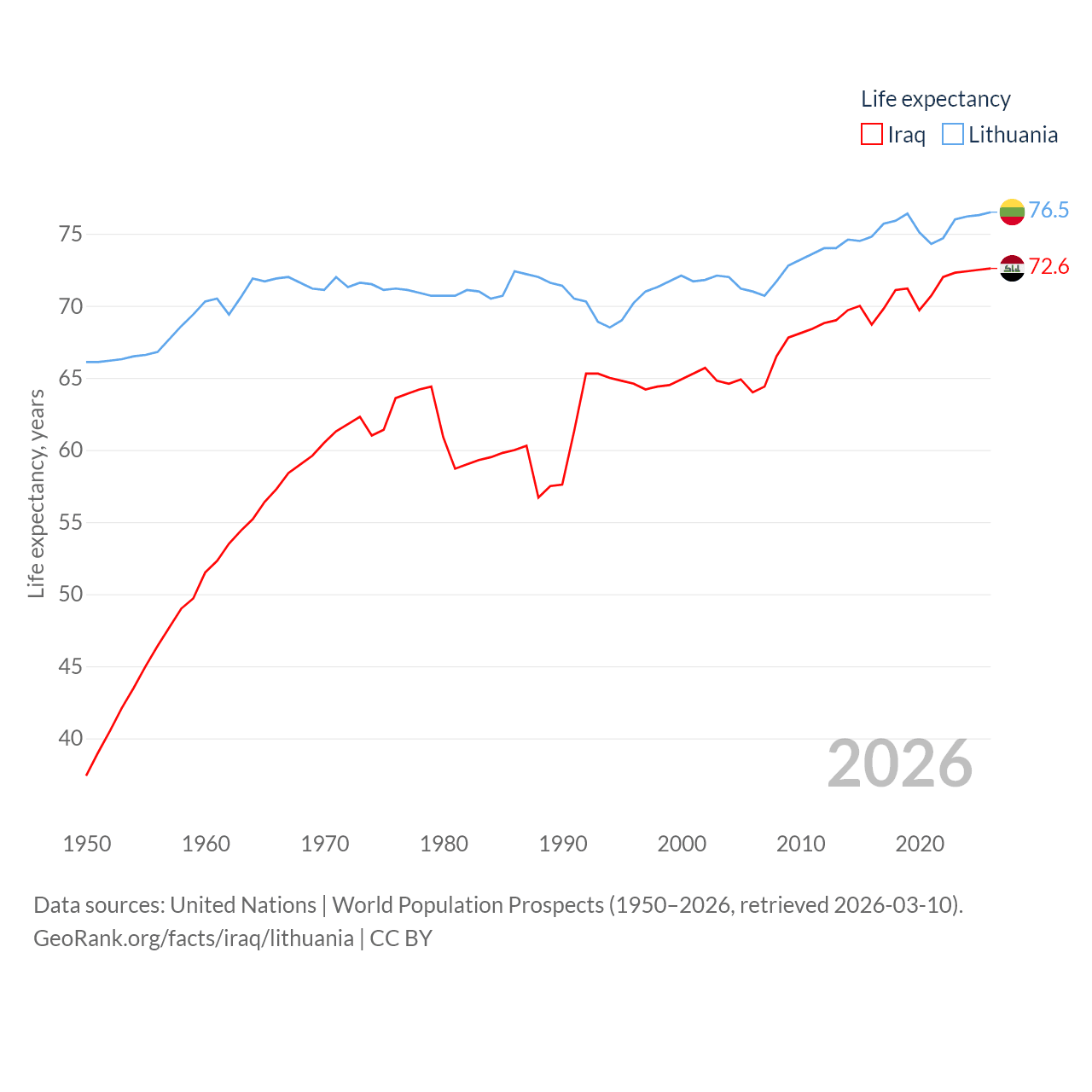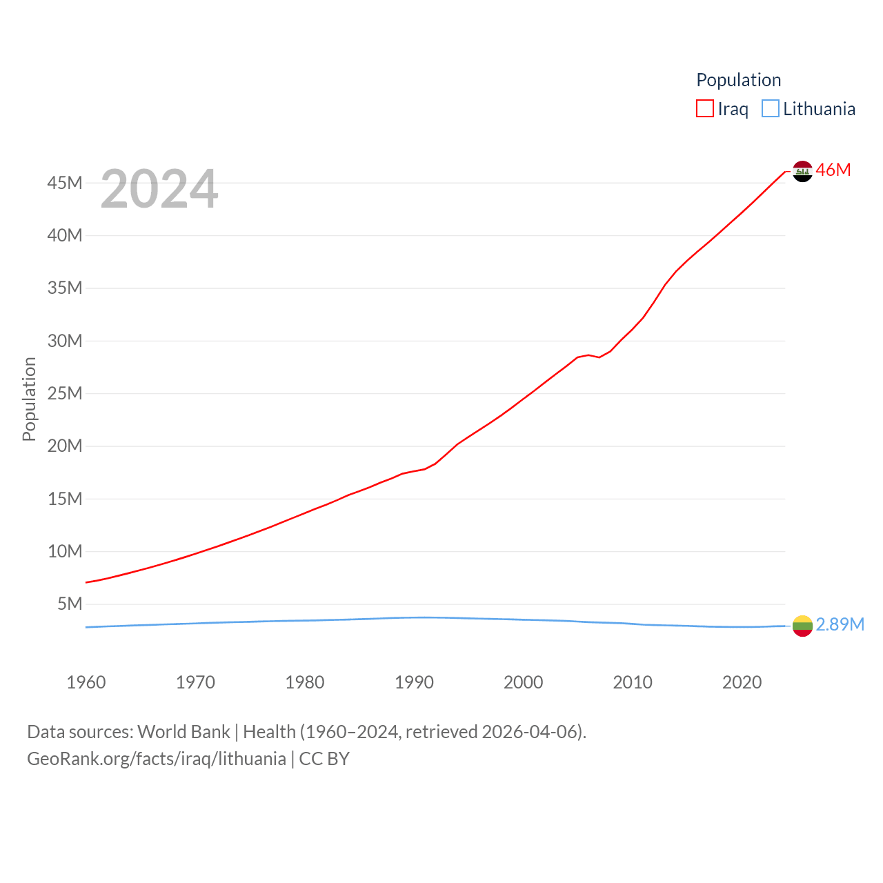 Iraq has a population of 46M (ranked 34/197), compared with 2.89M in Lithuania (ranked 137/197). Iraq's land area is 167,619 sq mi versus 24,170 sq mi for Lithuania (ranked 57th vs. 120th).