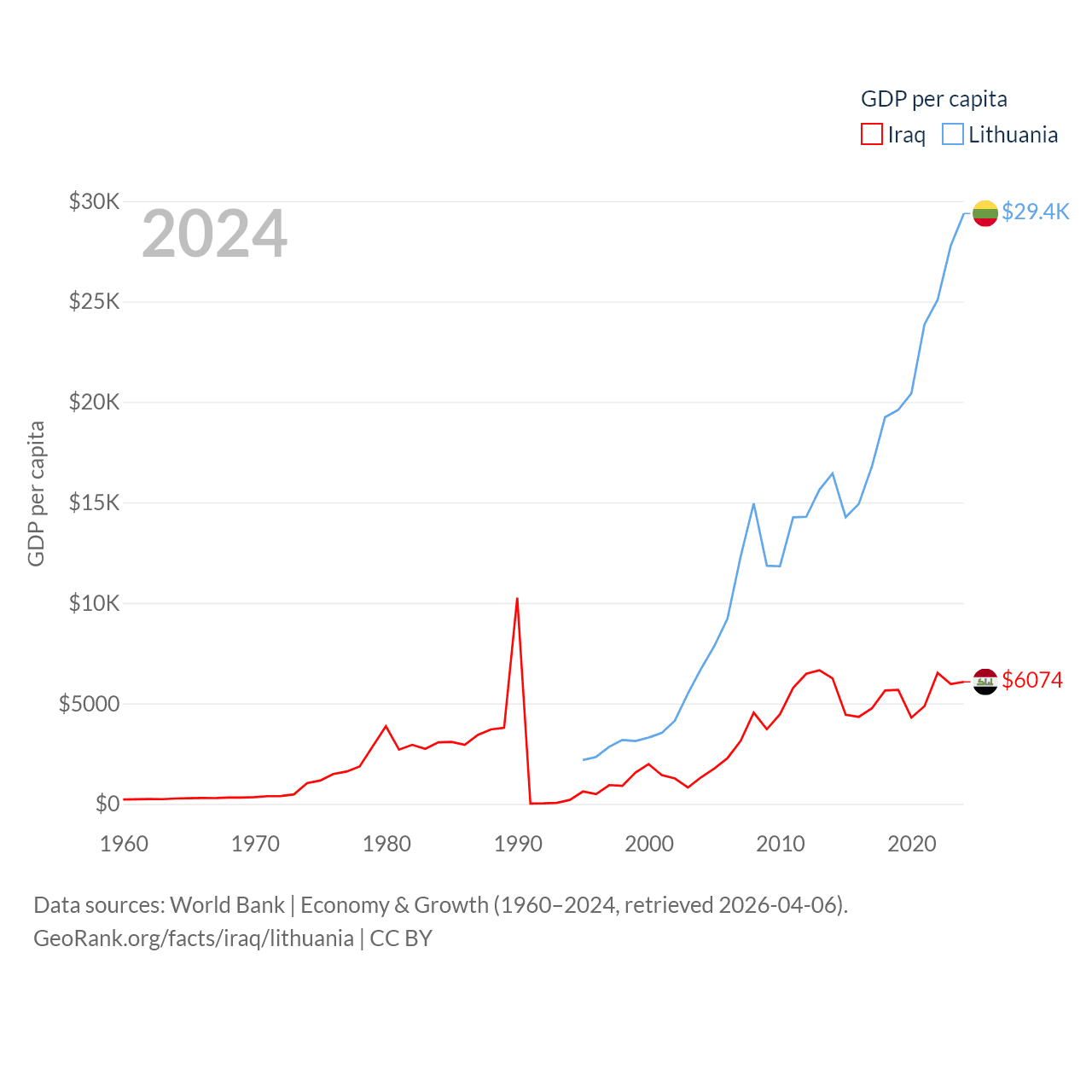 By GDP, Iraq ranks 50/197 ($280B) and Lithuania ranks 79/197 ($84.9B). By GDP per capita, Iraq ranks 113/197 ($6,074), while Lithuania ranks 43/197 ($29,384).
