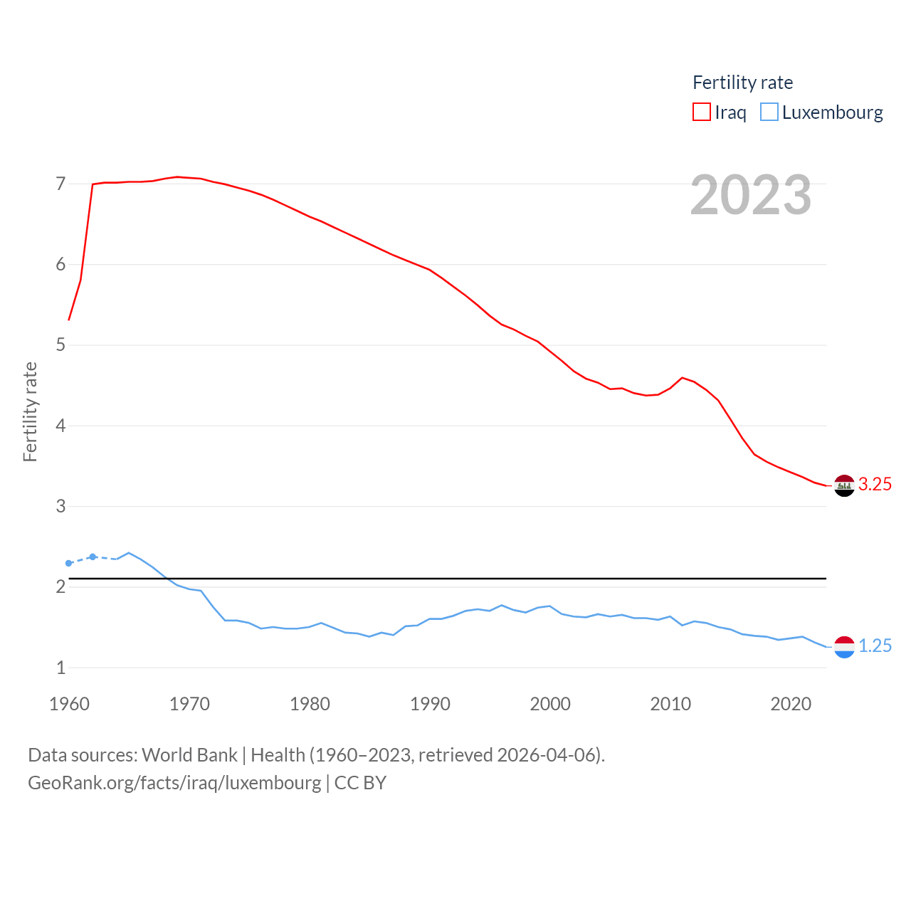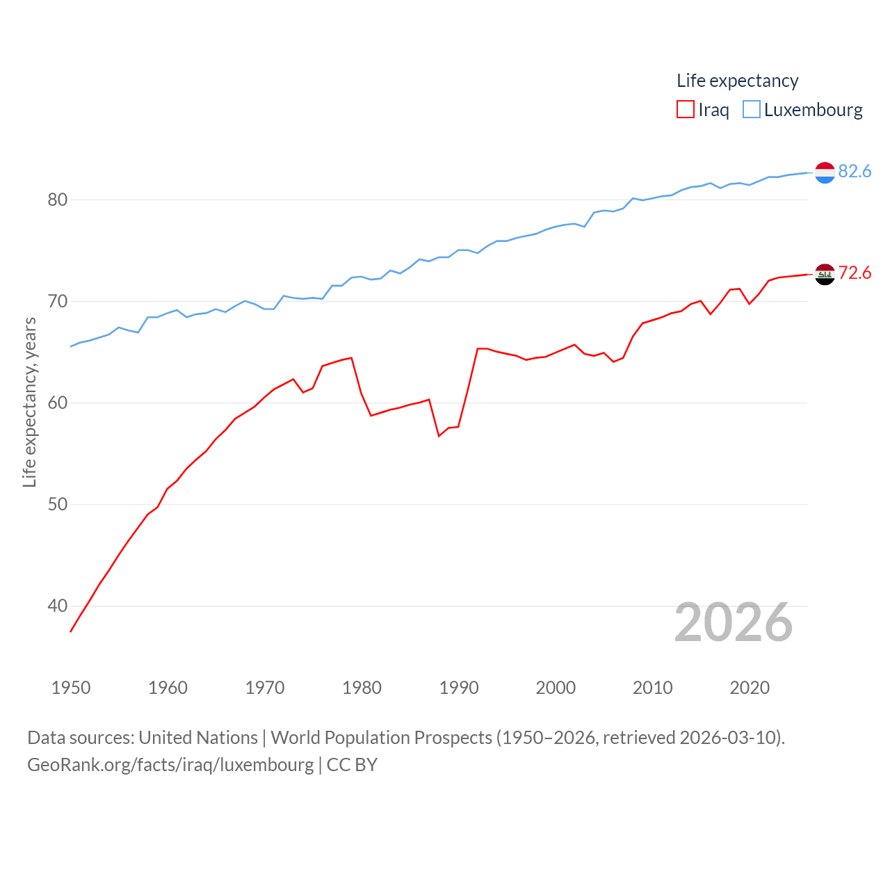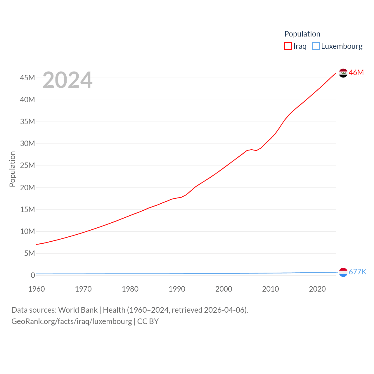 Iraq has a population of 46M (ranked 34/197), compared with 677K in Luxembourg (ranked 164/197). Iraq's land area is 167,619 sq mi versus 994 sq mi for Luxembourg (ranked 57th vs. 169th).