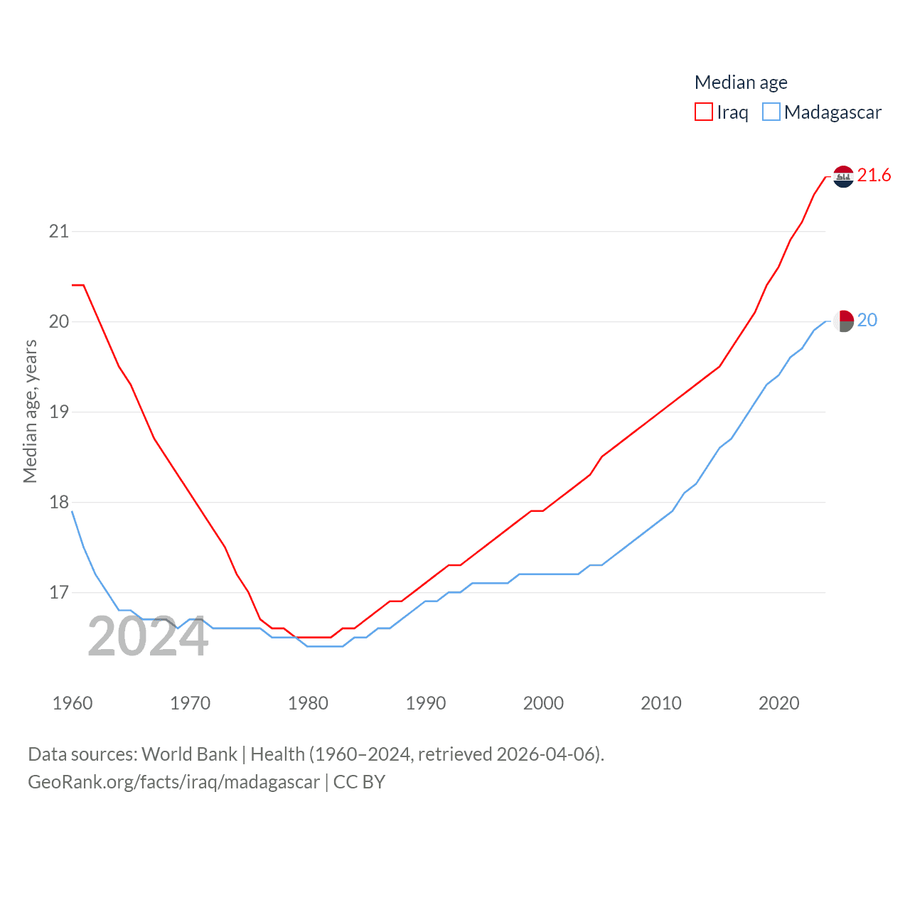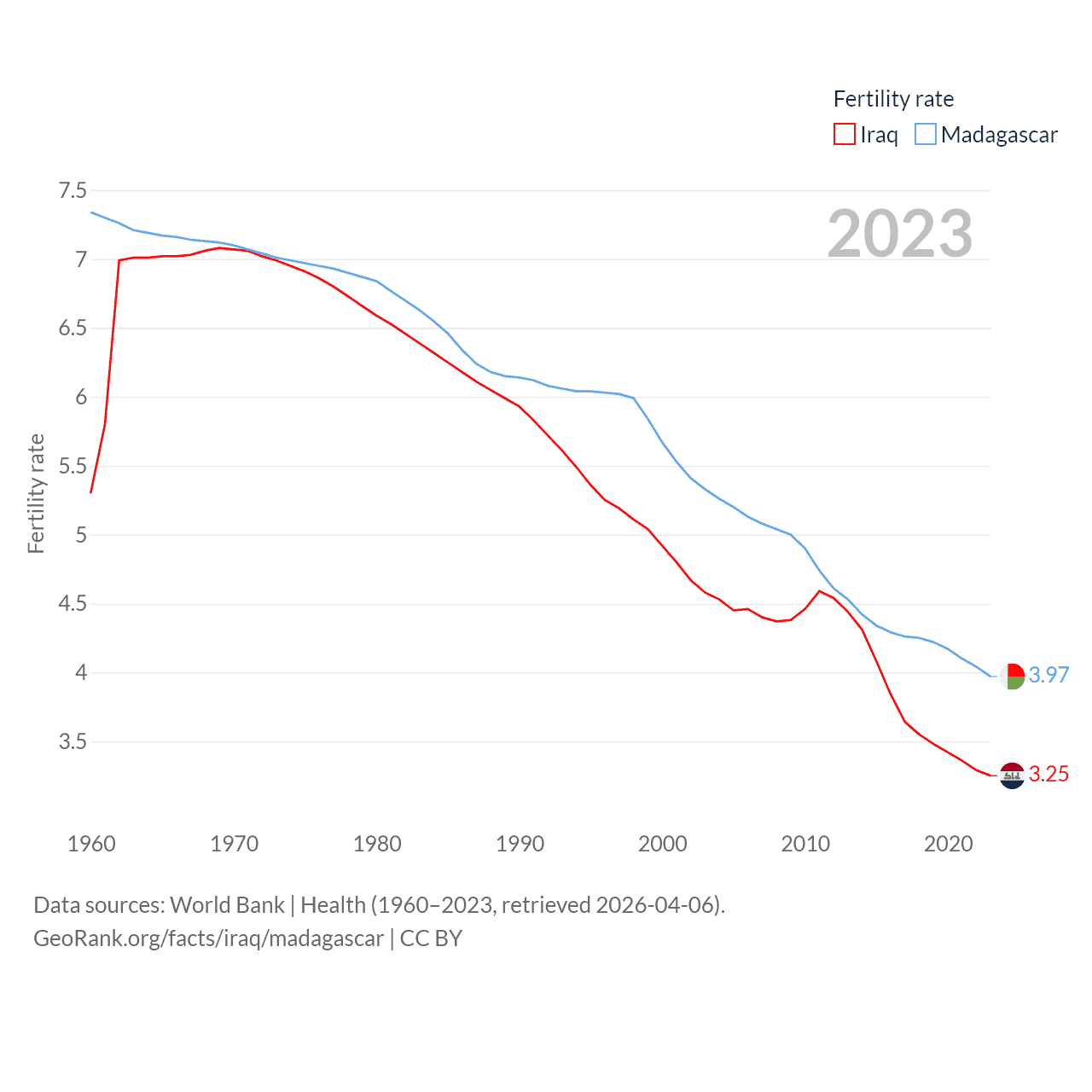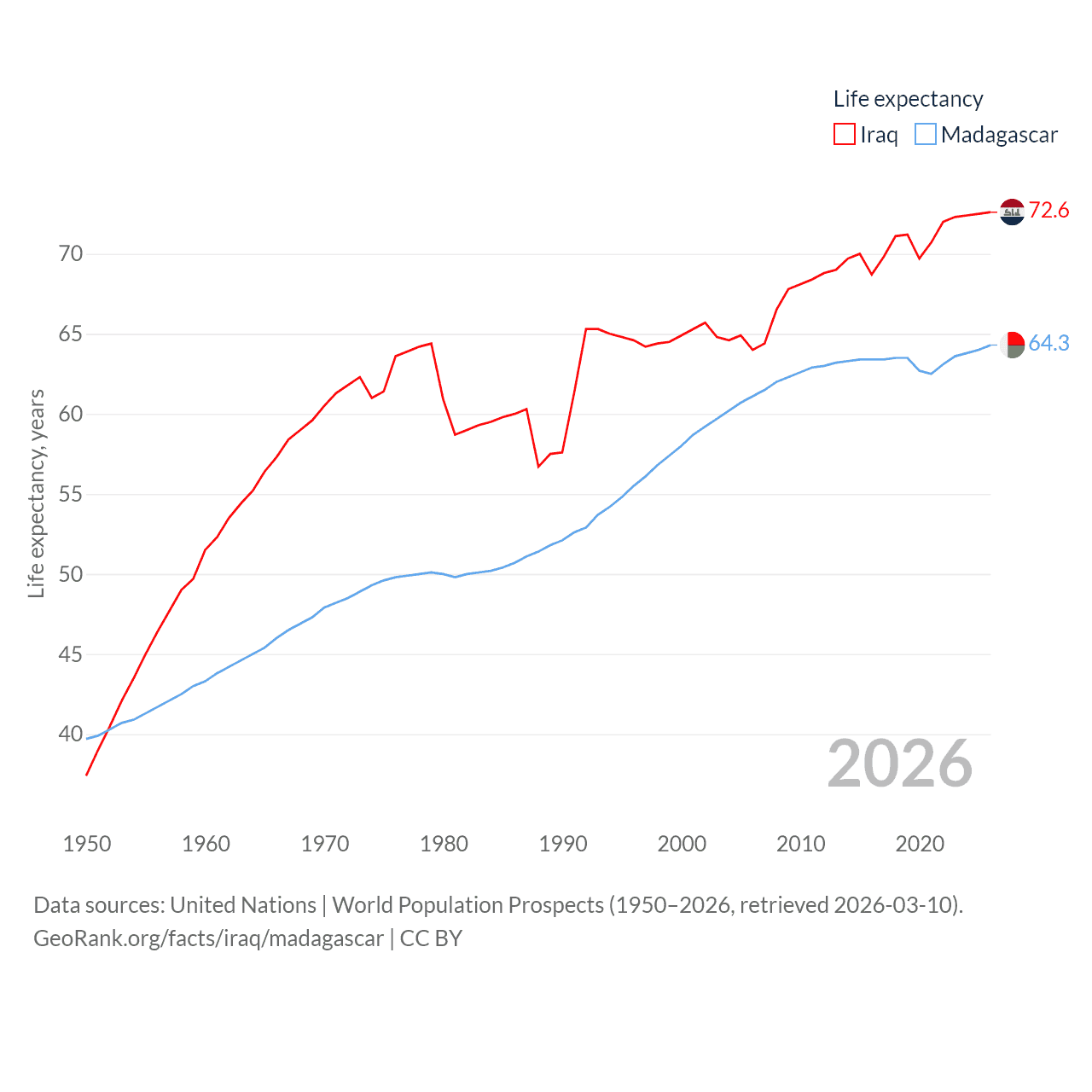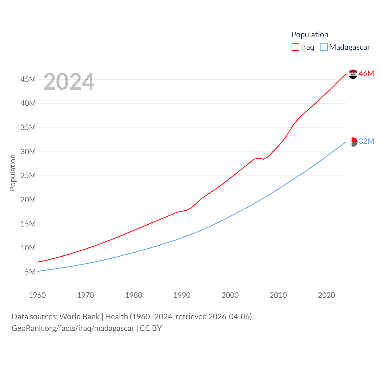 Iraq has a population of 46M (ranked 34/197), compared with 32M in Madagascar (ranked 49/197). Iraq's land area is 167,619 sq mi versus 224,634 sq mi for Madagascar (ranked 57th vs. 44th).