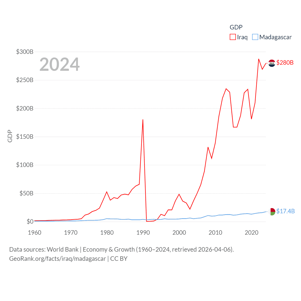By GDP, Iraq ranks 50/197 ($280B) and Madagascar ranks 136/197 ($17.4B). By GDP per capita, Iraq ranks 113/197 ($6,074), while Madagascar ranks 193/197 ($545).